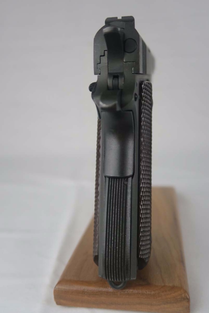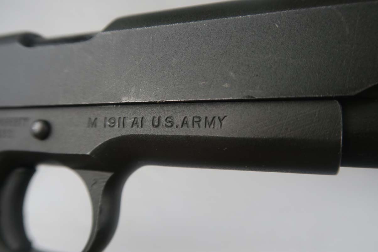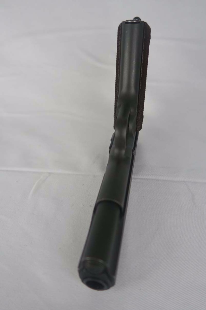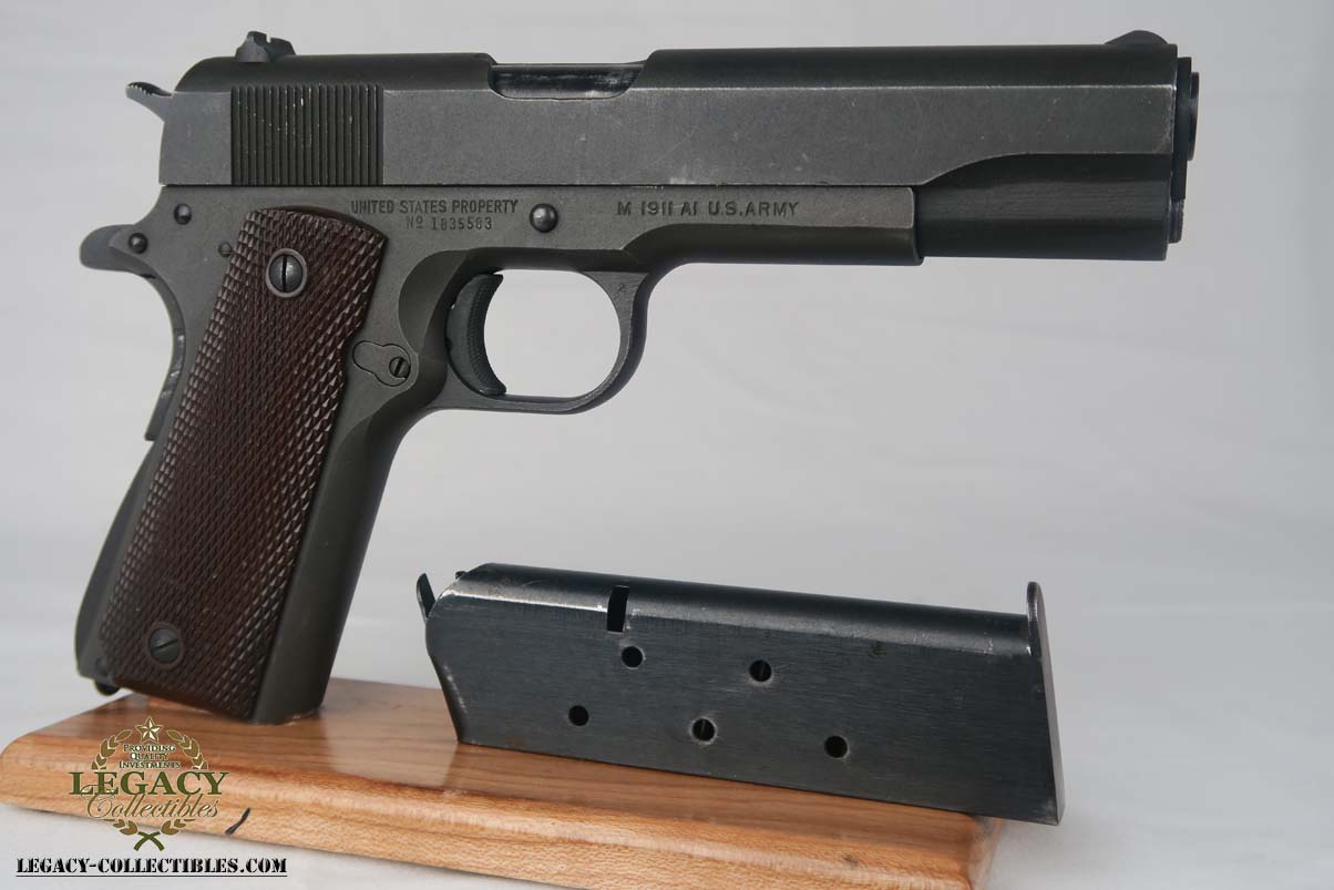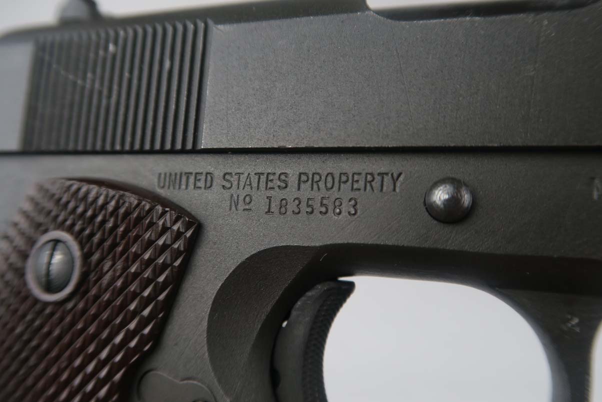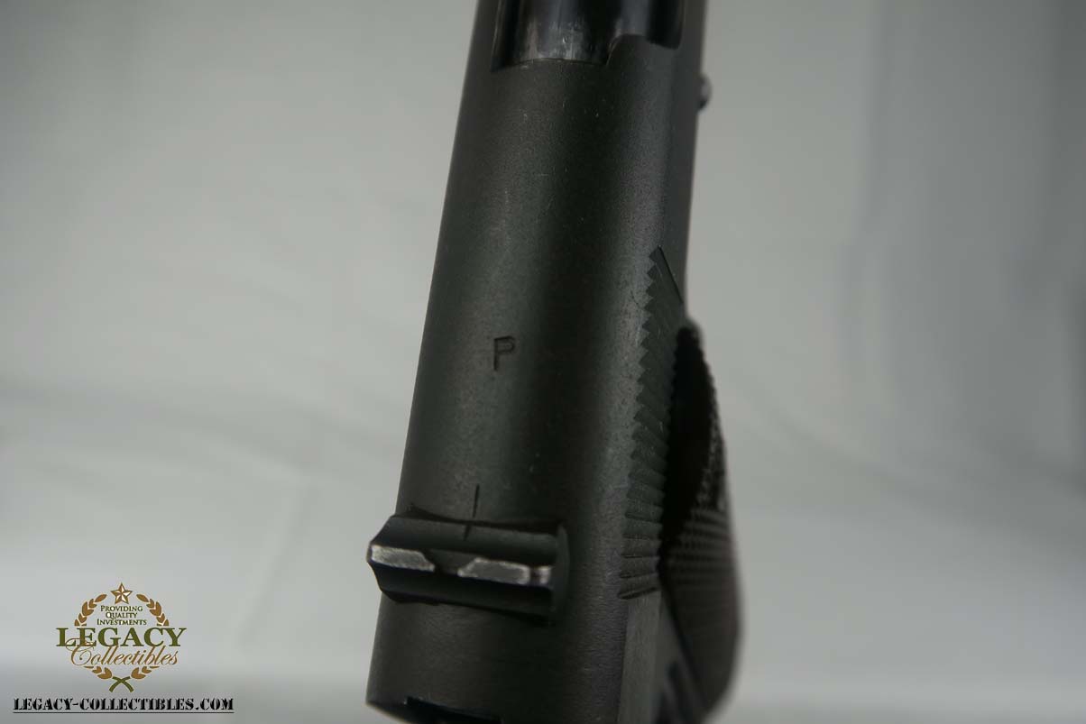 4/28/17 – This is an all-original and correct 1911 manufactured by Ithaca Gun Co. in 1944, for use by the American army during WW2. The finish rates at about 98-99%, with only slight high-edge wear on a few of the edges. It is properly marked with a P proof on the slide and frame, as well as FJA inspector’s stamp on the frame. Crossed cannons cartouche can be found on the right side of frame. Correct ‘HS’ marked barrel, Risdon magazine, and flawless grips. Bore is excellent, I’d rate it a 9/10.