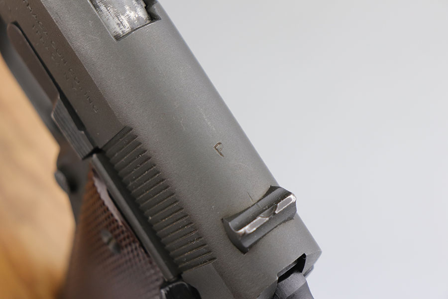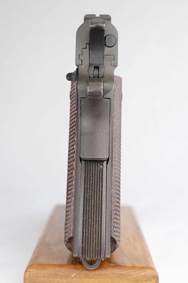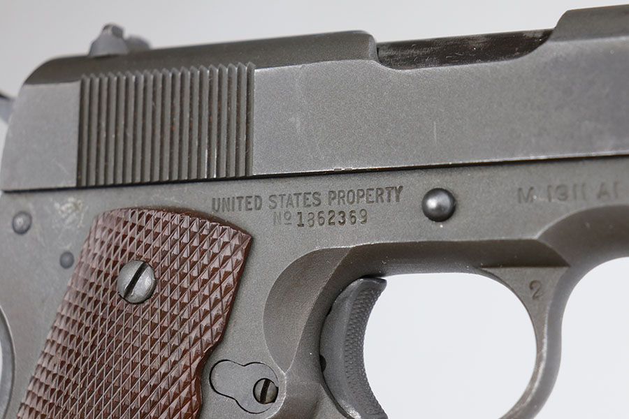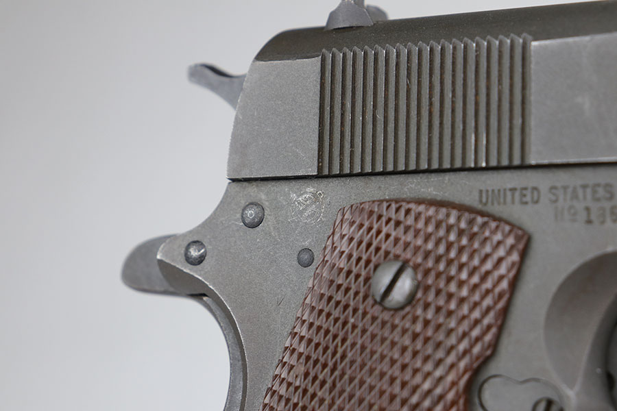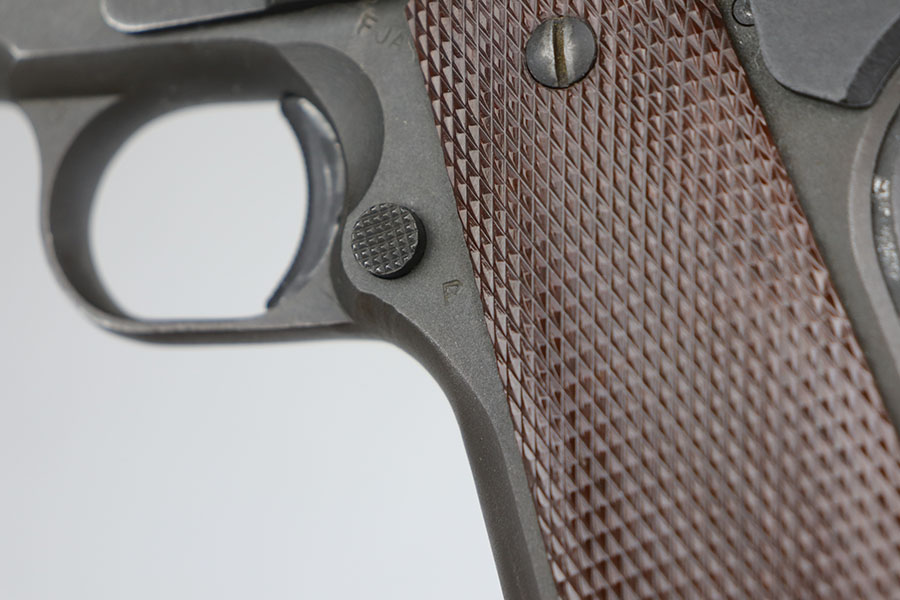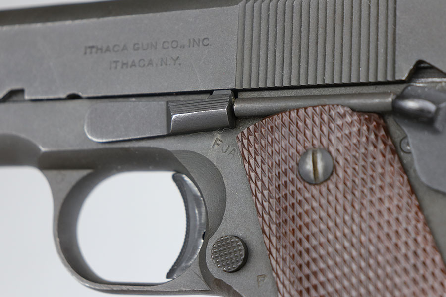 6/28/22 – This is a near-mint Ithaca 1911A1 from early 1945. It’s all original and correct with 98-99% of the original finish remaining. There’s minor high edge thinning on the slide, and a bit of thinning on the trigger guard. Crossed cannons cartouche on right side of frame with FJA inspector mark on left side. Flannery barrel with excellent bore. ‘L’ marked magazine.