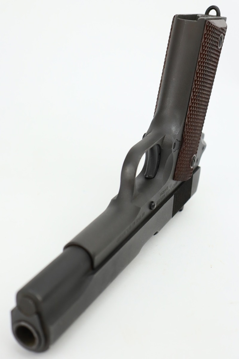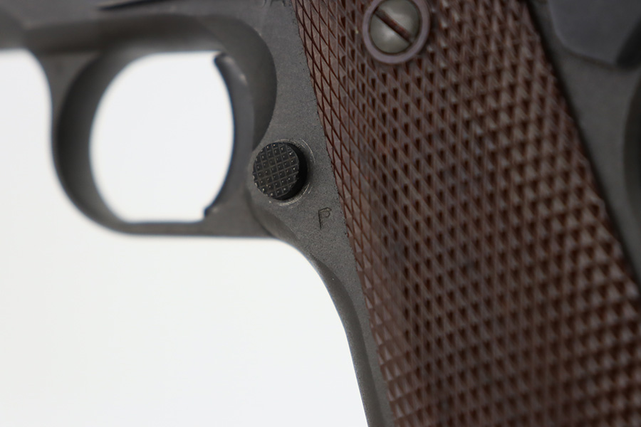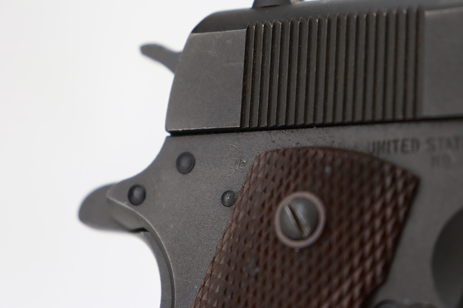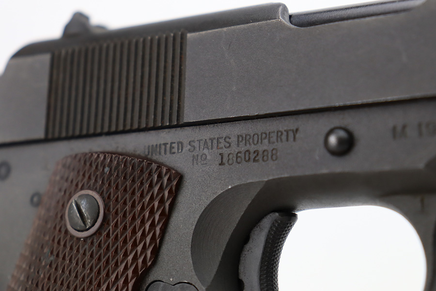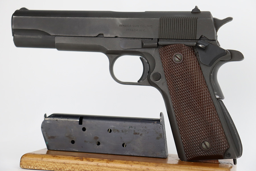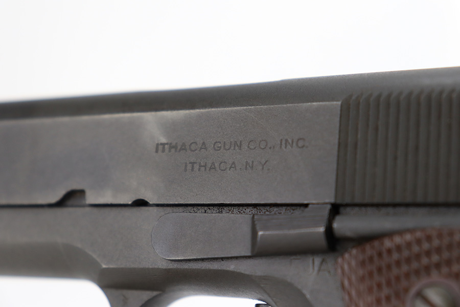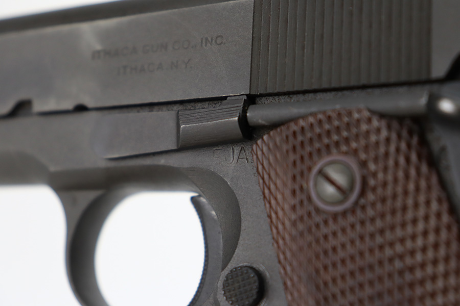 12/26/23 – This is a near-mint Ithaca 1911A1 issued to the US military in 1944. It is “United States Property” marked, has the proper FJA initials, and has a cross-canon military cartouche. Correct Flannery barrel. It has retained nearly all of its finish with just hints of high edge wear. Fitted with period-correct reddish plastic grips and comes with an “L” marked magazine. Minty bore. The hold-open does not work properly with this magazine.