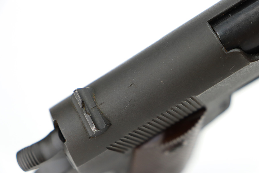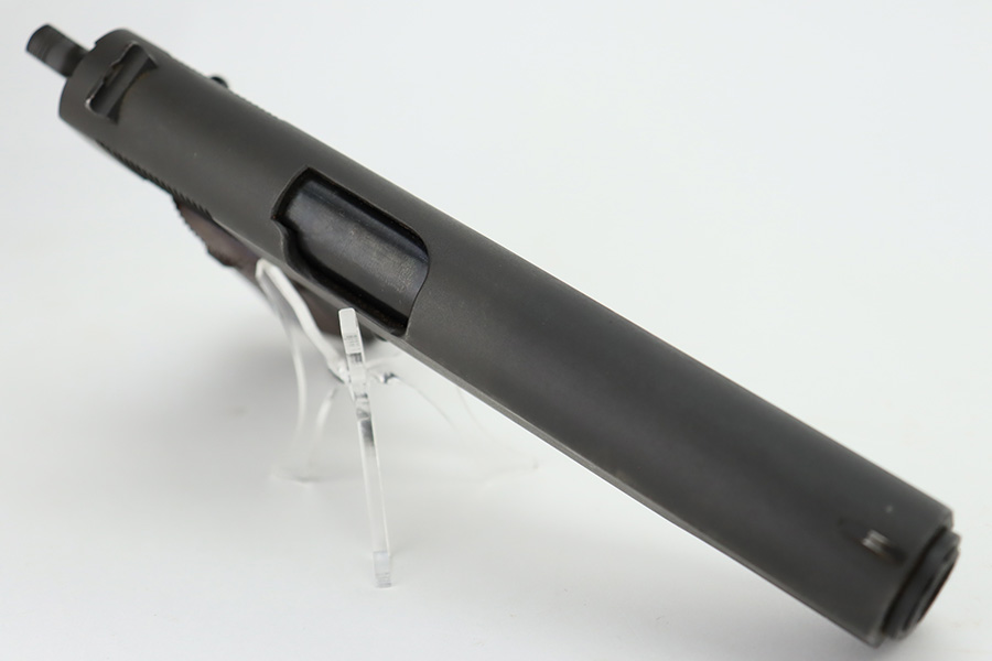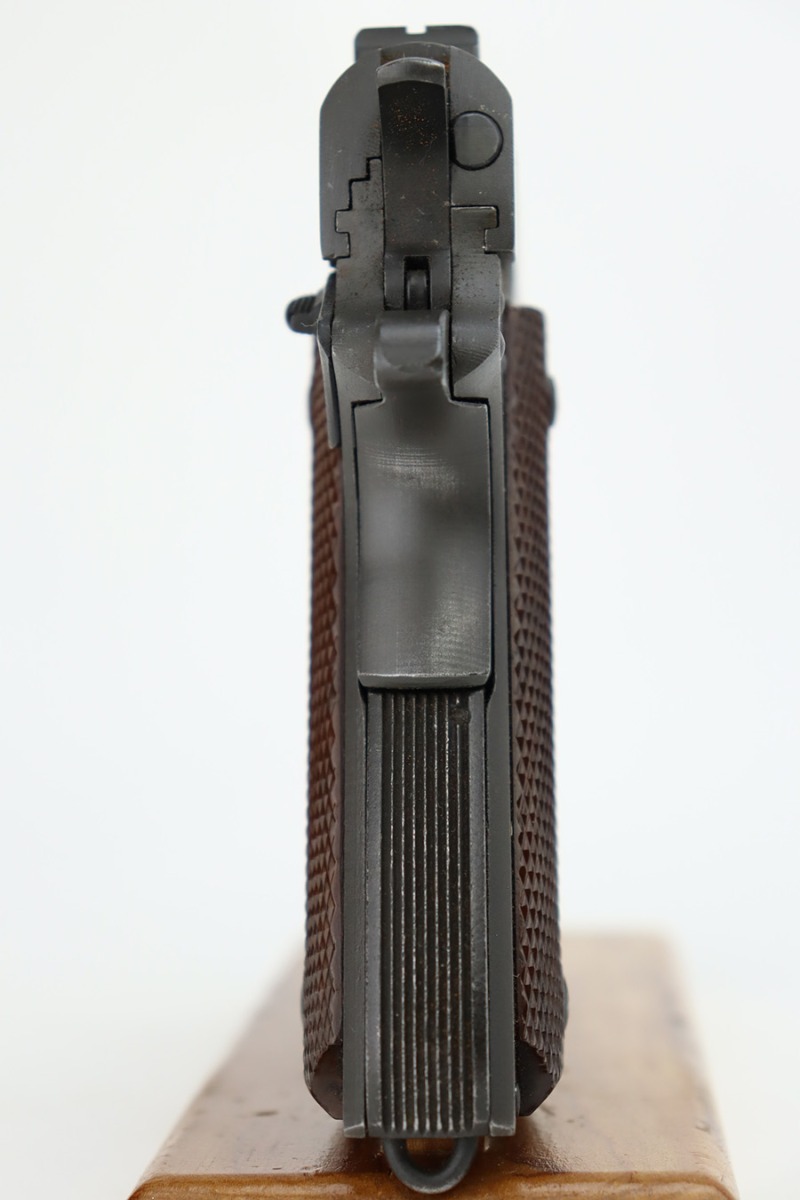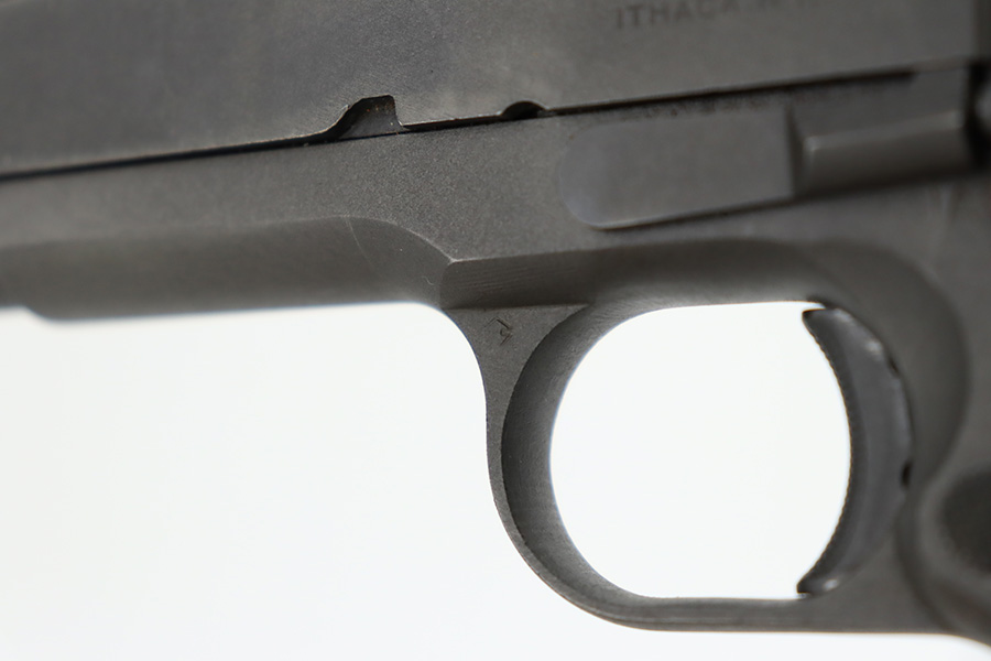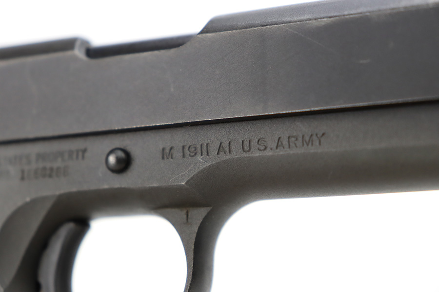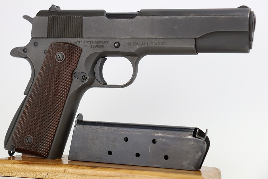 12/26/23 – This is a near-mint Ithaca 1911A1 issued to the US military in 1944. It is “United States Property” marked, has the proper FJA initials, and has a cross-canon military cartouche. Correct Flannery barrel. It has retained nearly all of its finish with just hints of high edge wear. Fitted with period-correct reddish plastic grips and comes with an “L” marked magazine. Minty bore. The hold-open does not work properly with this magazine.