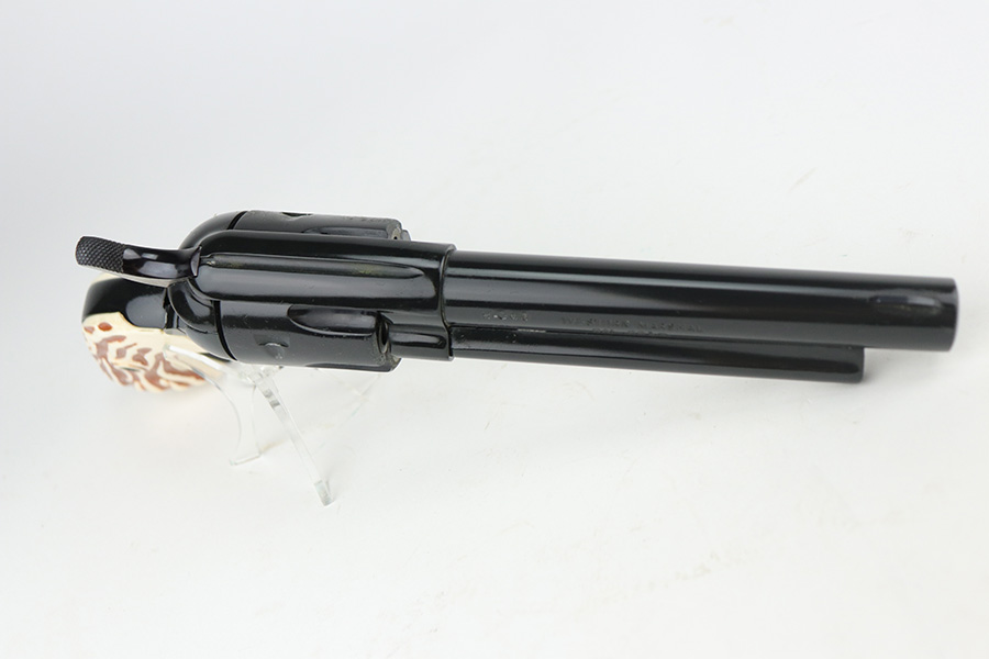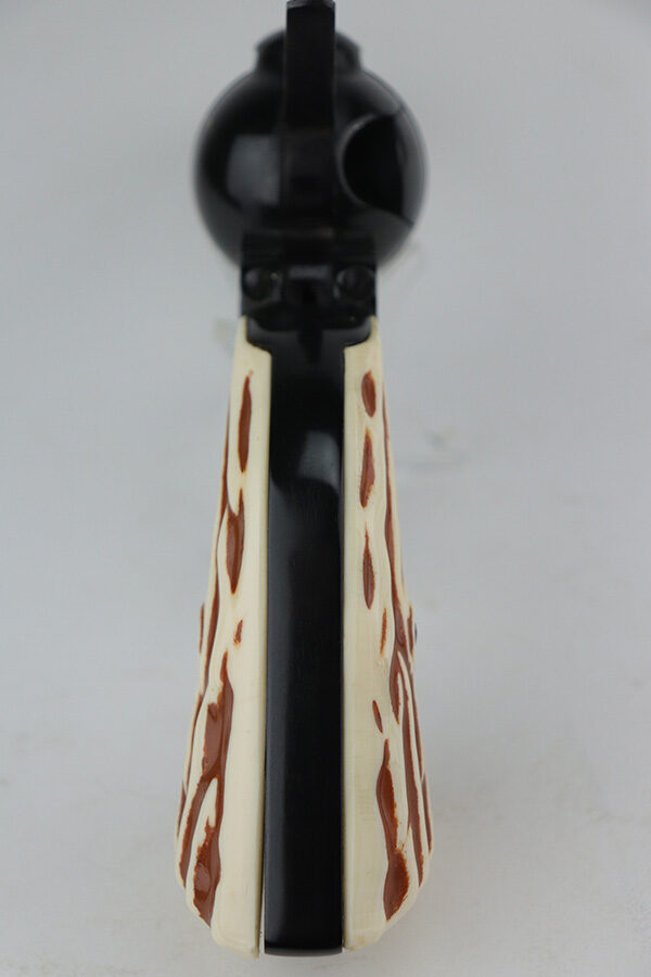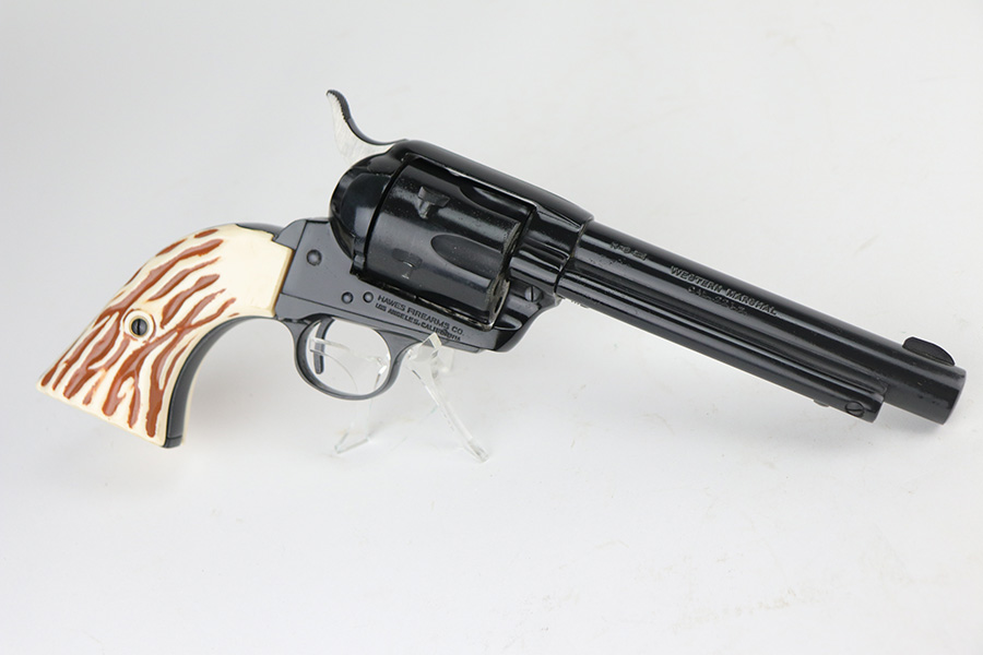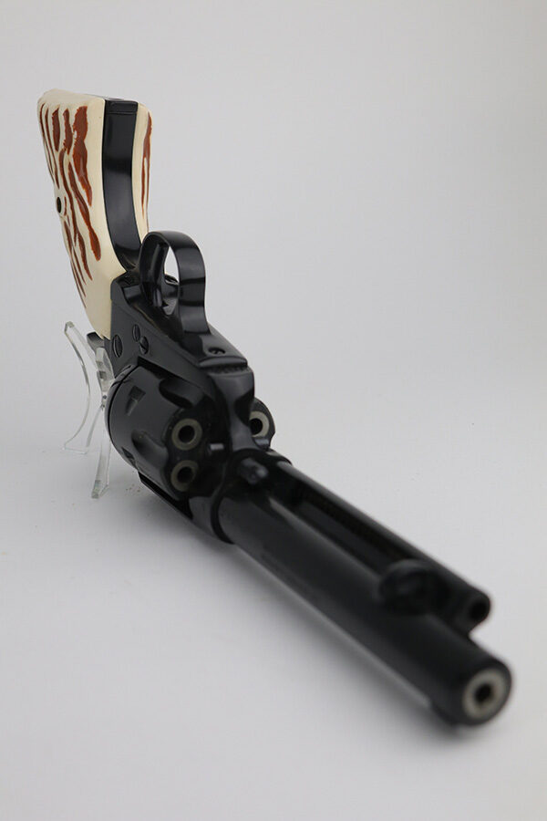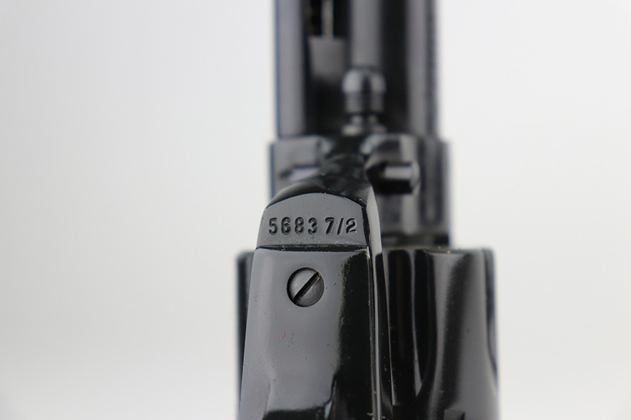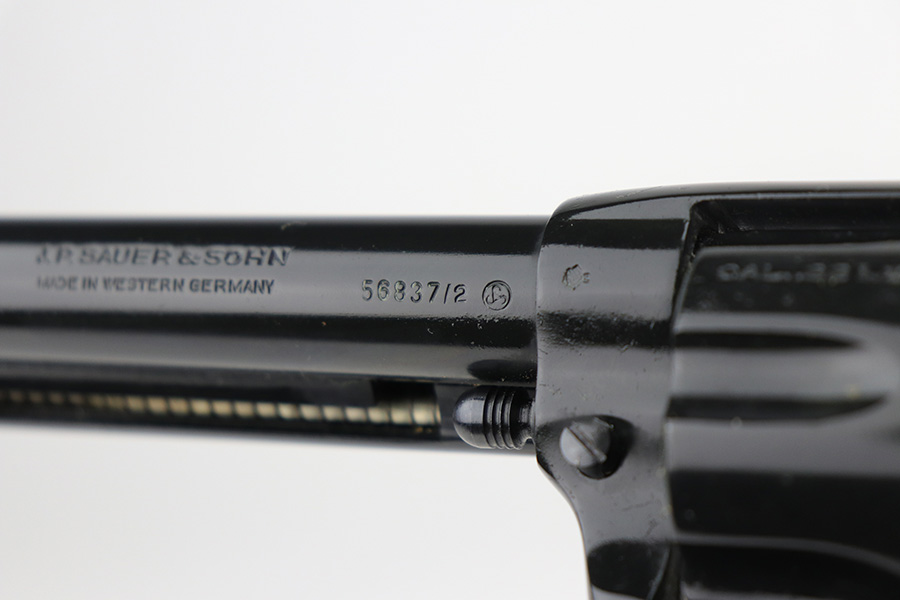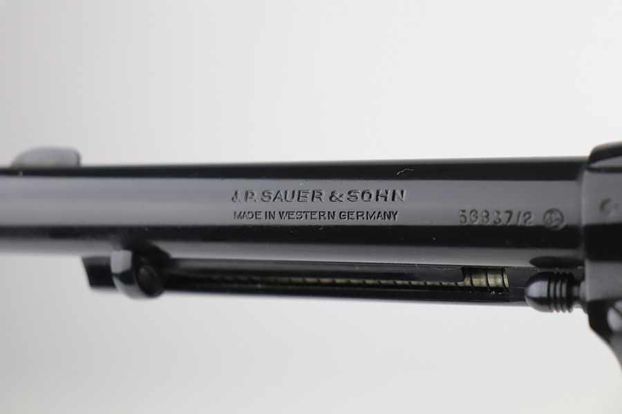 9/1/21 – This is a near-mint example of a JP Sauer Western Marshall revolver chambered in .22 LR. 5.5 inch barrel. It is all matching and has the proper West German proofs. It comes with excellent faux stag grips and has retained about 99% of its original finish. While there is essentially no finish loss, there is spotty freckling on the cylinder. The cylinder is tight and the action is smooth. The bore is excellent – shiny with strong rifling.