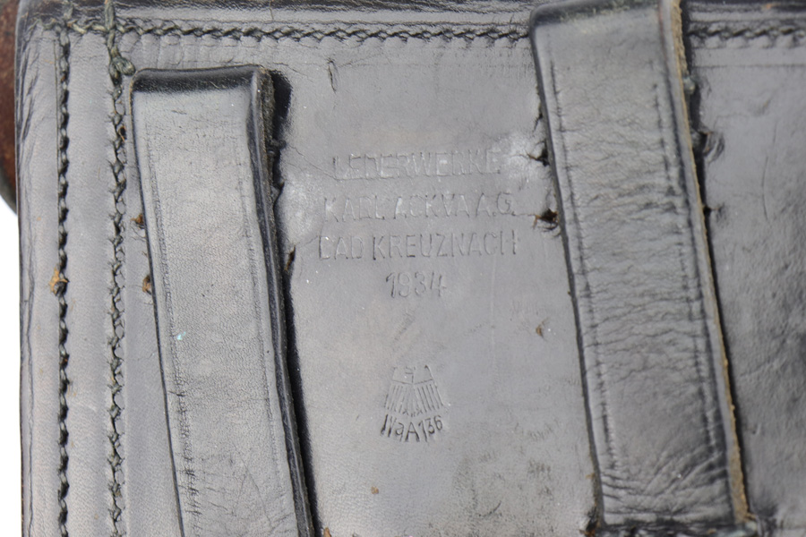 3/11/19 – This is an original, minty condition K Date Luger holster. These early 1934 dated holsters are fairly scarce and desirable. This particular holster is much nicer than most from the time period, with very clean leather and stitching. The leather has normal pliability but is extremely clean with only minor wrinkles. The back leather is maker stamped and dated with a waffen proof, all of which are clearly visible with minor fading. The stitching is original and in tact, but there are two lines of empty stitching below the upper portion of the belt loops. This could have been a factory error, as it’s only on the upper portion of the loop and on both loops.