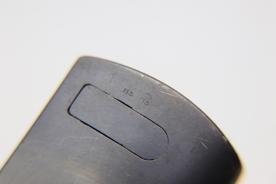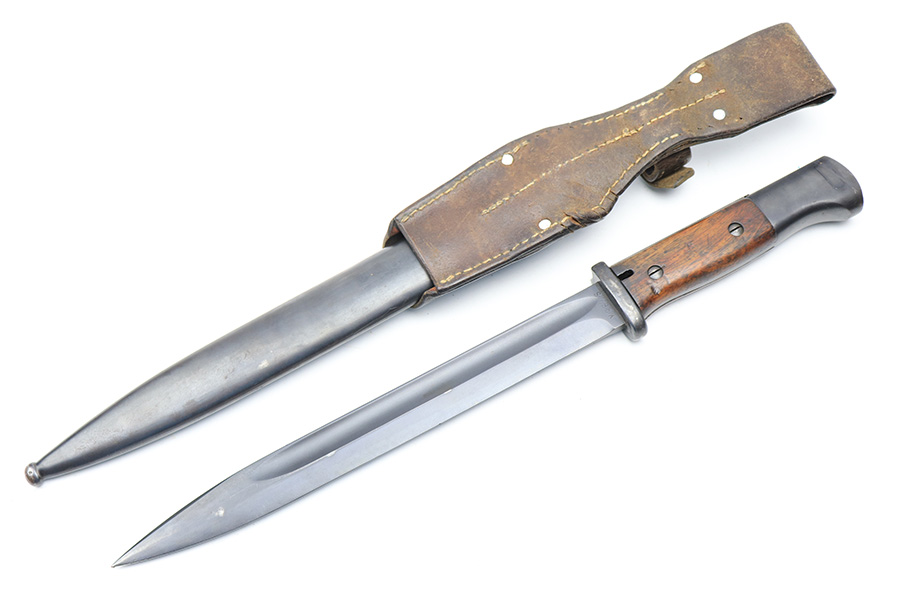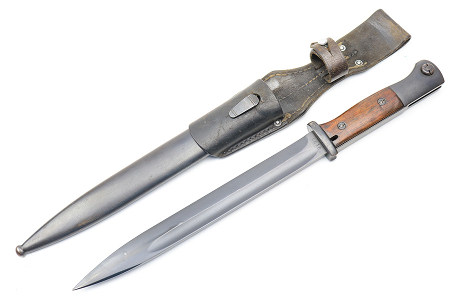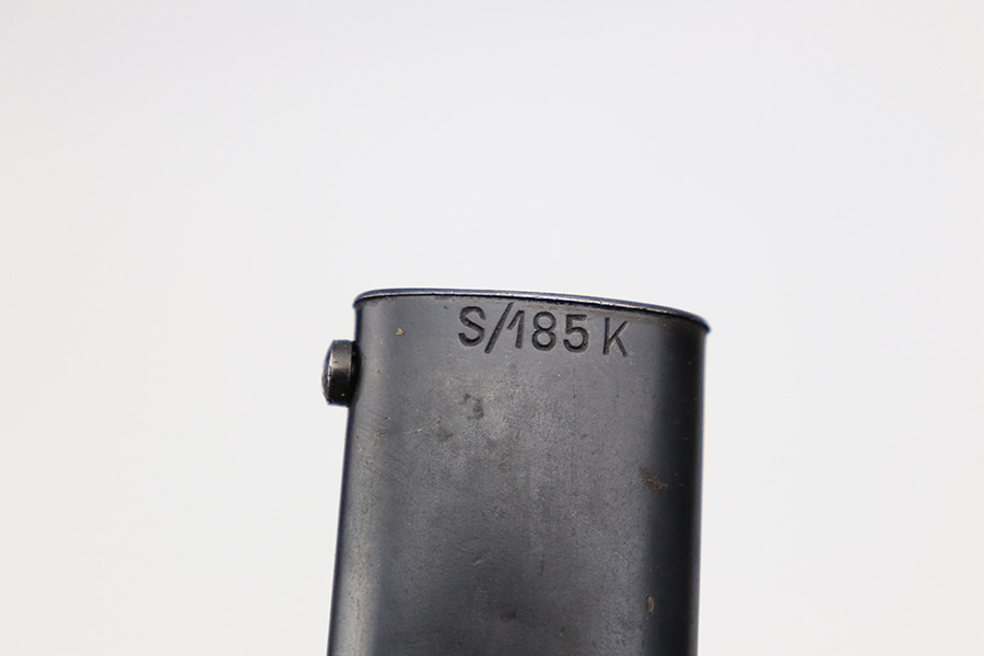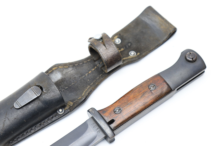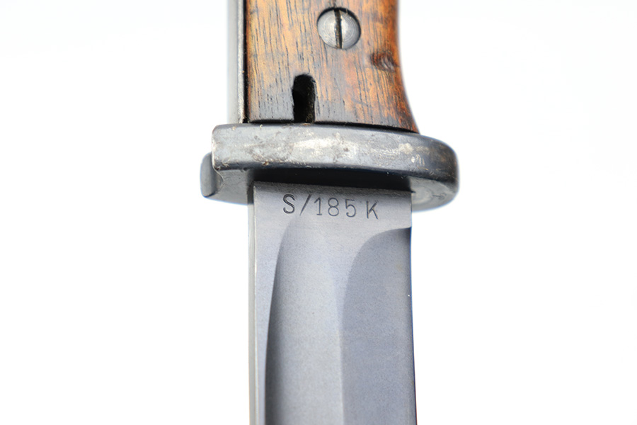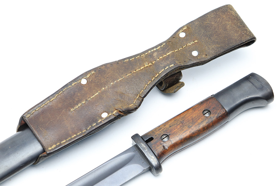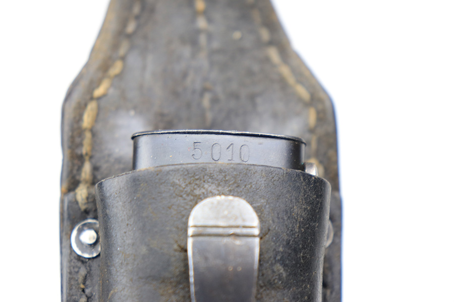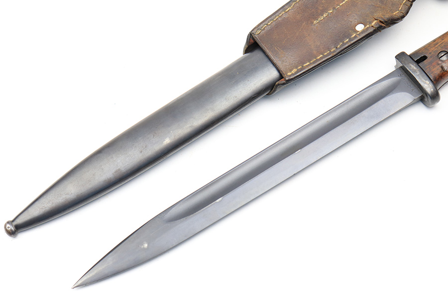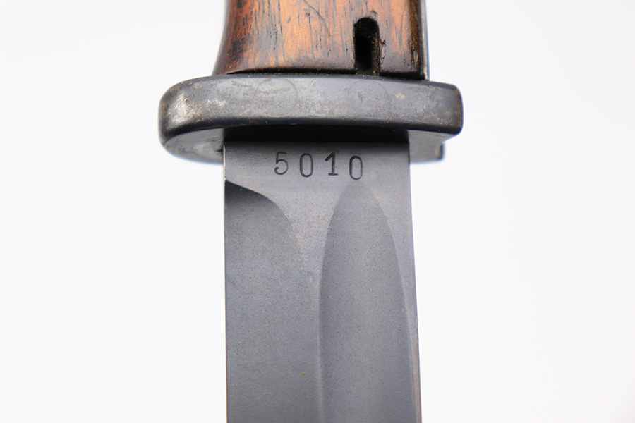 3/24/22 – This is an excellent, minty example of an early K Date K98 bayonet. The bayonet comes with a matching serial numbered scabbard and a leather frog. The blade has no signs of sharpening and excellent bluing throughout. Amidst the blued finish is some mild surface patina, but this is very minor. The hilt has excellent bluing throughout as well, and rare eagle/115 proof stamps. The wood handles have no cracks or chips. The scabbard is also excellent throughout with no dents or major issues. The frog has some missing stitches and surface wear, but is in good condition.