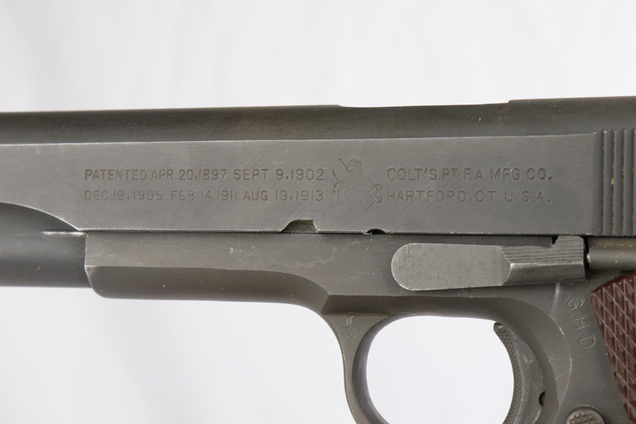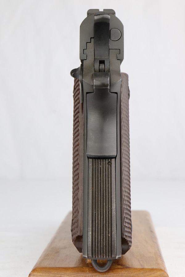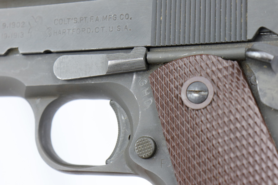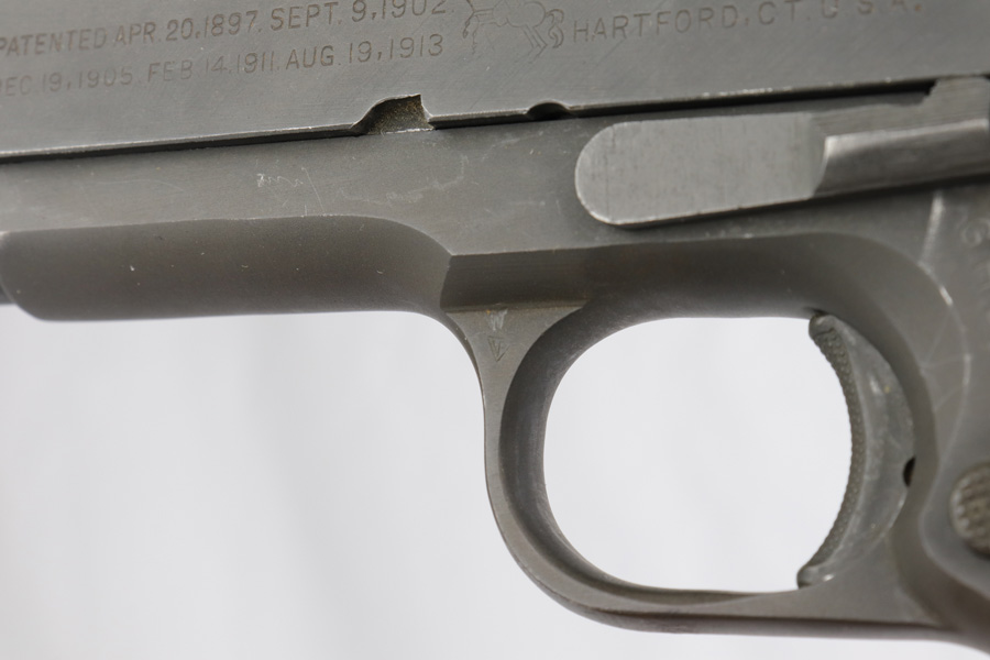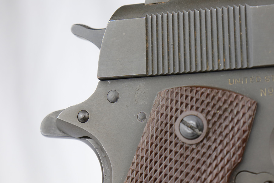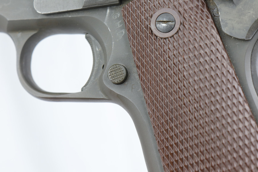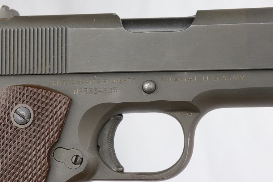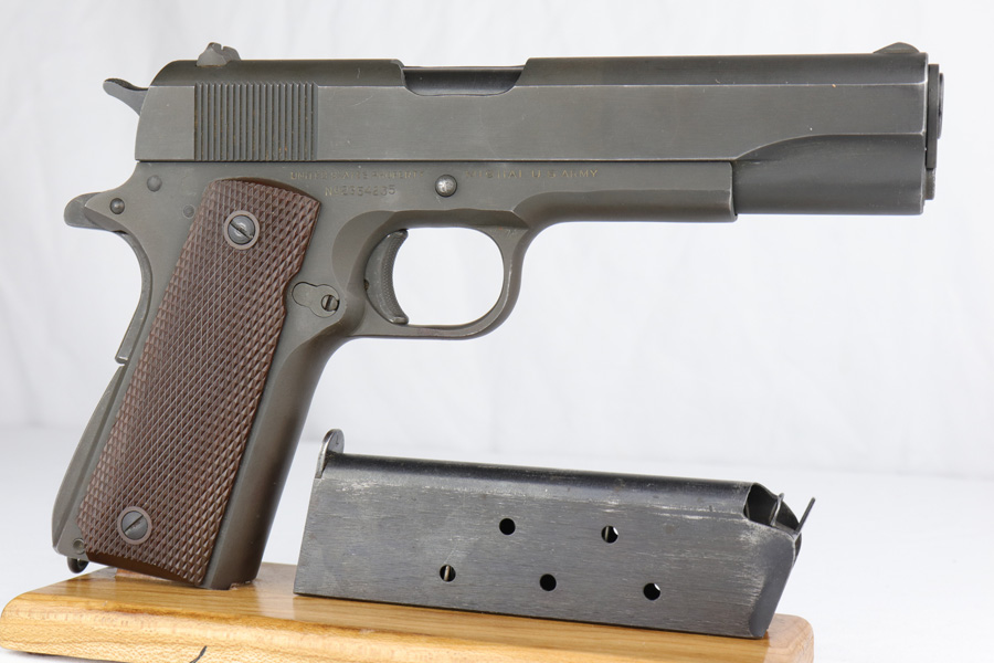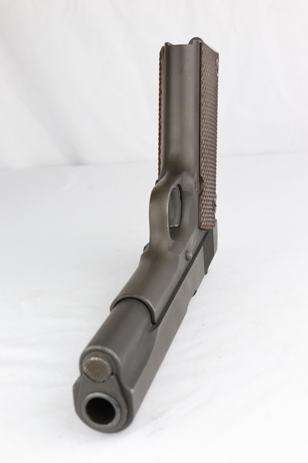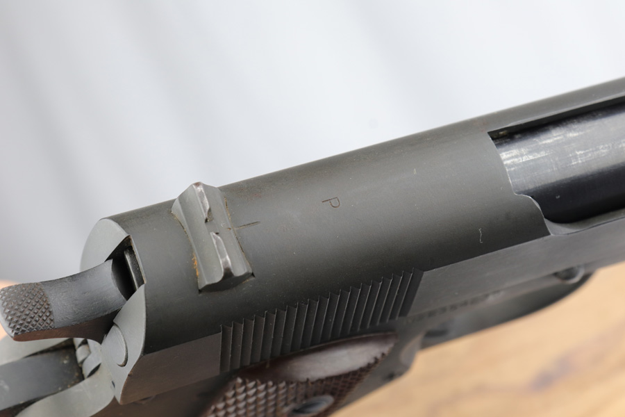 3/11/19 – This is a near-mint Colt M1911A1 from 1945 – one of the last ever issued by Colt for the war efforts. Serial 2368781 was the last produced by Colt, and this serial is 2354xxx. All correct and original with 99% parkerized finish, showing only minor edge and muzzle wear. Proper Colt barrel with small ‘F’ under lug. ‘L’ marked magazine. Bore shows minor frost but otherwise great condition.