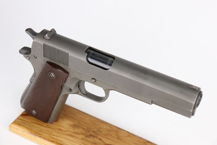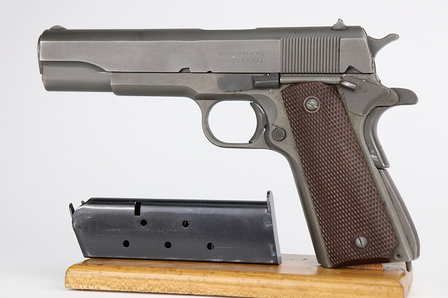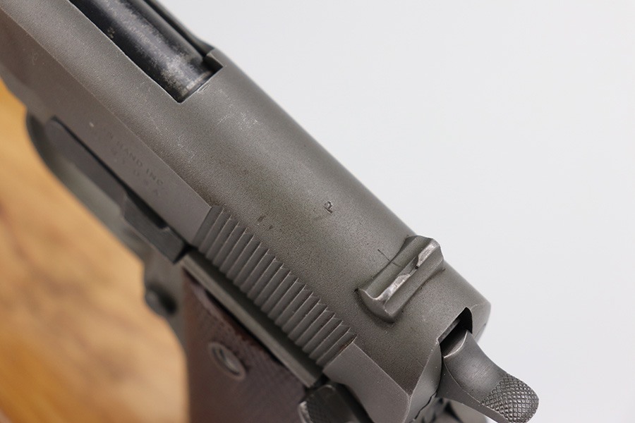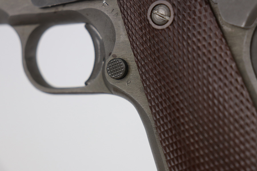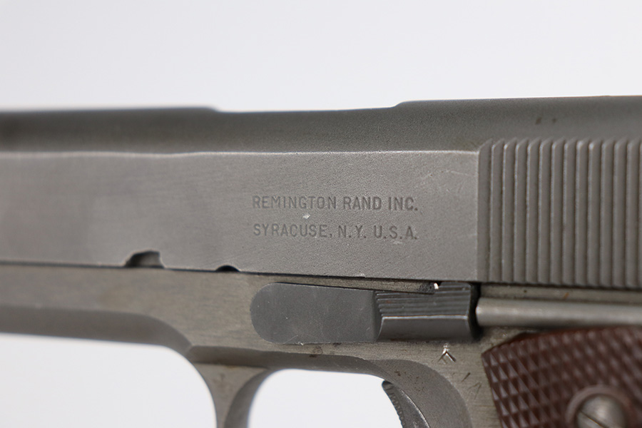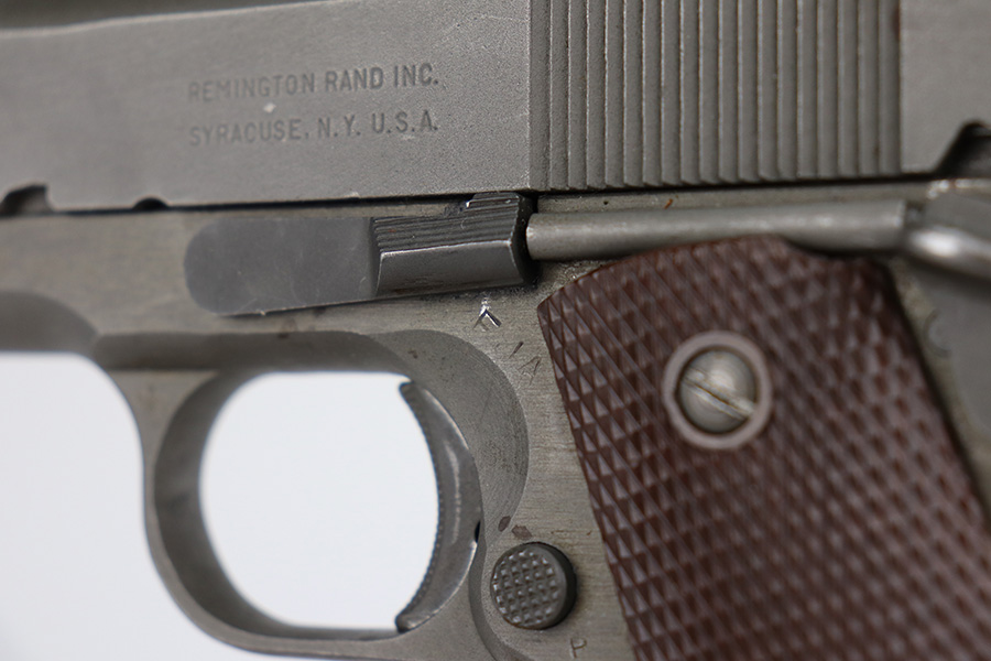 4/30/21 – This is a near-mint example of a Remington Rand Model 1911A1 issued to the US military very late in 1945. The gun is all correct, is “United States Property” marked and has a cross-canon military cartouche. High Standard barrel. The gun has retained about 98% of its original finish. There are just hints of wear on some of the high edges and very minor thinning on the straps. A few small areas of minor discoloration on the left side of the slide. Comes with excellent grips and a period-correct magazine. Excellent bore – shiny with strong rifling.