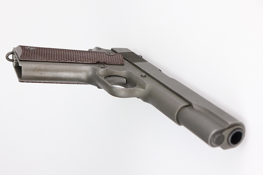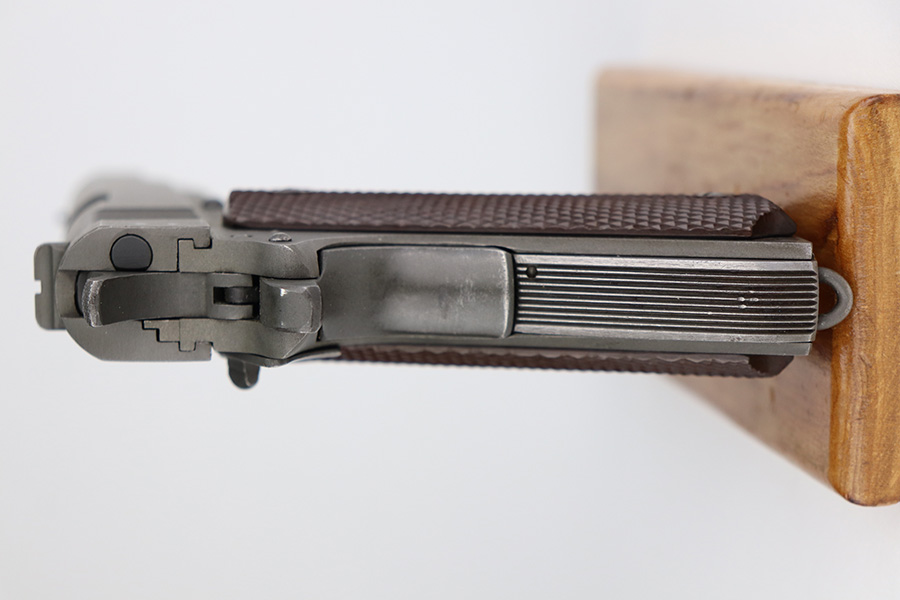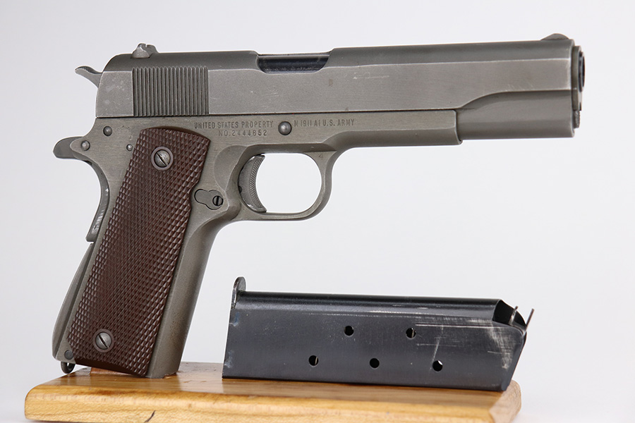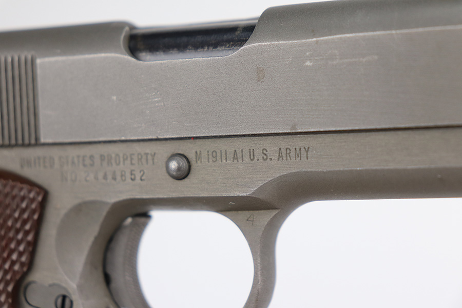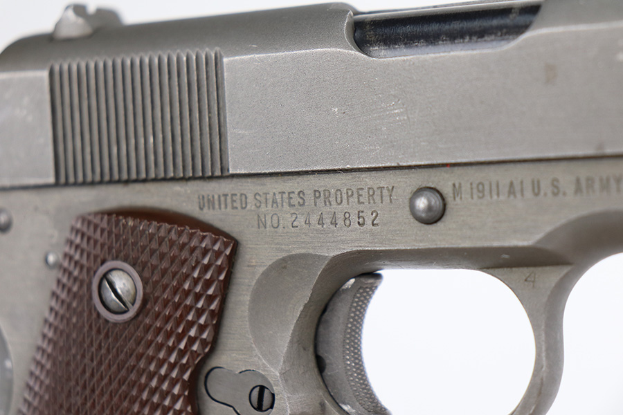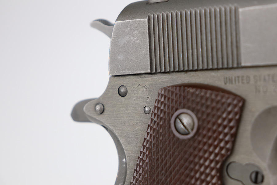 4/30/21 – This is a near-mint example of a Remington Rand Model 1911A1 issued to the US military very late in 1945. The gun is all correct, is “United States Property” marked and has a cross-canon military cartouche. High Standard barrel. The gun has retained about 98% of its original finish. There are just hints of wear on some of the high edges and very minor thinning on the straps. A few small areas of minor discoloration on the left side of the slide. Comes with excellent grips and a period-correct magazine. Excellent bore – shiny with strong rifling.