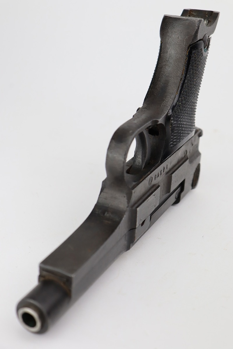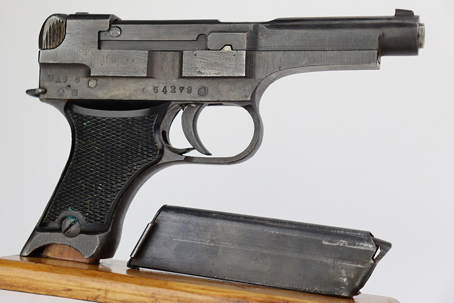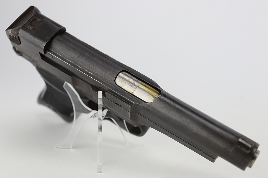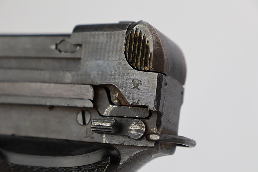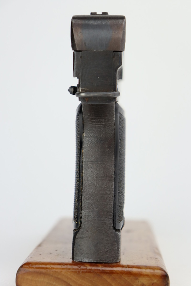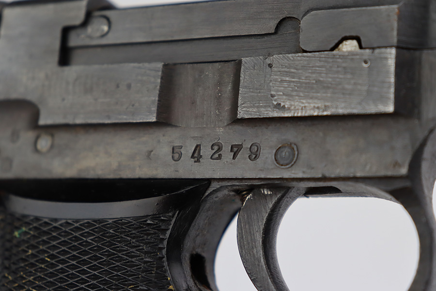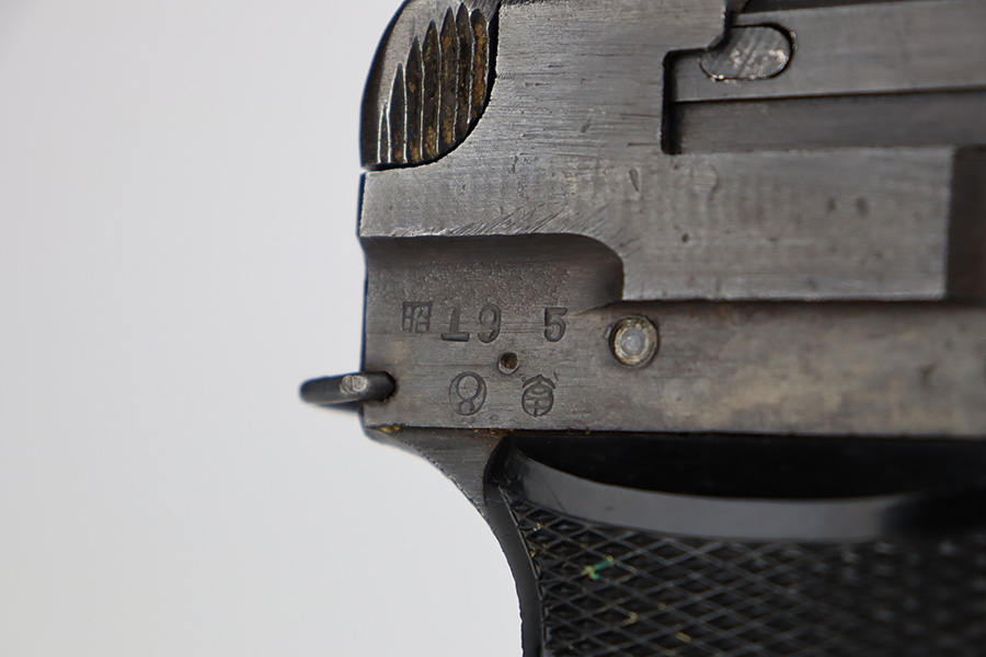 7/10/23 – This is a near-mint example of a late-war Nambu Type 94 issued to the Japanese military in May of 1944. It is all matching and comes with a matching-numbered magazine. However, the numbering appears to be an over-stamp. The gun itself has retained essentially all of its original finish with just a couple of small spots of minor discoloration. Fitted with excellent period-correct black bakelite grips. Mint bore.