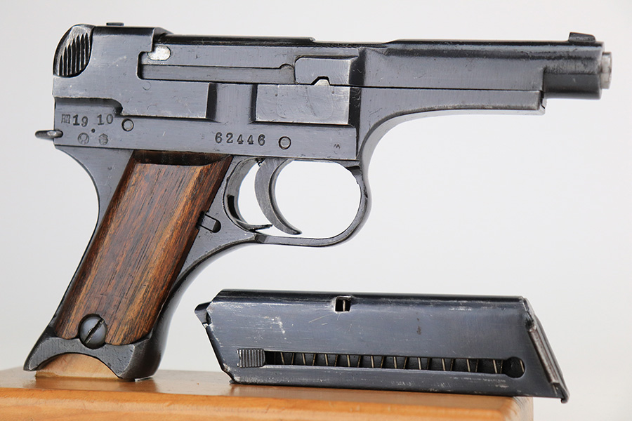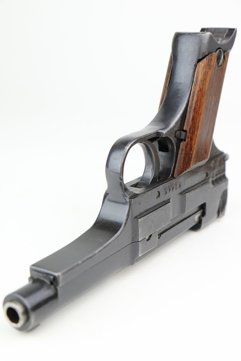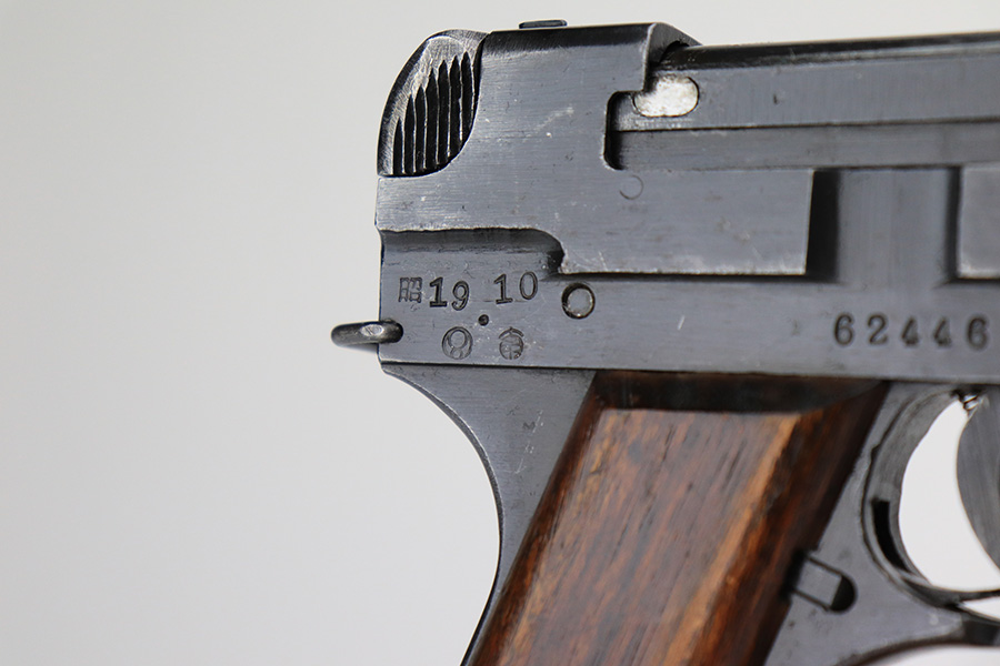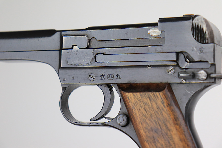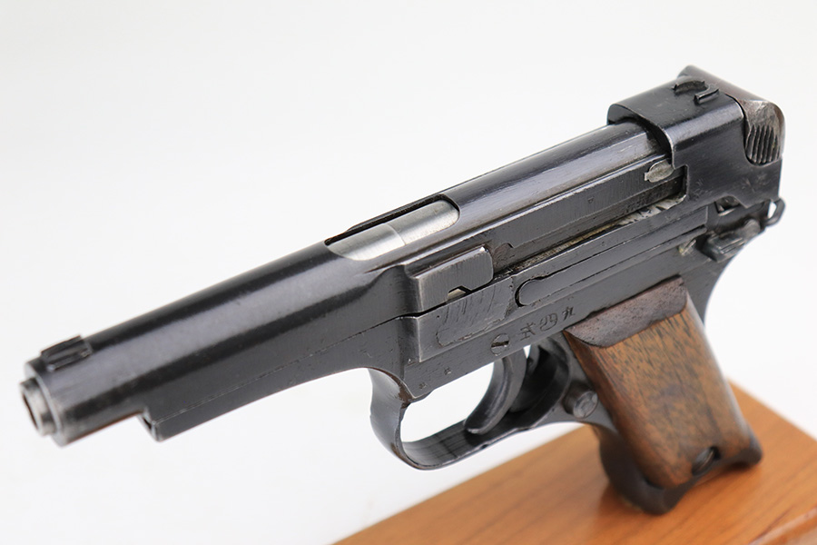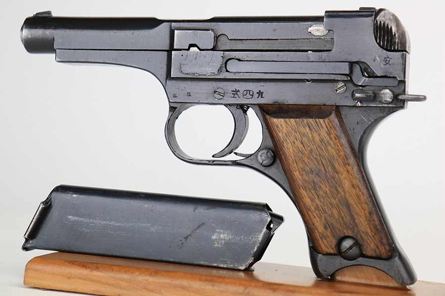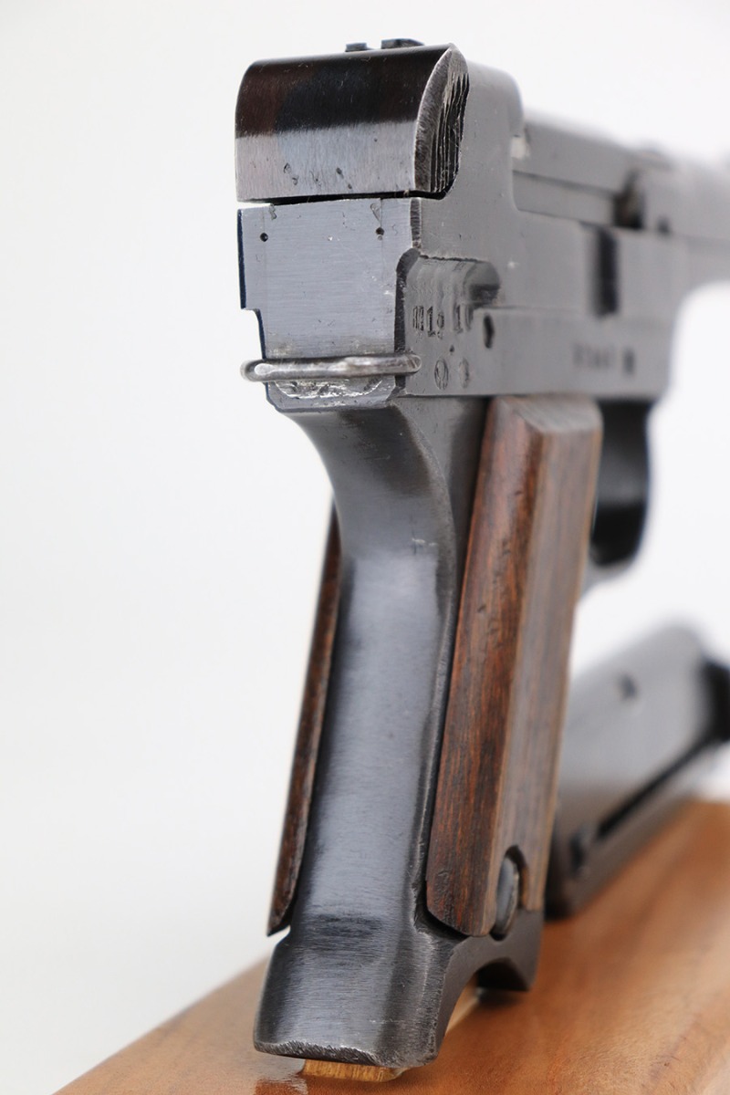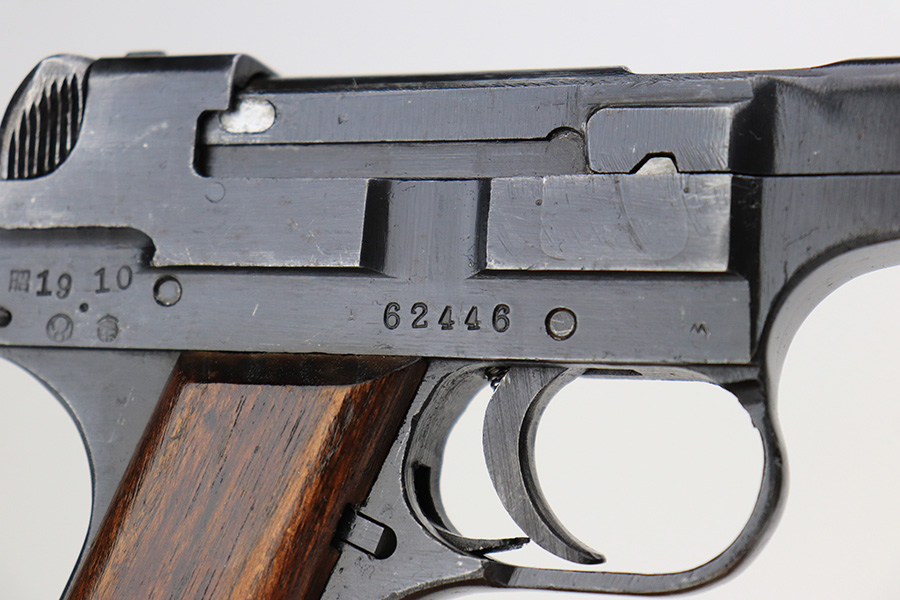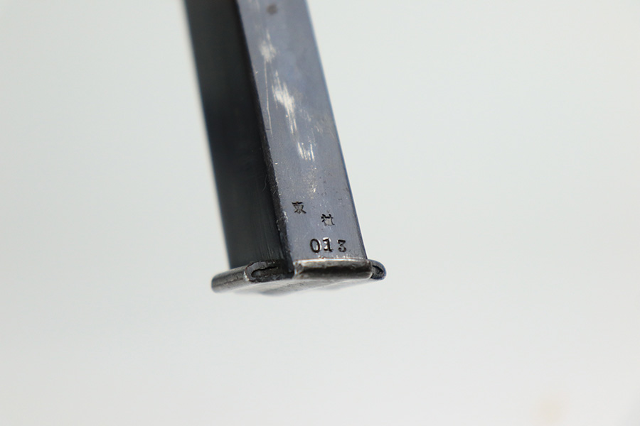 5/2/22 – This is a minty example of a late-war Nambu Type 94 issued to the Japanese military in October of 1944. The gun is all matching and comes with a period-correct magazine that does not match the gun. It also comes with late-war slab-side wood grips that are un-numbered. The gun itself has retained about 98% of its original bluing with some very light wear at the back of the frame. The bore is near-mint. The action on this one is a little tight, and the magazine has some trouble staying inside the gun.