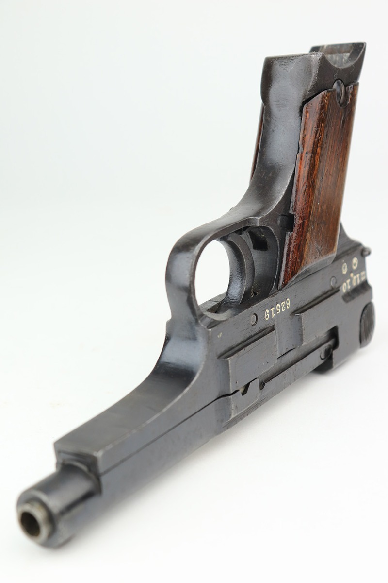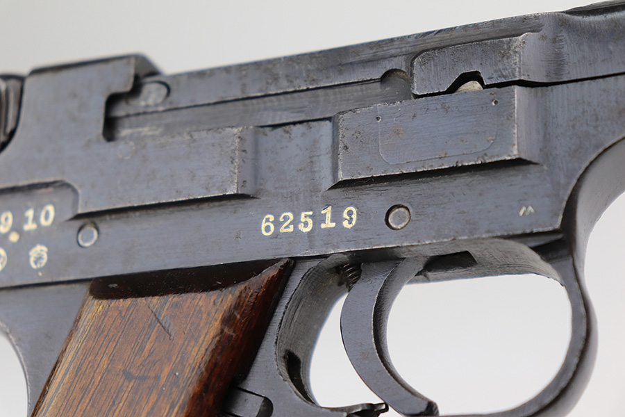 3/11/22 – This is a minty example of a late-war Nambu Type 94 issued to the Japanese military in October of 1944. The gun is all matching and comes with one original matching-numbered magazine. It has retained nearly all of its finish, but there are areas of minor pitting throughout. The pitting is most noticeable on the grip straps, underside of the frame, right side of the gun, and around the muzzle. Comes with an excellent set of late-war slab-style grips that are hand-numbered on the inside to match the gun. The bore is mint.