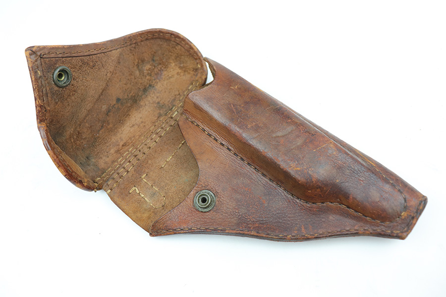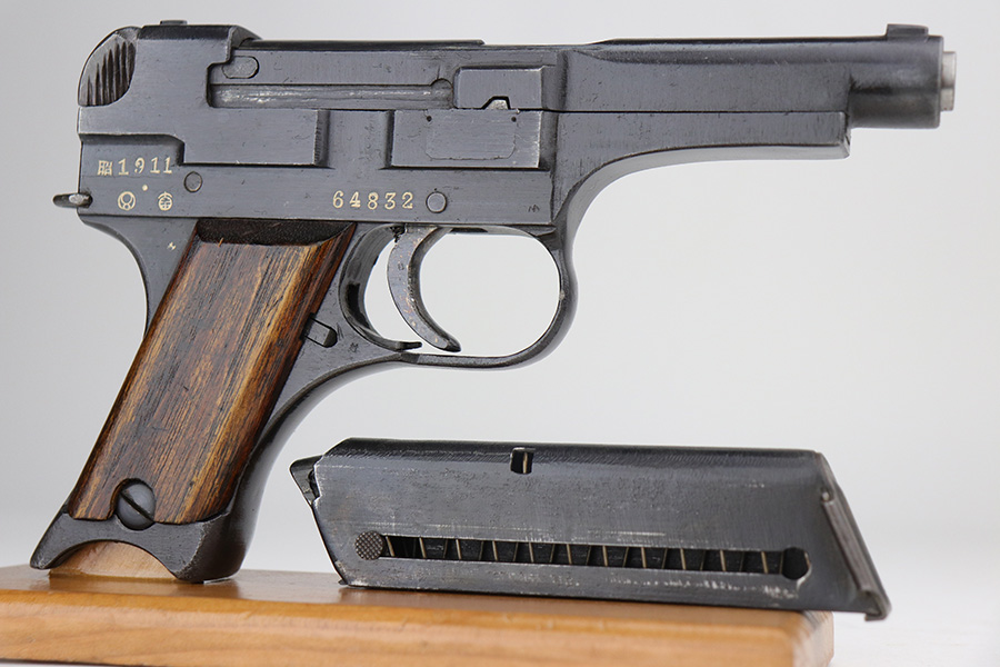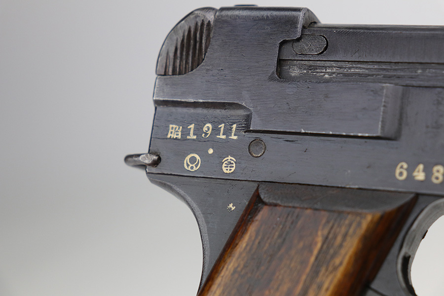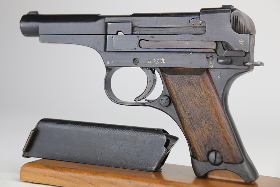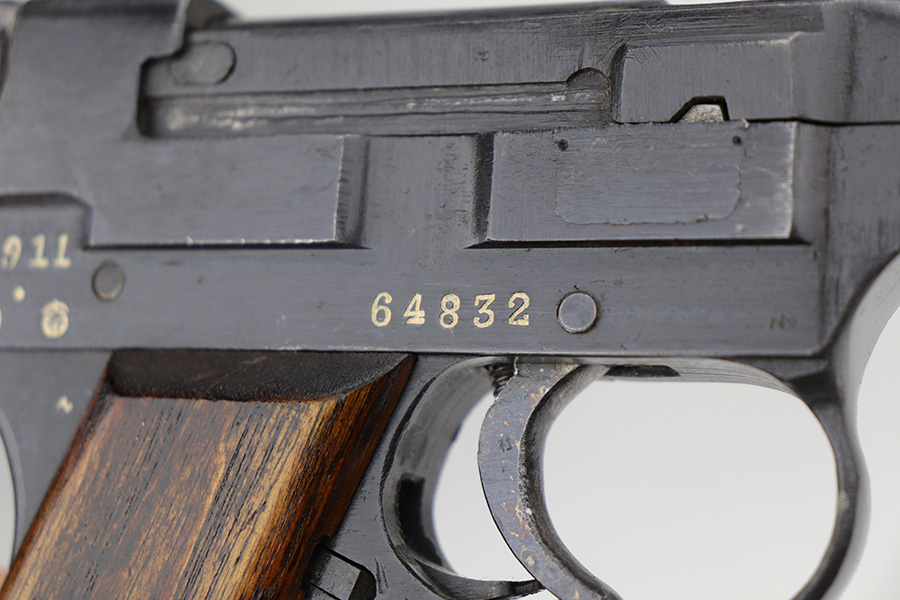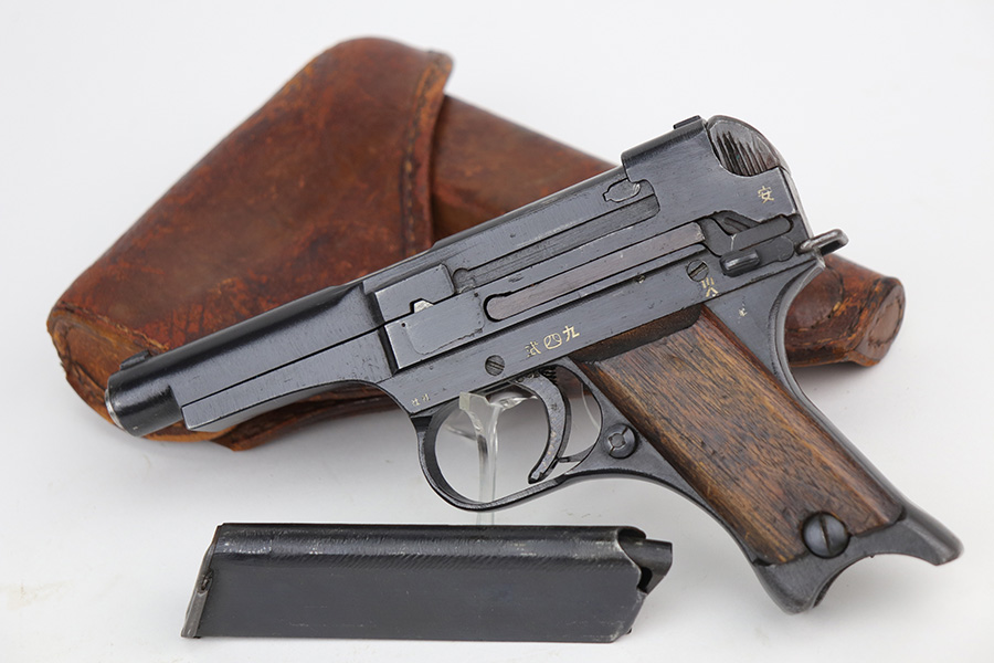 7/29/22 – This is a minty example of a late-war Nambu Type 94 issued to the Japanese military in November of 1944. It is all matching and has a Nagoya makers mark on the left side of the frame. It comes as a rig with one original matching-numbered magazine and a period-correct holster that has some light cracking in the leather throughout. The gun is minty, retaining about 97-98% of its original finish. There are just some very light streaks on the top of the slide from the action of the gun. Comes with proper late-war slab-side wood grips that are un-numbered. The bore is mint.