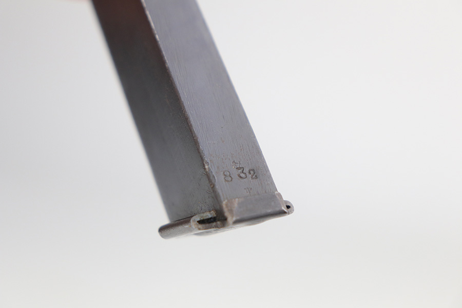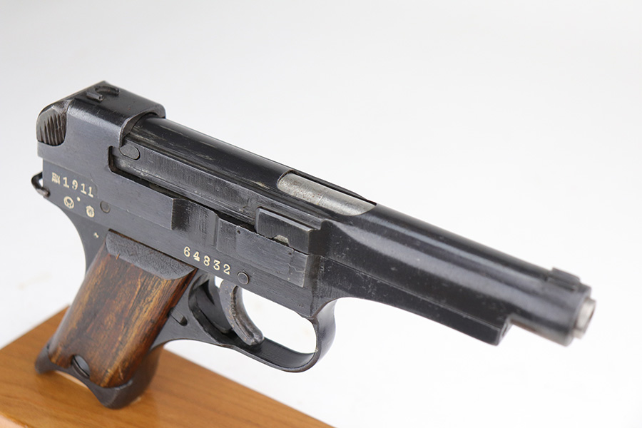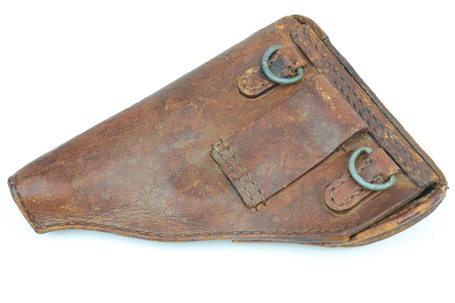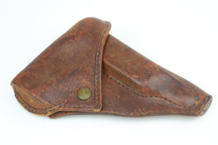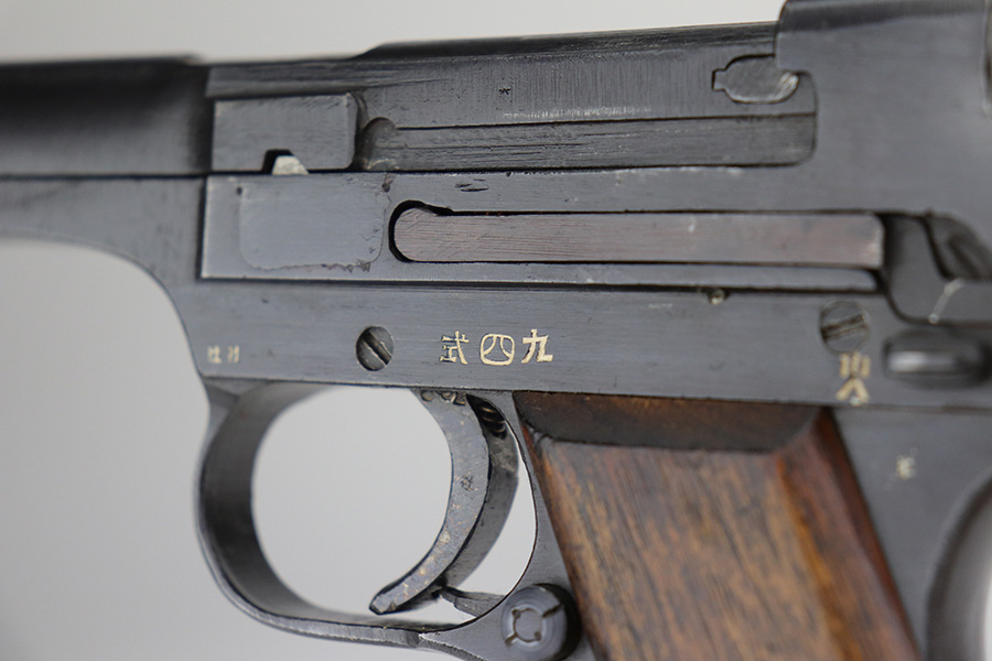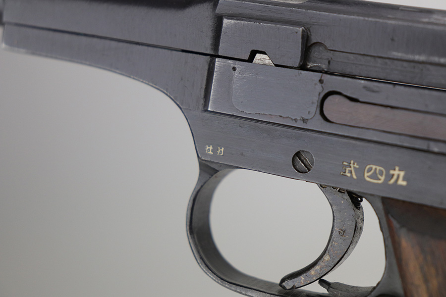 7/29/22 – This is a minty example of a late-war Nambu Type 94 issued to the Japanese military in November of 1944. It is all matching and has a Nagoya makers mark on the left side of the frame. It comes as a rig with one original matching-numbered magazine and a period-correct holster that has some light cracking in the leather throughout. The gun is minty, retaining about 97-98% of its original finish. There are just some very light streaks on the top of the slide from the action of the gun. Comes with proper late-war slab-side wood grips that are un-numbered. The bore is mint.