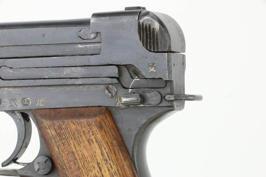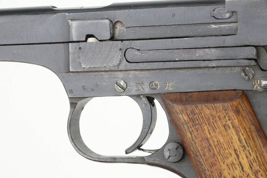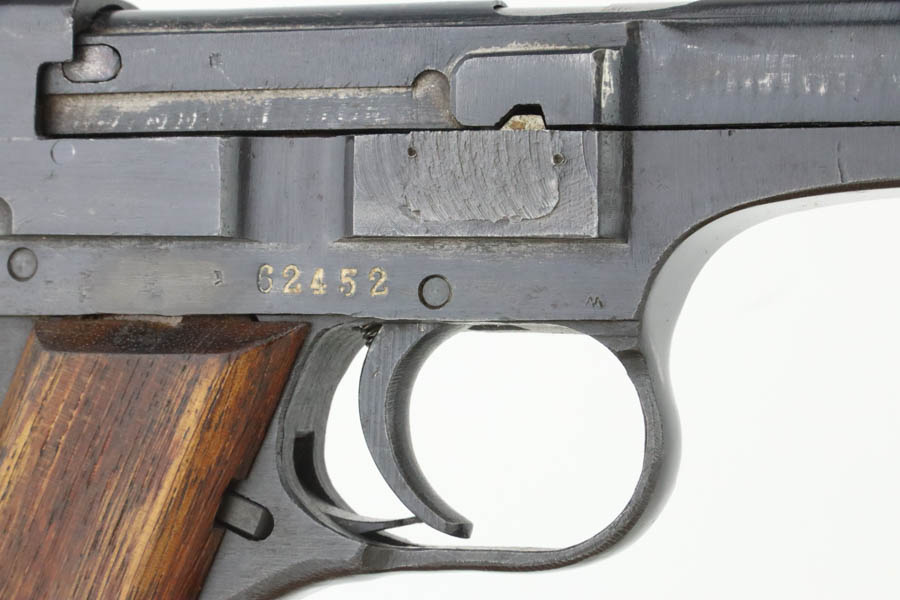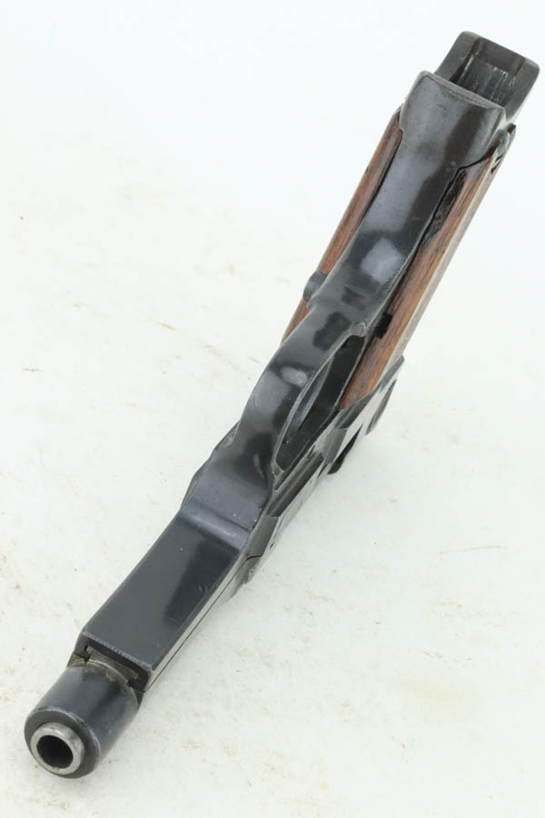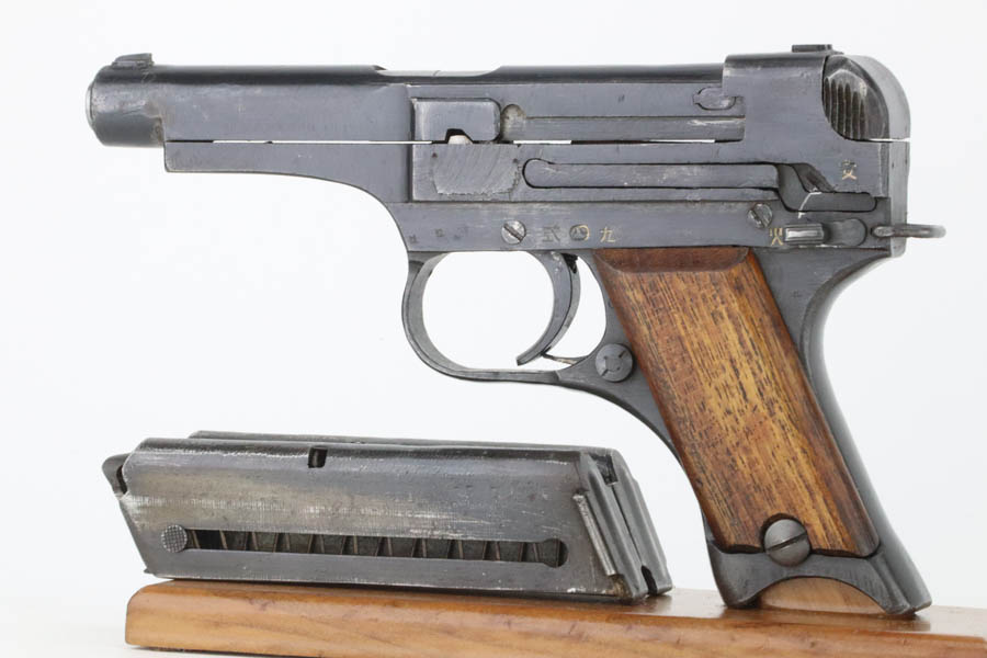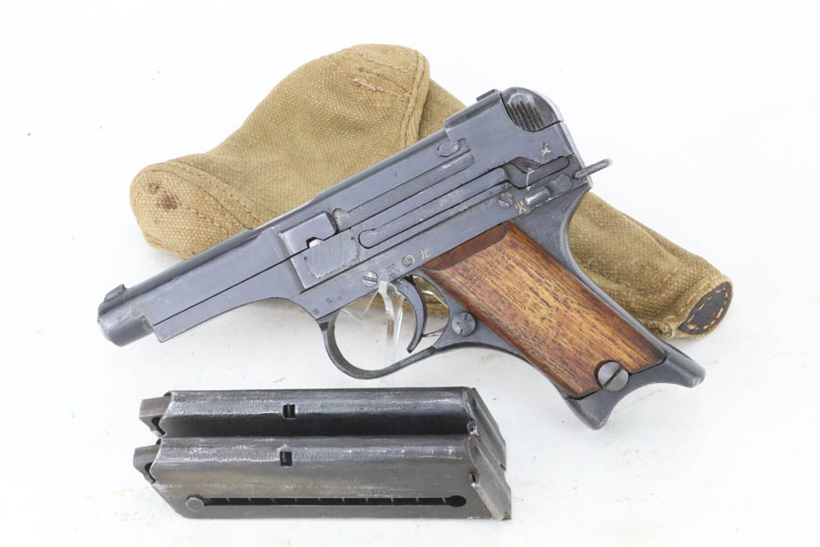7/29/24 – This is a near-mint example of a Nambu Type 94 issued to the Japanese military in October of 1944. It is all matching and has all of the proper late-war features. It comes as a rig with one original matching-numbered magazine, one mismatched magazine, and a proper late-war canvas holster. The gun has retained nearly all of its original finish with just hints of high edge wear. Fitted with correct, late-war, slab-style wood grips (not numbered). Mint bore.