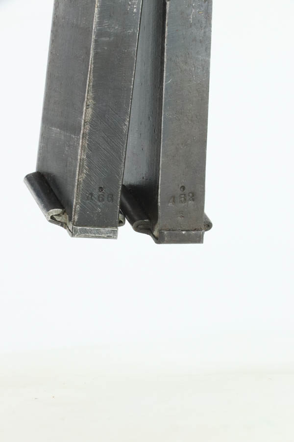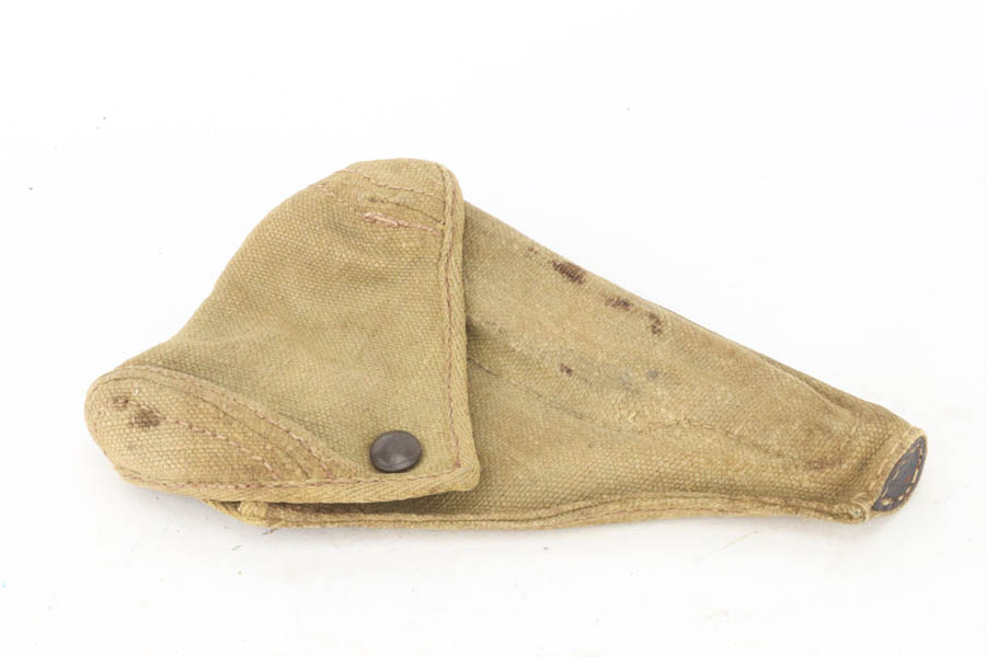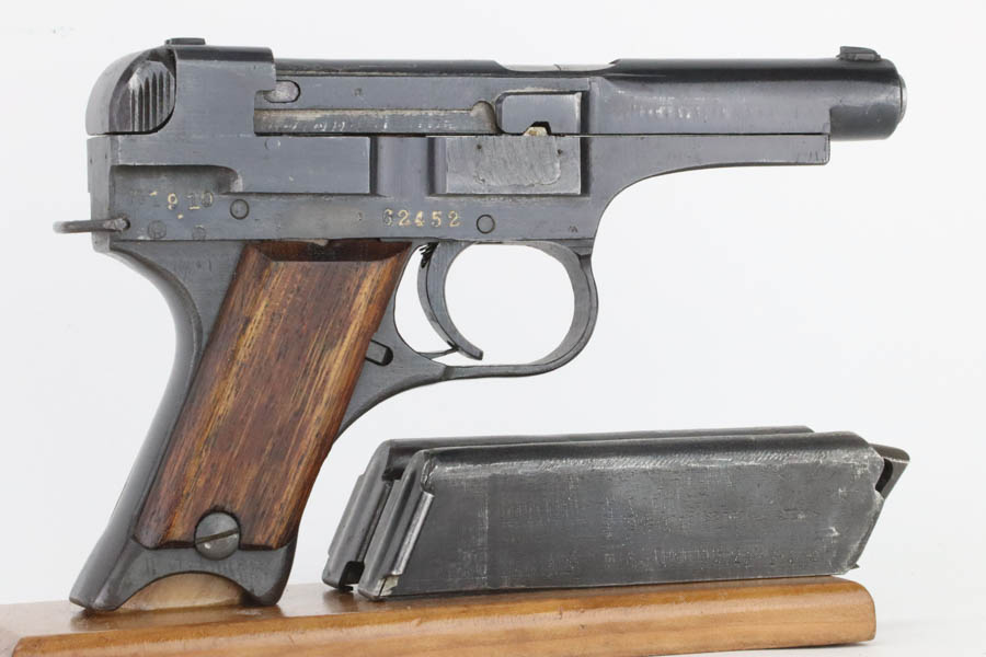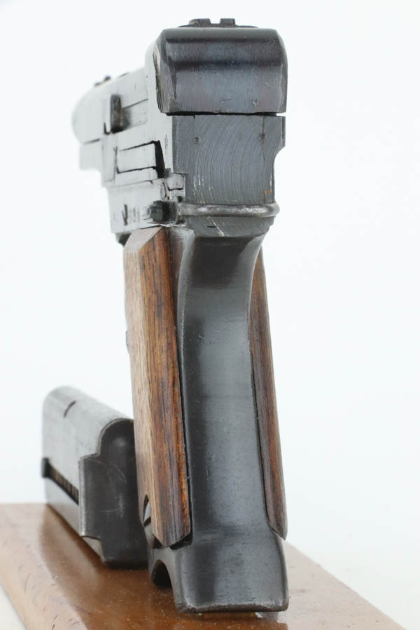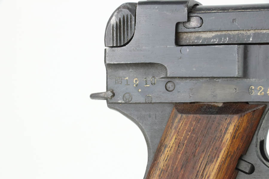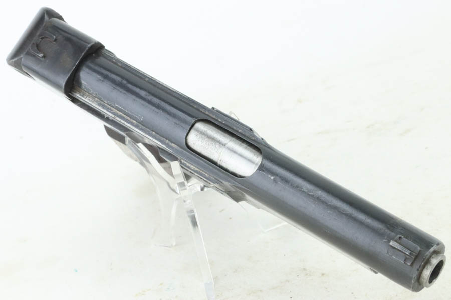 7/29/24 – This is a near-mint example of a Nambu Type 94 issued to the Japanese military in October of 1944. It is all matching and has all of the proper late-war features. It comes as a rig with one original matching-numbered magazine, one mismatched magazine, and a proper late-war canvas holster. The gun has retained nearly all of its original finish with just hints of high edge wear. Fitted with correct, late-war, slab-style wood grips (not numbered). Mint bore.