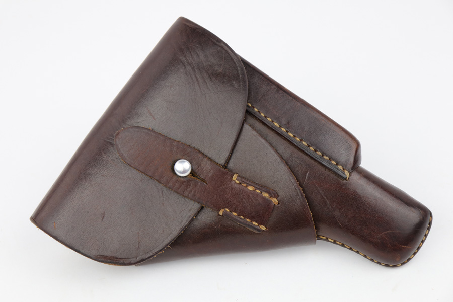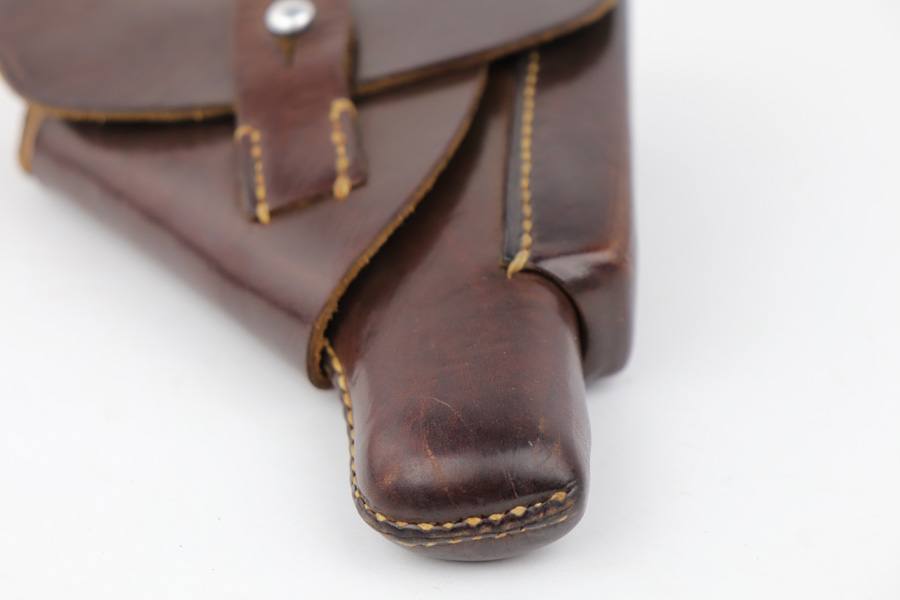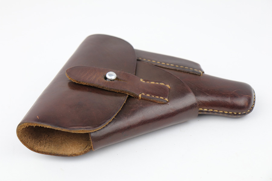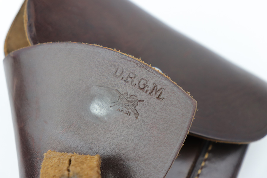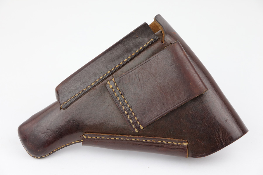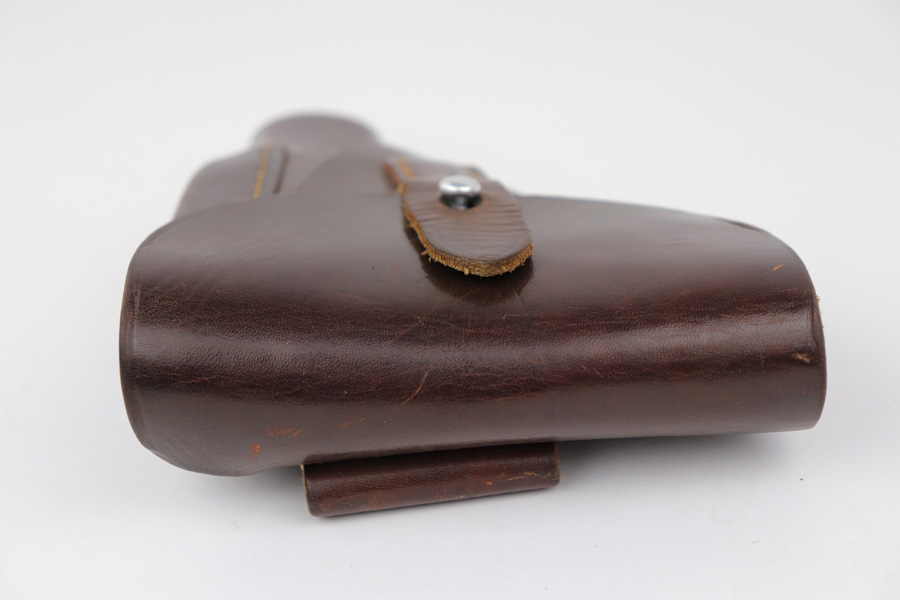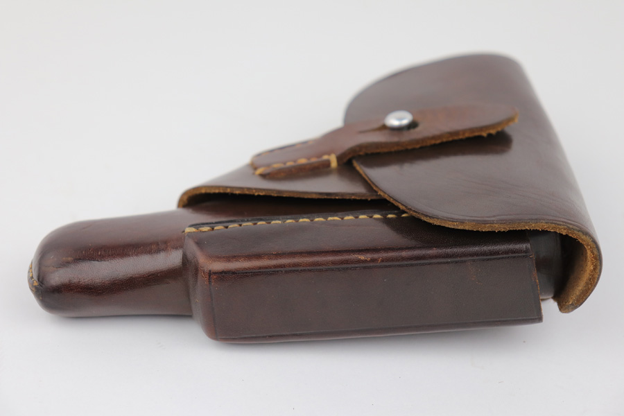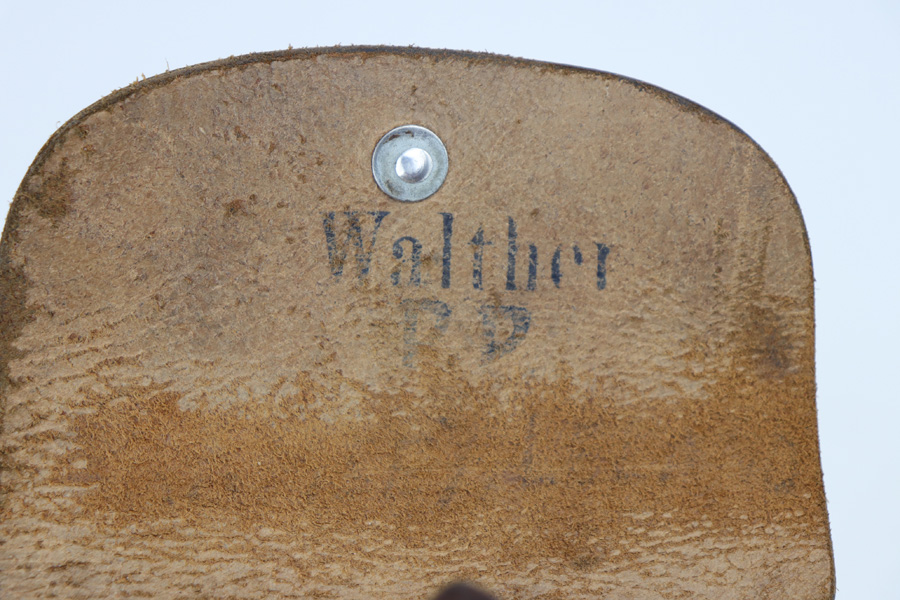 8/6/19 – This is a minty, scarce variation Walther PP “leading edge” holster with a beautiful cordovan brown color leather. The interior leather has an original Walther PP ink stamp and very clean leather. Exterior leather has a few minor wrinkles, but no major or notable wear. All original stitching is tight and in tact. AKAH stamped under the closure strap. All original and from our owner’s collection !