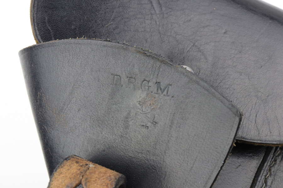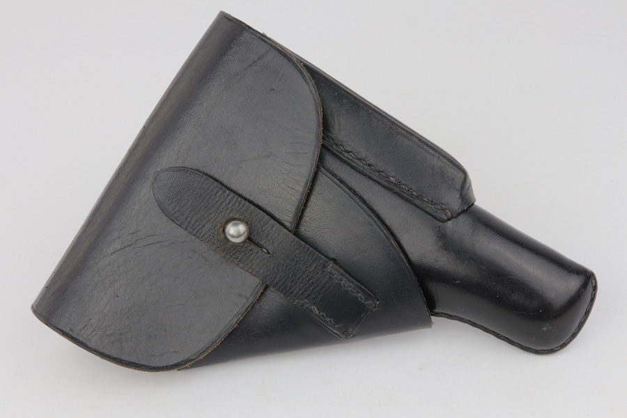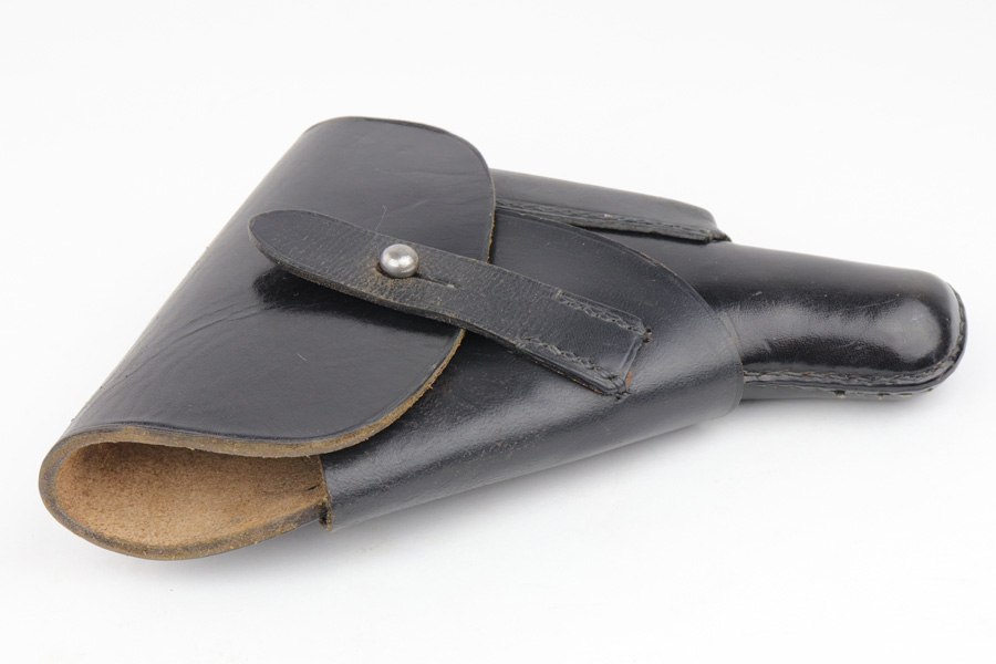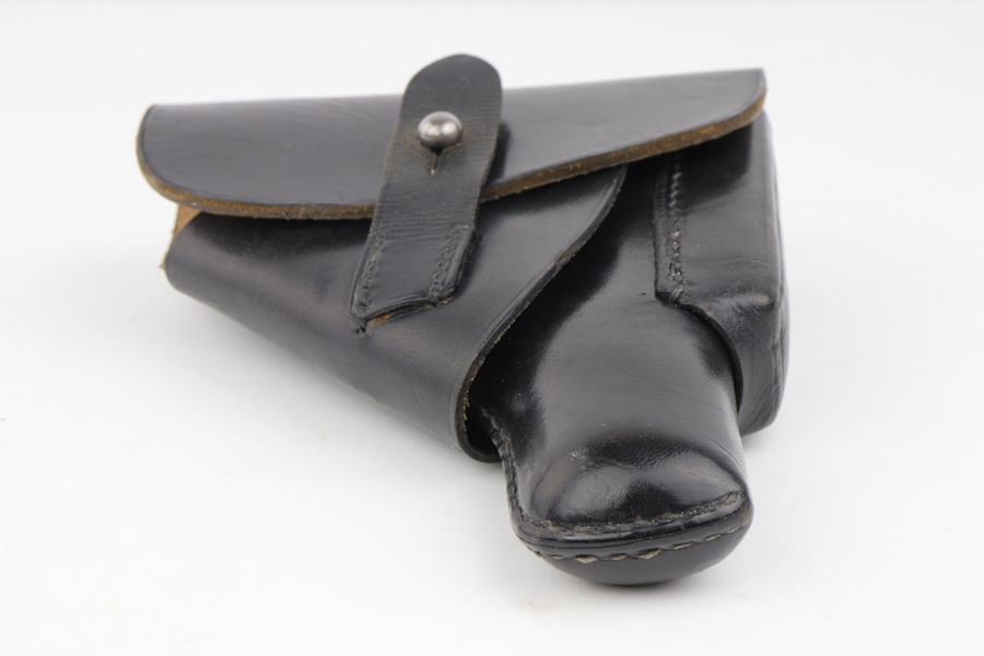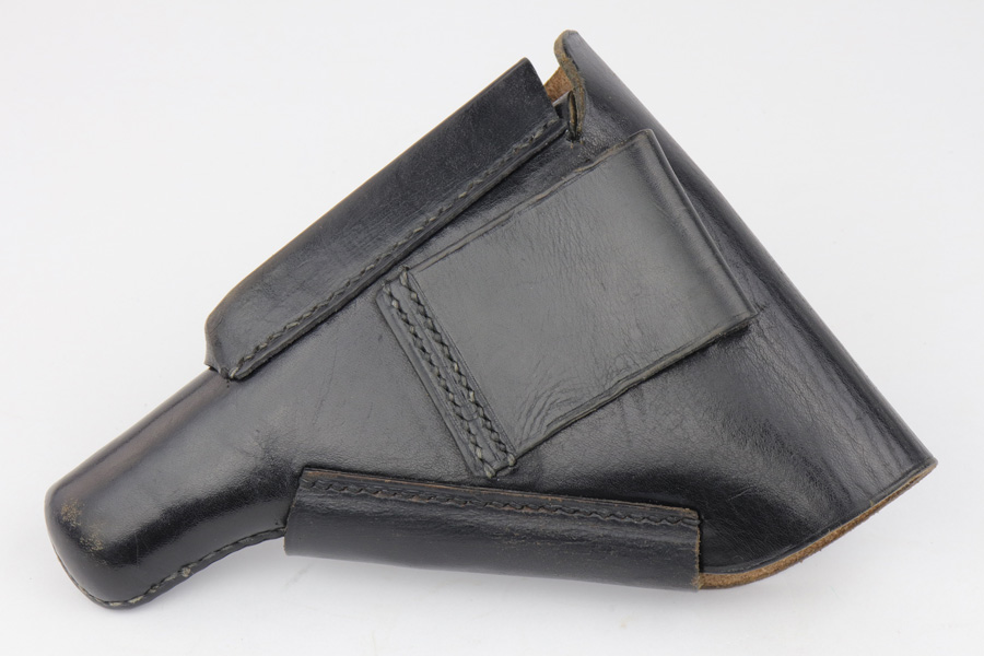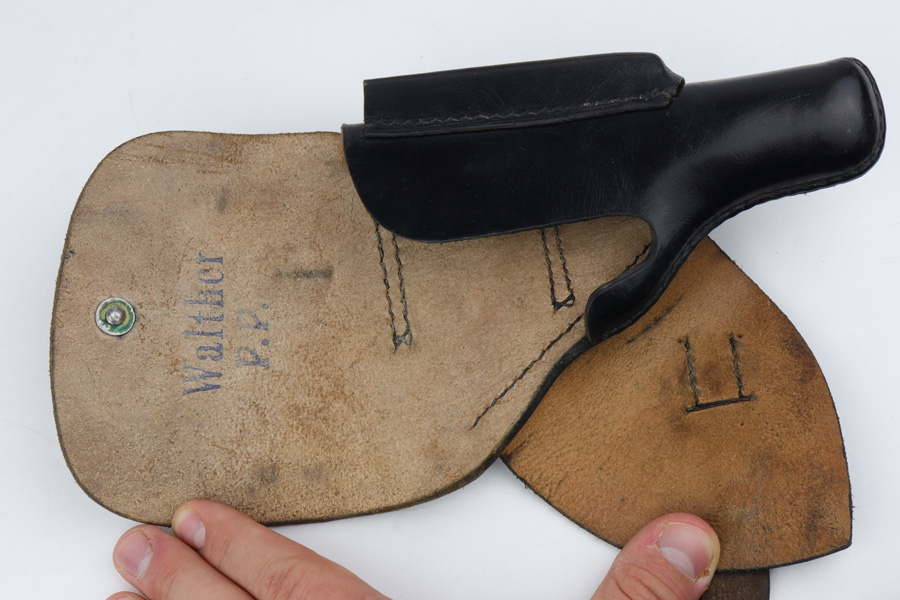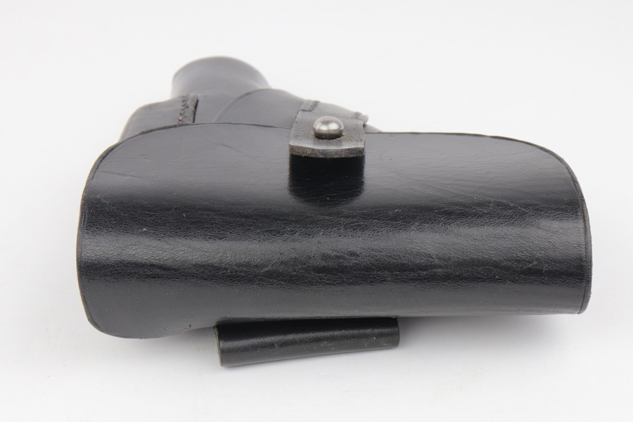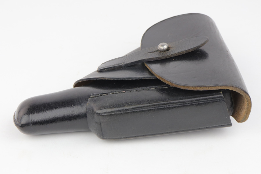 6/19/19 – This is a beautiful, minty condition AKAH Walther PP holster from WW2. The holster is AKAH D.R.G.M. stamped under the closure strap, and has the original Walther PP ink stamp on the interior leather. The holster is “leading edge” style with the magazine pouch on the side, and black leather. Some associate these types of holsters with SS issued Walther PPs. This is a hard one to upgrade – beautiful leather and stitching is all original and authentic.