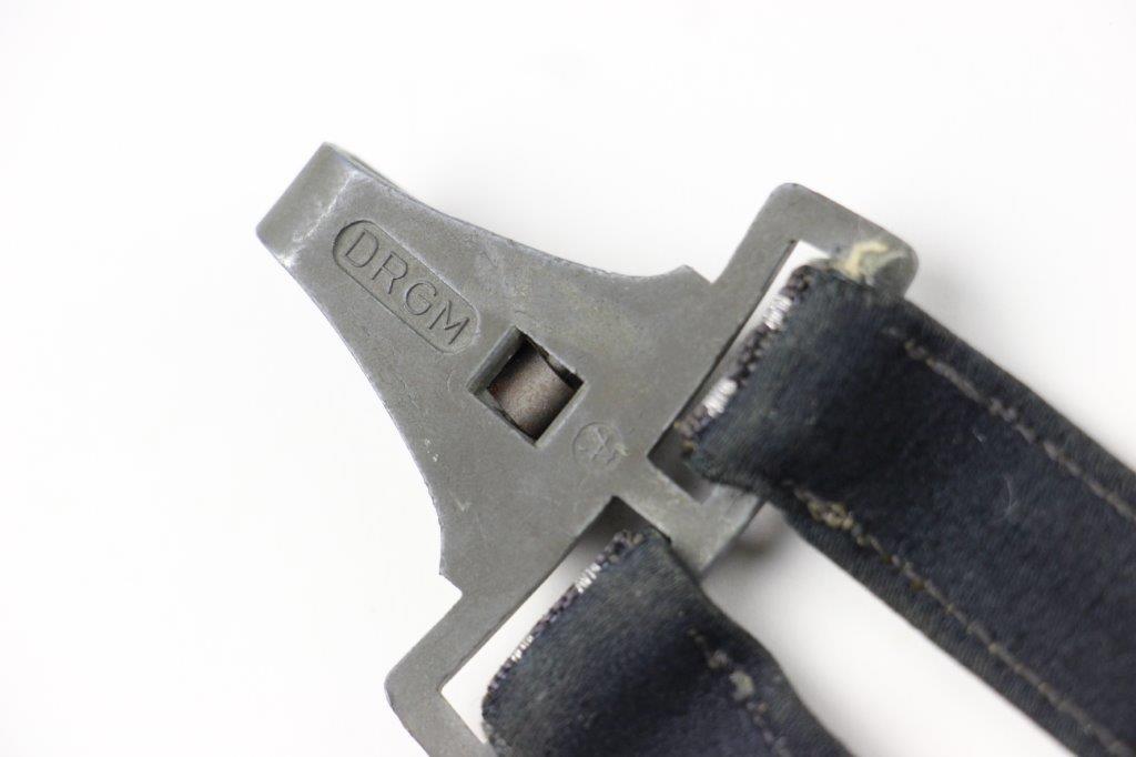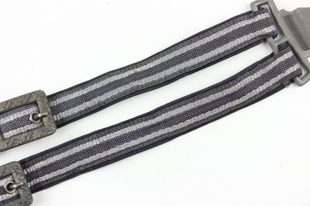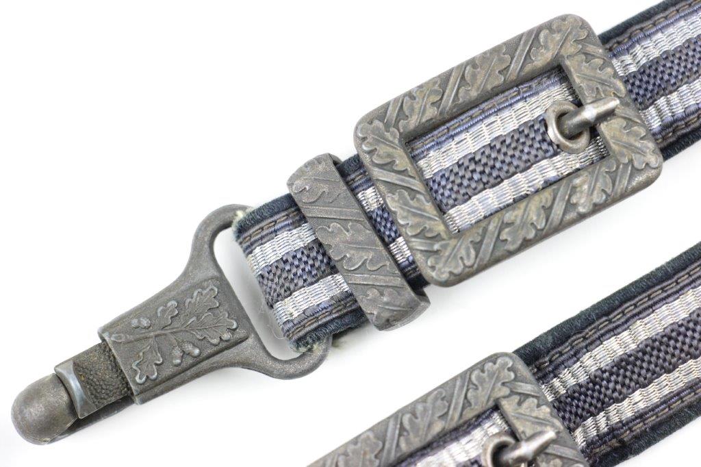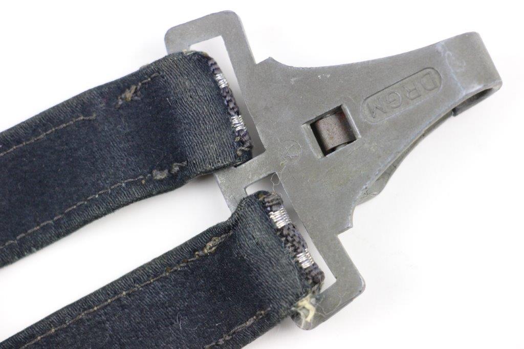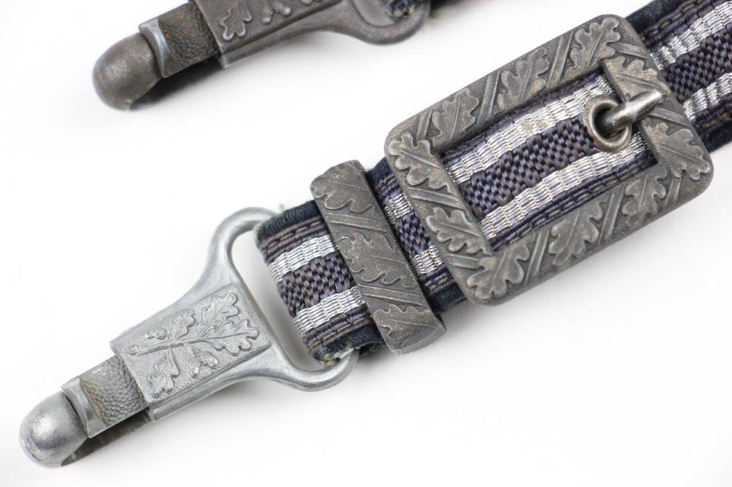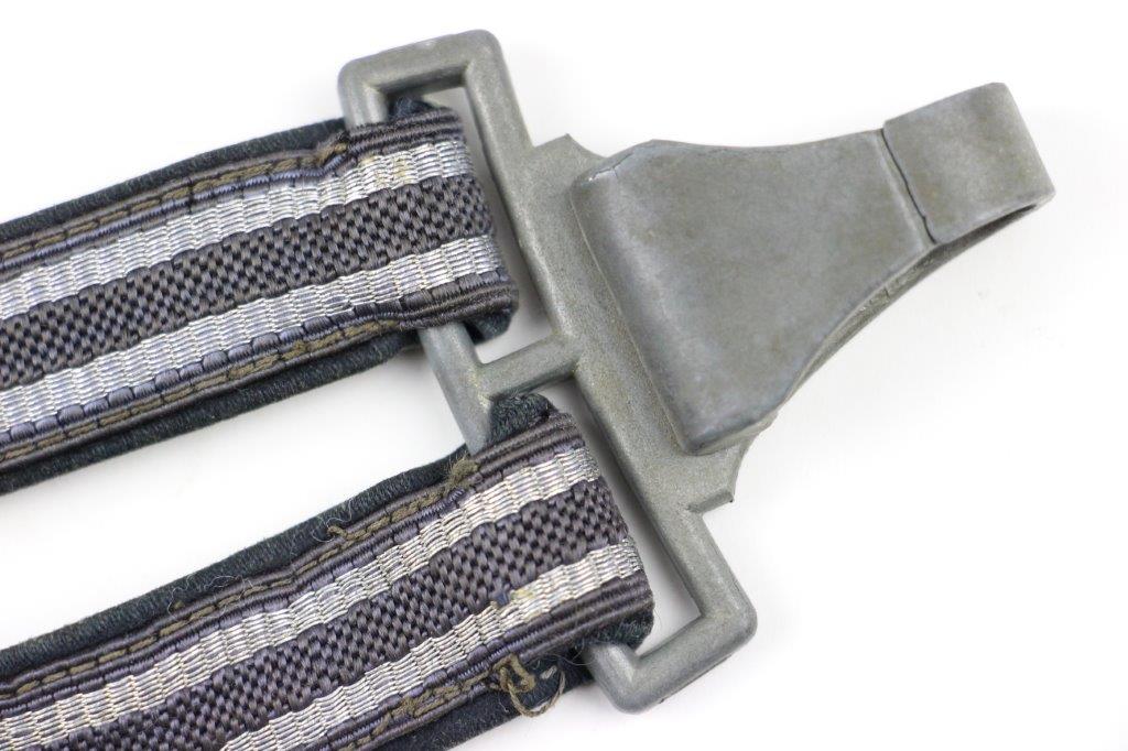 3/22/24 – This is an excellent, minty condition Luftwaffe dagger hanger by Assmann. Later wartime example with zinc (nonmagnetic) metal fixtures. Minty chords and excellent silver bullion thread throughout. The fixtures have mild patina and natural aging throughout. The belt clip is marked “DRGM” and stamped with an Assmann maker mark.