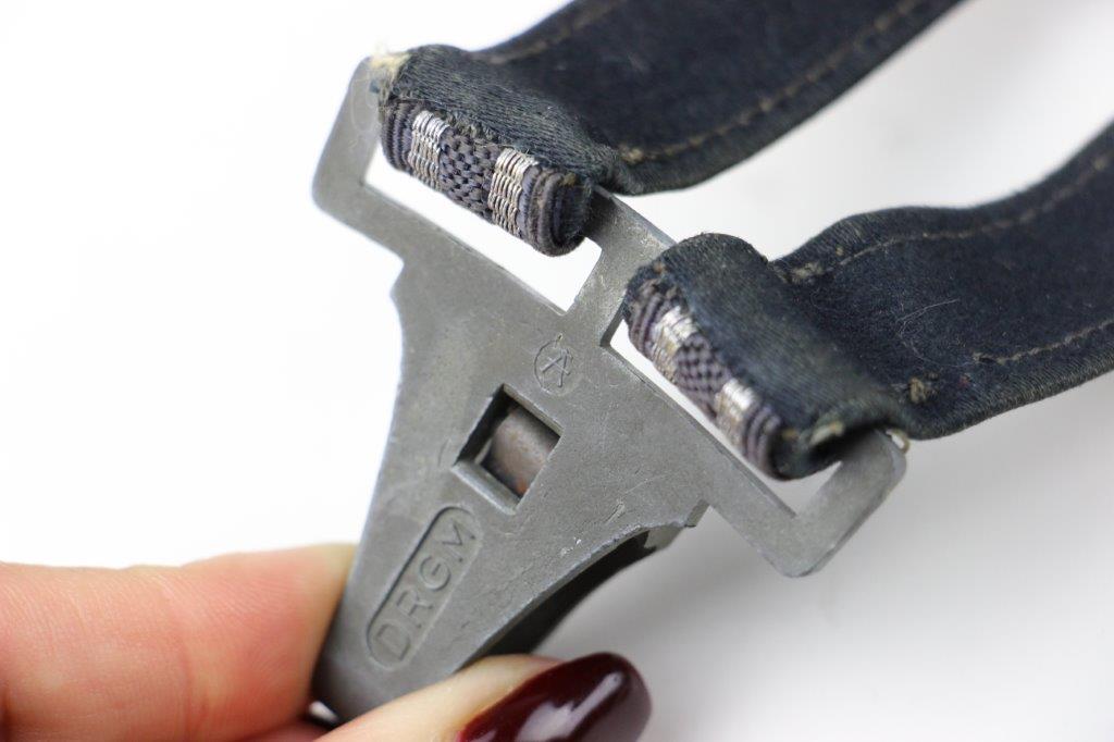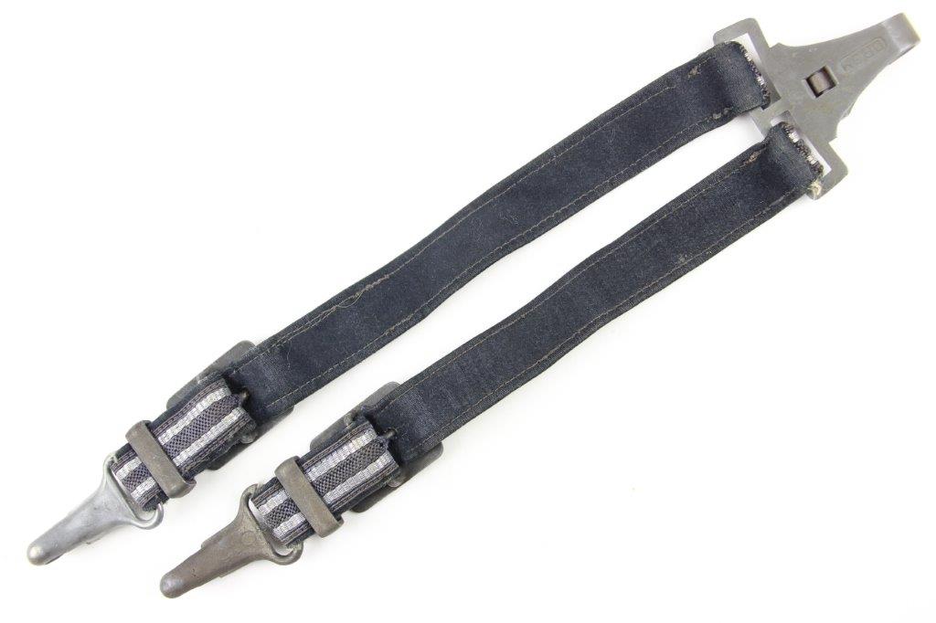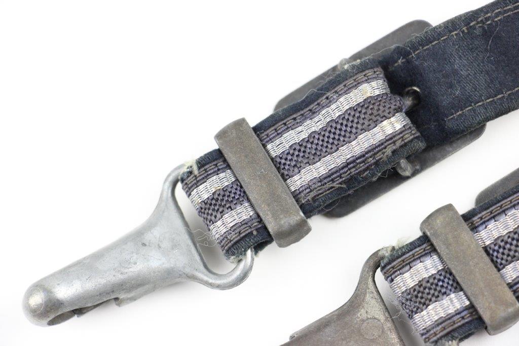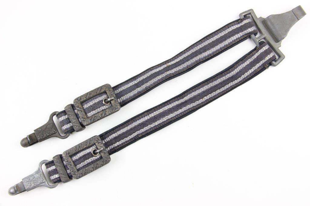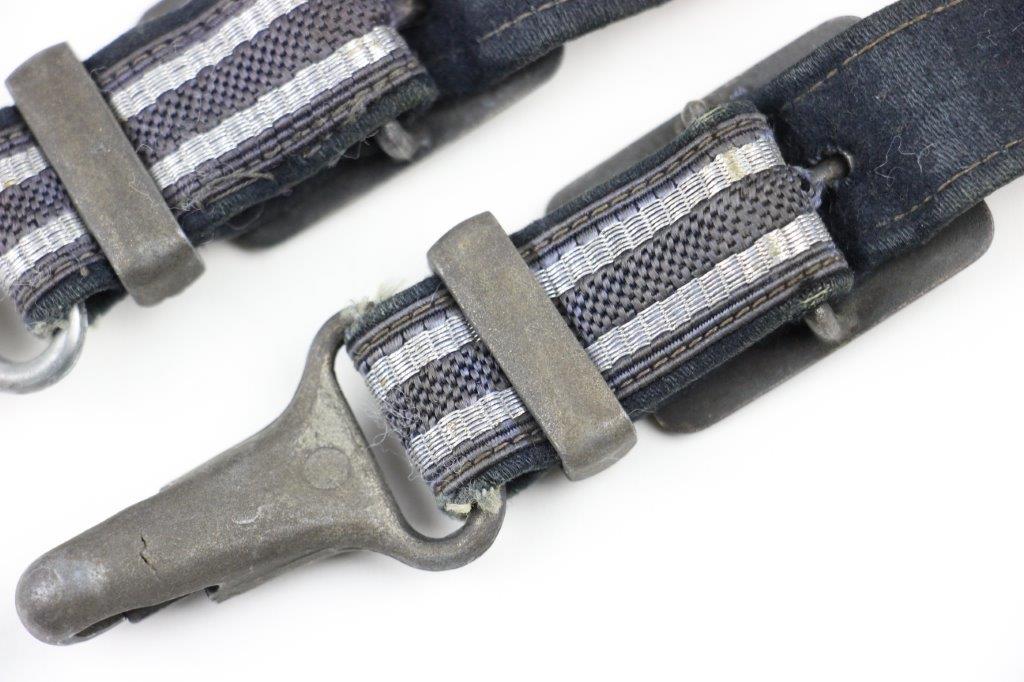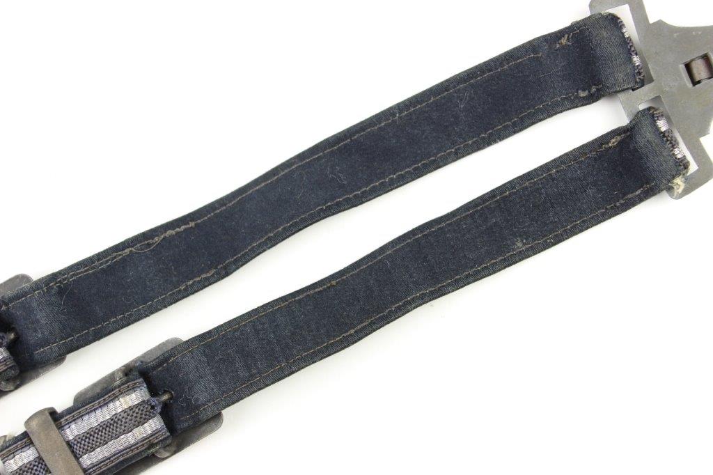 3/22/24 – This is an excellent, minty condition Luftwaffe dagger hanger by Assmann. Later wartime example with zinc (nonmagnetic) metal fixtures. Minty chords and excellent silver bullion thread throughout. The fixtures have mild patina and natural aging throughout. The belt clip is marked “DRGM” and stamped with an Assmann maker mark.