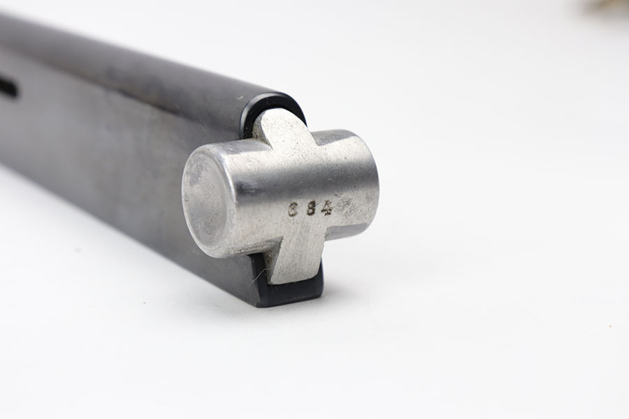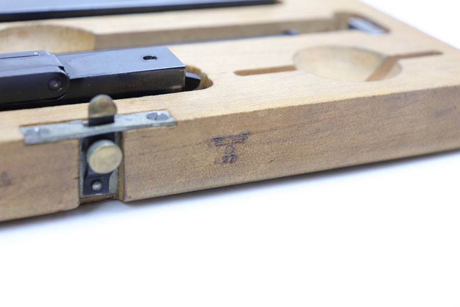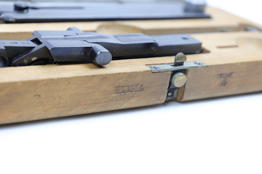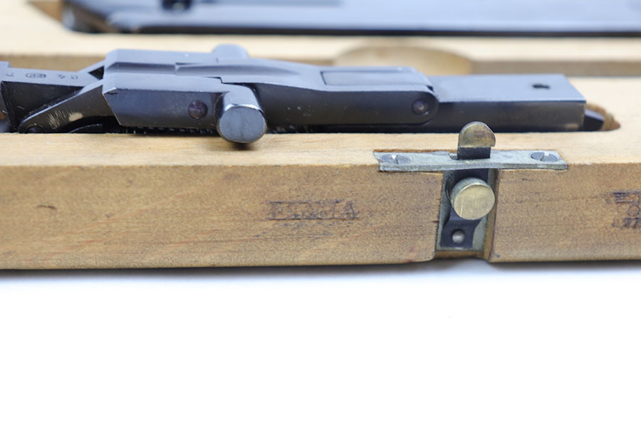 10/28/20 – This is an original, complete and all matching ERMA made .22 conversion kit for a 9mm Luger. The kit comes in the original wood box which is maker stamped “ERMA” and waffen proof stamped. The parts are all in minty condition and fully functional. These are very hard to find completely matching and in condition similar to this kit. See photos for all numbered parts.