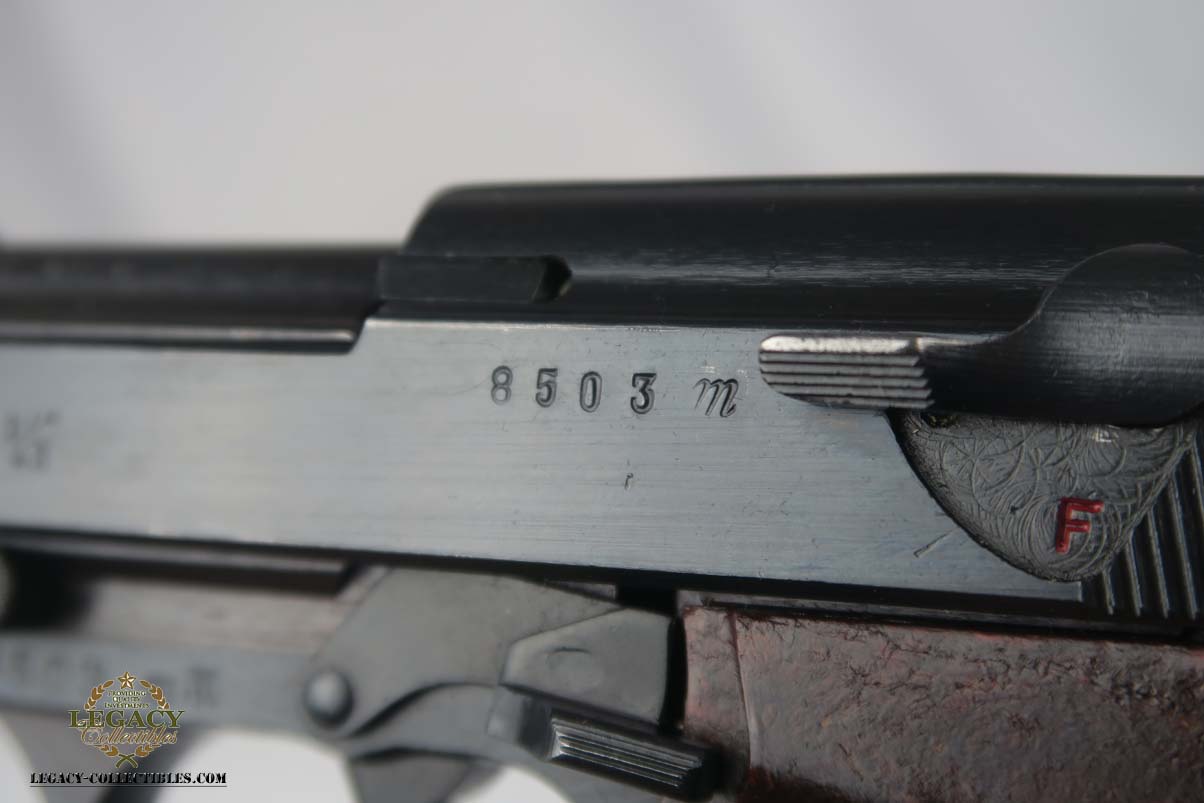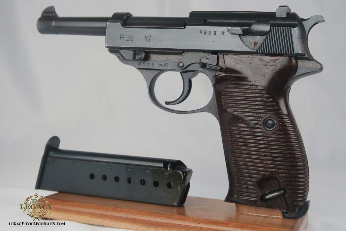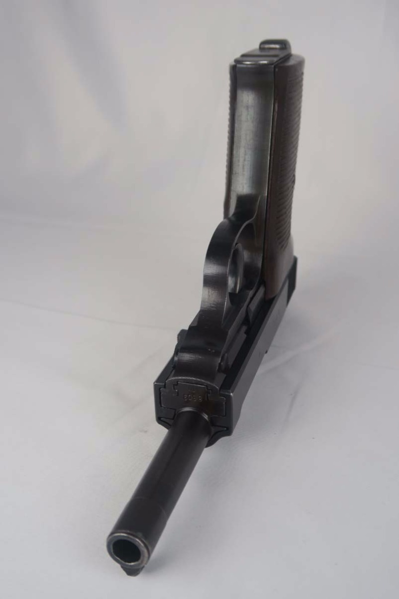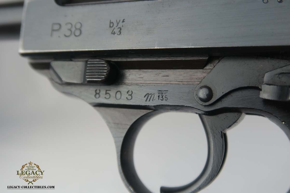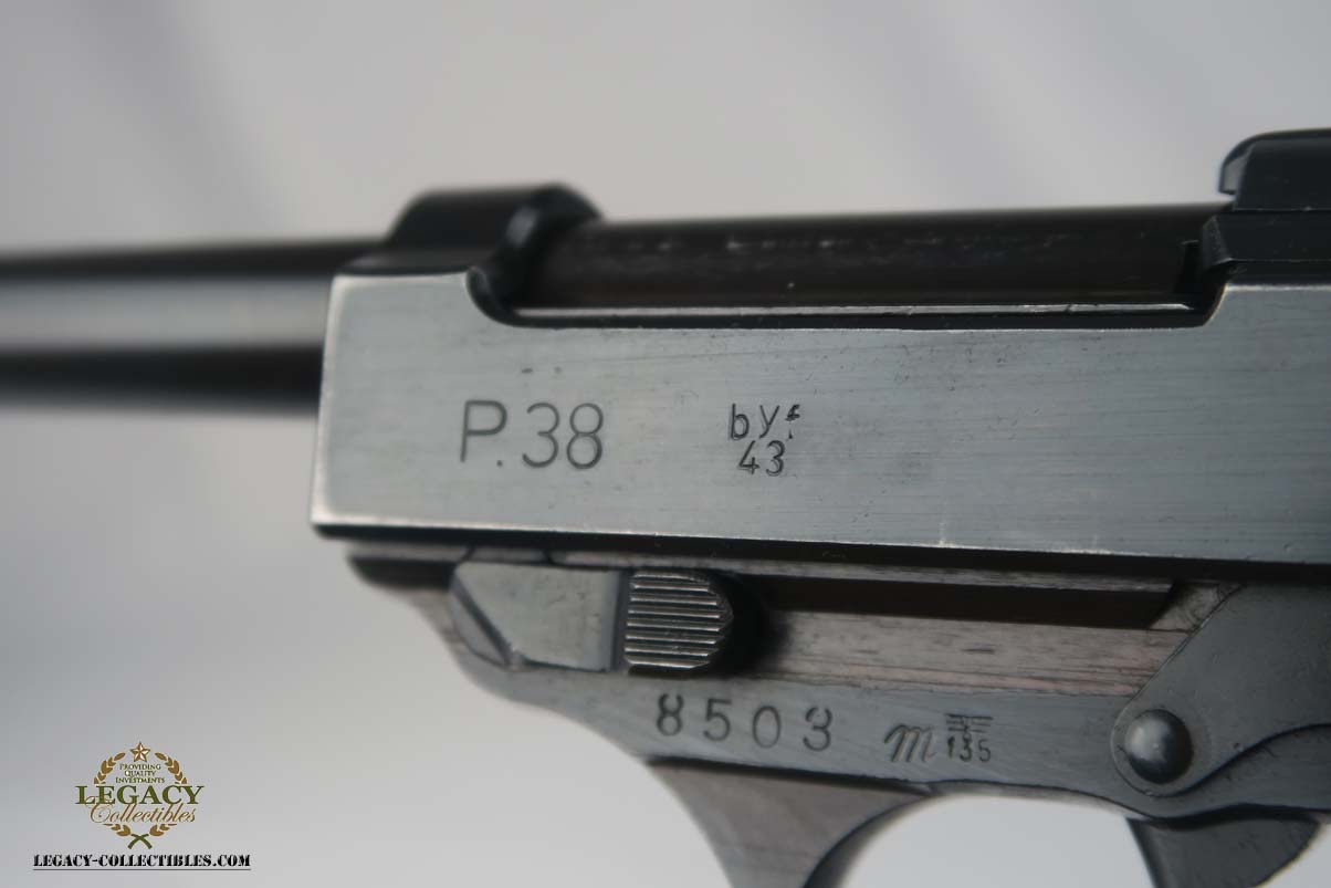 3/7/17 – This is a near-mint Mauser P.38 produced in 1943.  The original finish is about 98-99%, with just some high edge wear.  It has excellent reddish grips and a Mauser magazine that is correctly Eagle/135 proofed.  The pistol is mechanically sound, and the decocker works.  Very good bore, with strong rifling but it is slightly frosted.