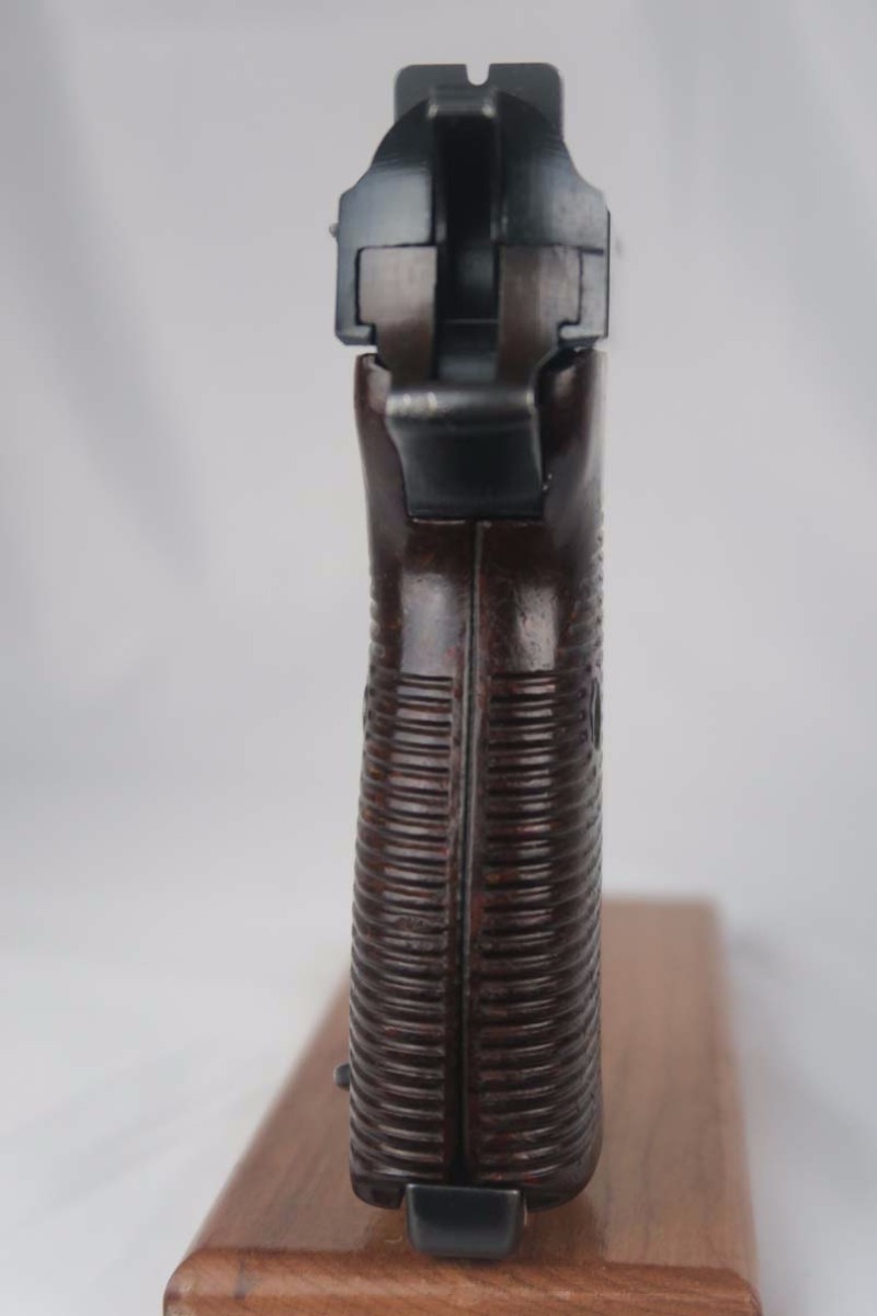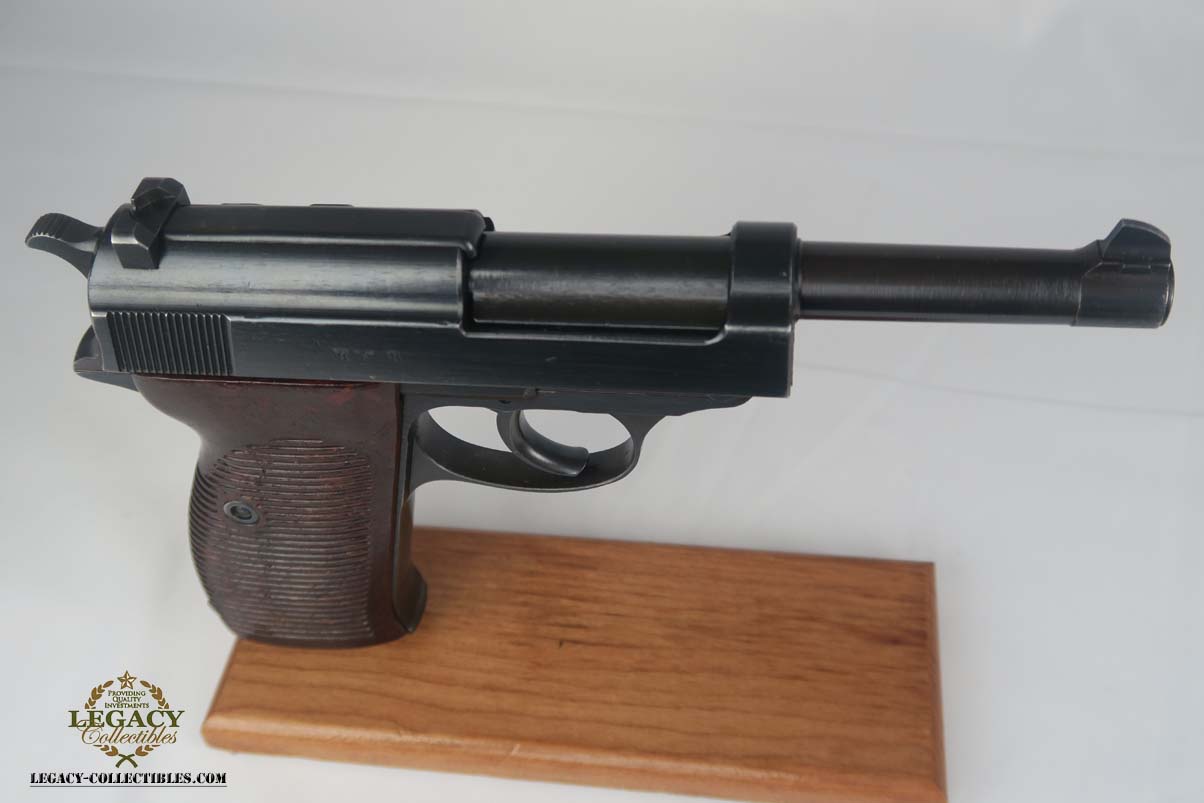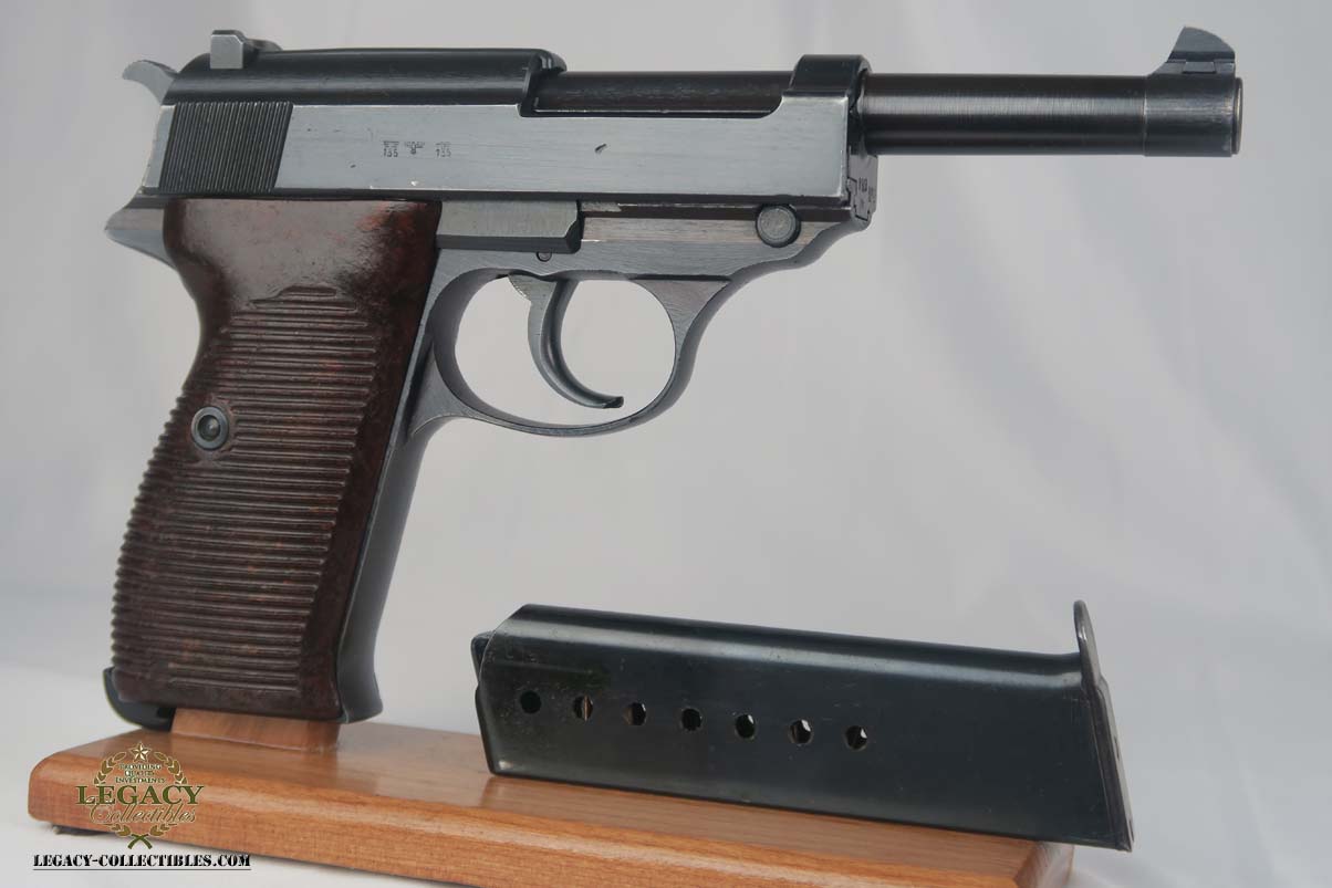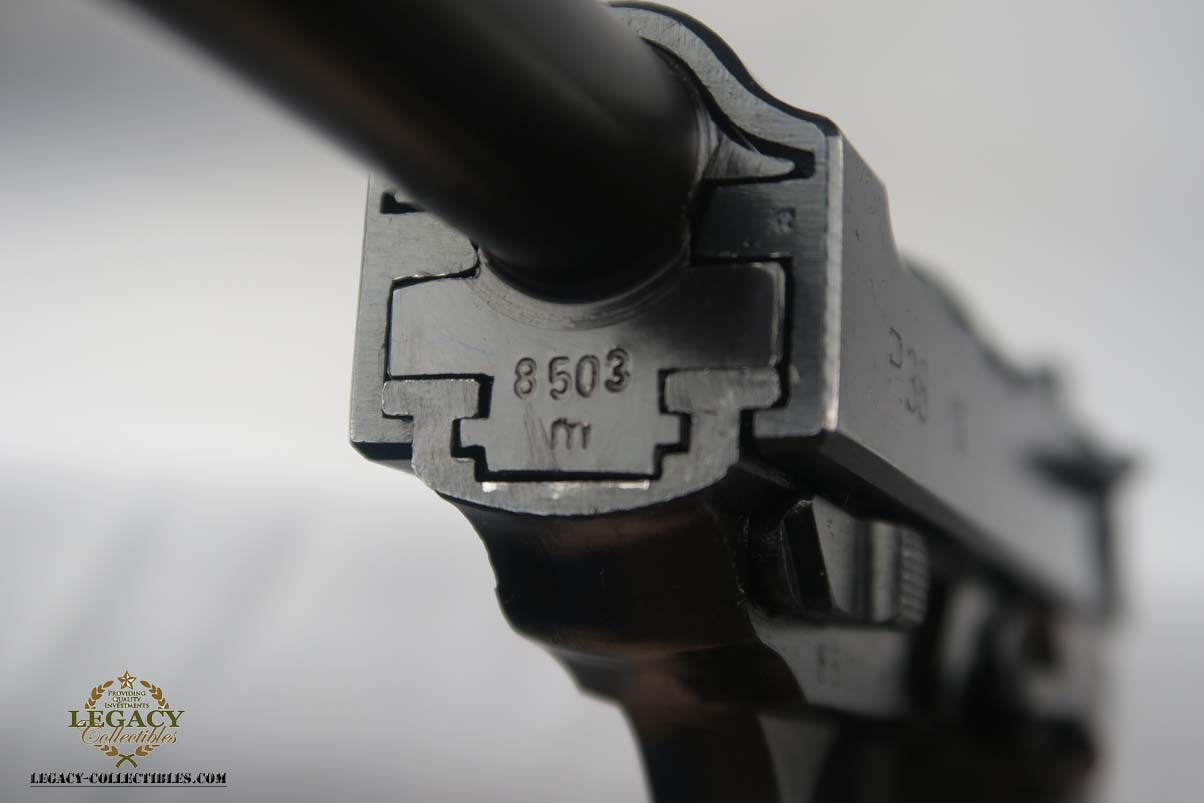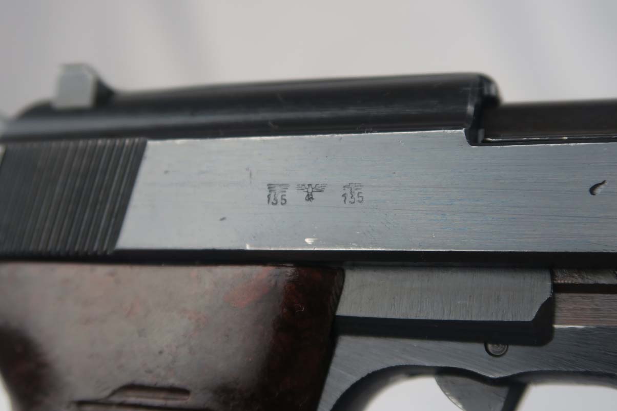 3/7/17 – This is a near-mint Mauser P.38 produced in 1943.  The original finish is about 98-99%, with just some high edge wear.  It has excellent reddish grips and a Mauser magazine that is correctly Eagle/135 proofed.  The pistol is mechanically sound, and the decocker works.  Very good bore, with strong rifling but it is slightly frosted.