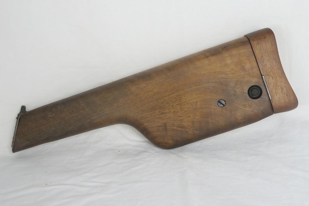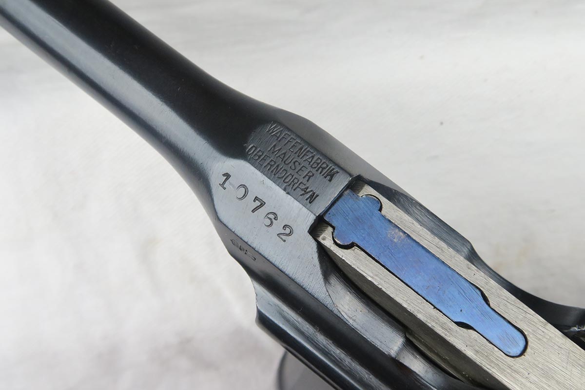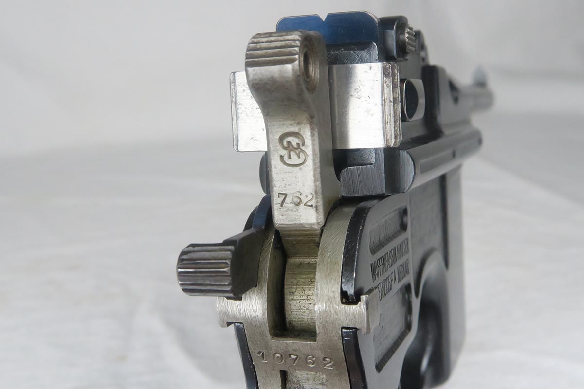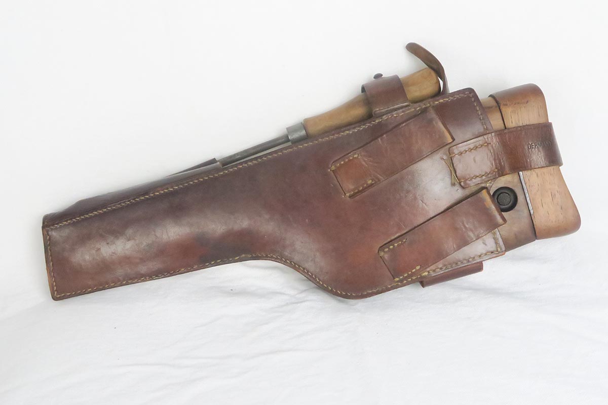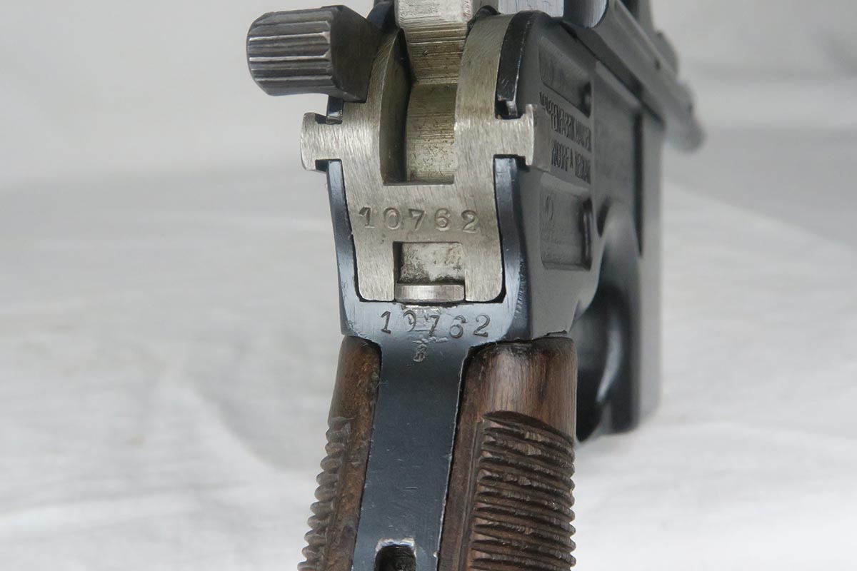 11/13/17 – This is a very scarce variation of WWI German Imperial contract Broomhandle pistol. Most of the so called “war time commercial” pistols were within the same serial number range as the rest of the commercial C96 pistols, but carried a German Army acceptance mark on the right chamber. However, there was a very small number of guns that were in their own serial range, similar to the “Red 9” broomhandles. It is unclear why certain guns were assigned a separate serial range, but only a few are known to exist and this is one of these guns. It is all matching, including the shoulder stock.  It is in superb 99% original condition, with just a slightest wear under the barrel from sliding in and out of the shoulder stock. The stock is in nice condition, with a tiny but stable hairline crack that has no wood movement around it. The leather harness is in great shape and is original and marked “Germany” on the closure strap.