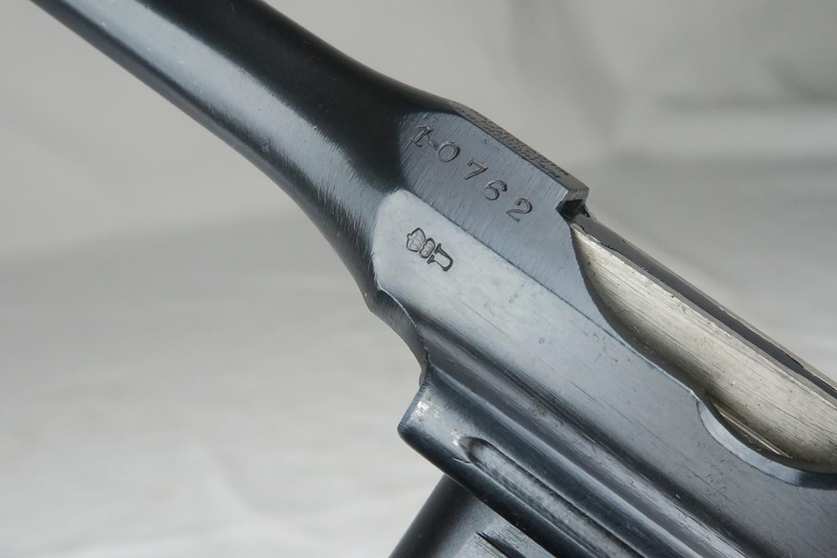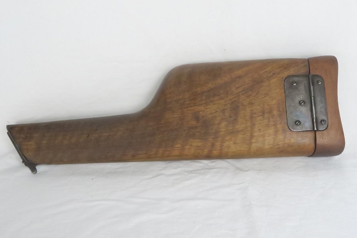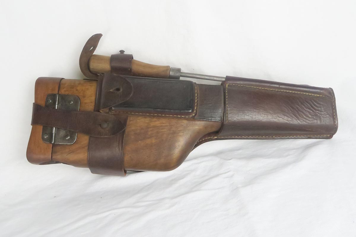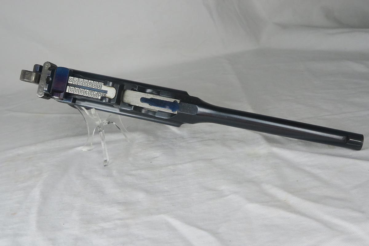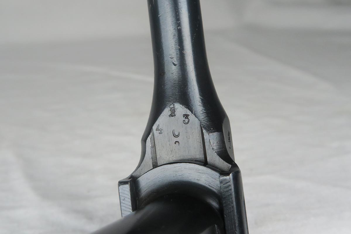 11/13/17 – This is a very scarce variation of WWI German Imperial contract Broomhandle pistol. Most of the so called “war time commercial” pistols were within the same serial number range as the rest of the commercial C96 pistols, but carried a German Army acceptance mark on the right chamber. However, there was a very small number of guns that were in their own serial range, similar to the “Red 9” broomhandles. It is unclear why certain guns were assigned a separate serial range, but only a few are known to exist and this is one of these guns. It is all matching, including the shoulder stock.  It is in superb 99% original condition, with just a slightest wear under the barrel from sliding in and out of the shoulder stock. The stock is in nice condition, with a tiny but stable hairline crack that has no wood movement around it. The leather harness is in great shape and is original and marked “Germany” on the closure strap.