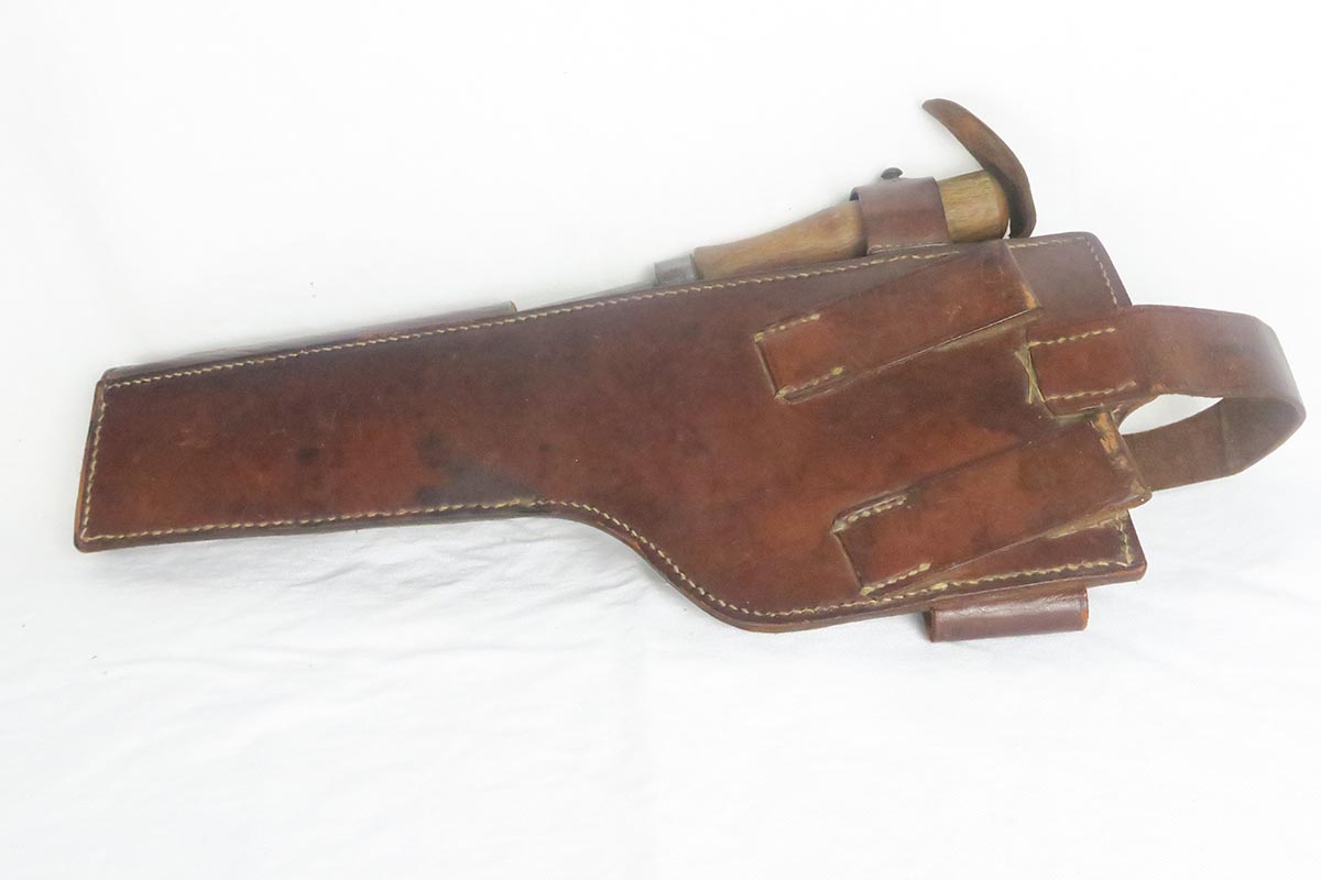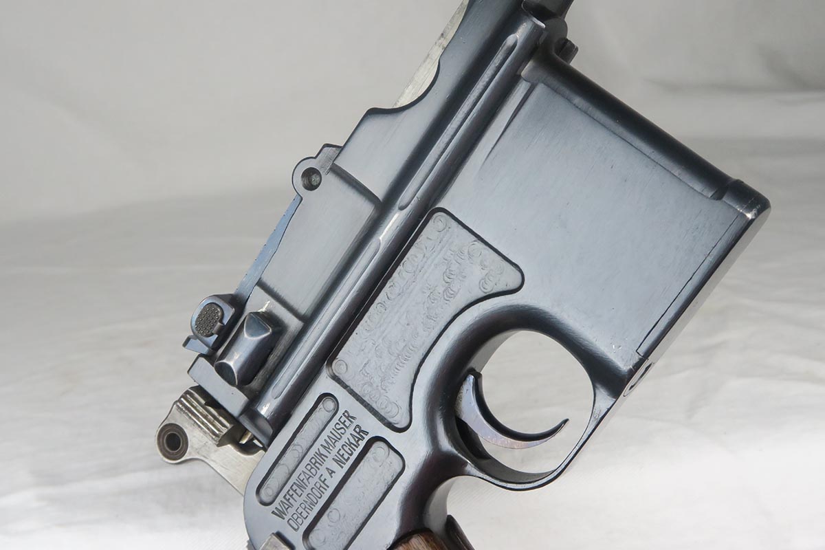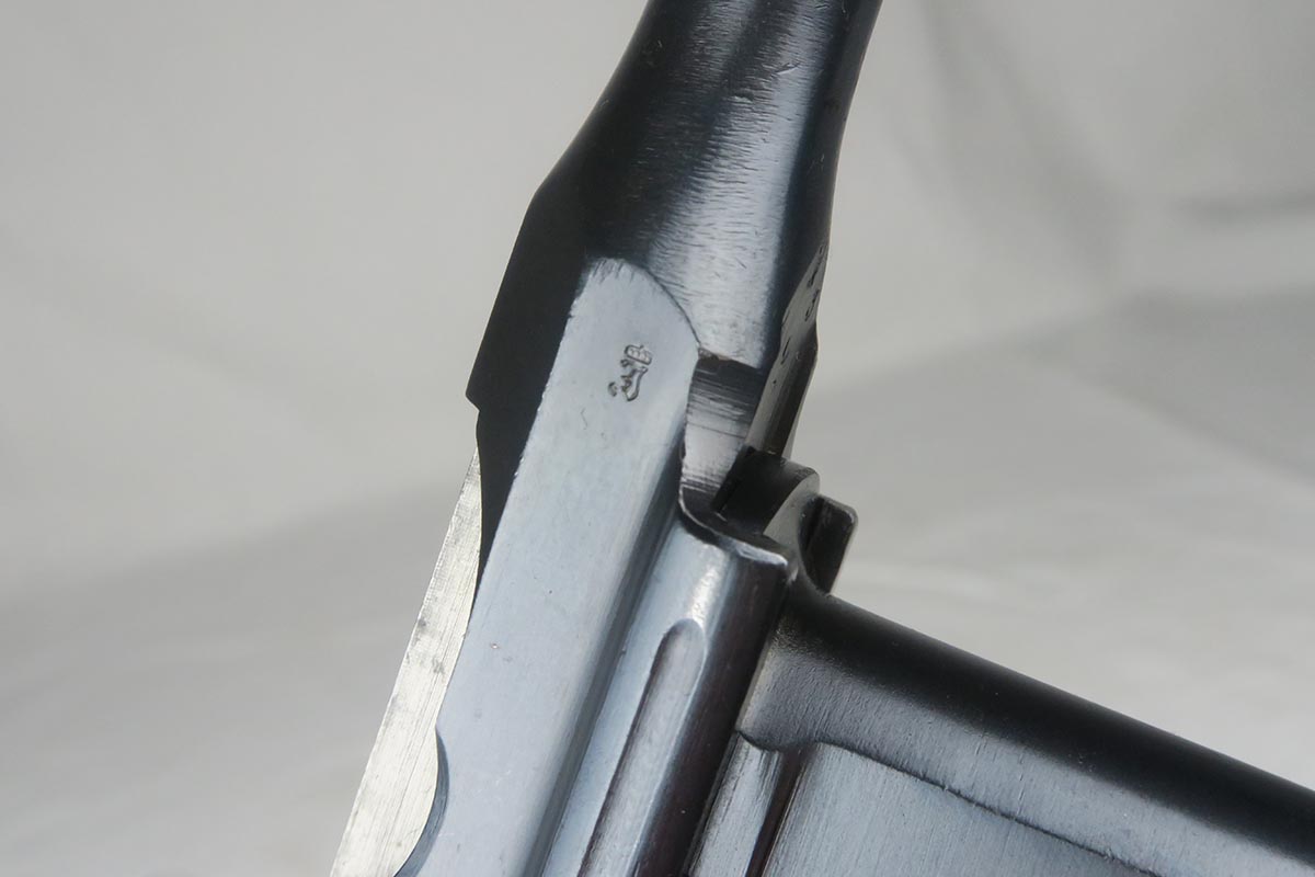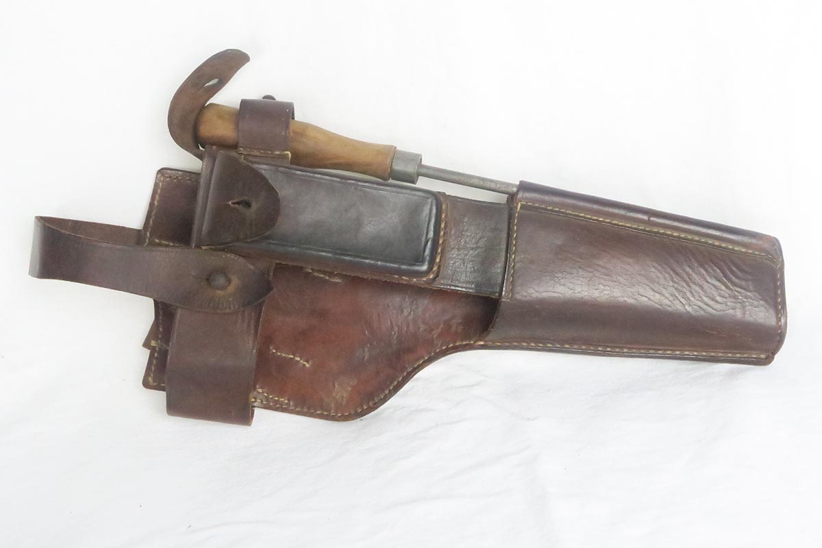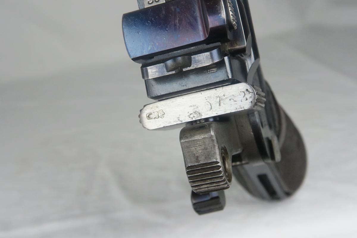 11/13/17 – This is a very scarce variation of WWI German Imperial contract Broomhandle pistol. Most of the so called “war time commercial” pistols were within the same serial number range as the rest of the commercial C96 pistols, but carried a German Army acceptance mark on the right chamber. However, there was a very small number of guns that were in their own serial range, similar to the “Red 9” broomhandles. It is unclear why certain guns were assigned a separate serial range, but only a few are known to exist and this is one of these guns. It is all matching, including the shoulder stock.  It is in superb 99% original condition, with just a slightest wear under the barrel from sliding in and out of the shoulder stock. The stock is in nice condition, with a tiny but stable hairline crack that has no wood movement around it. The leather harness is in great shape and is original and marked “Germany” on the closure strap.