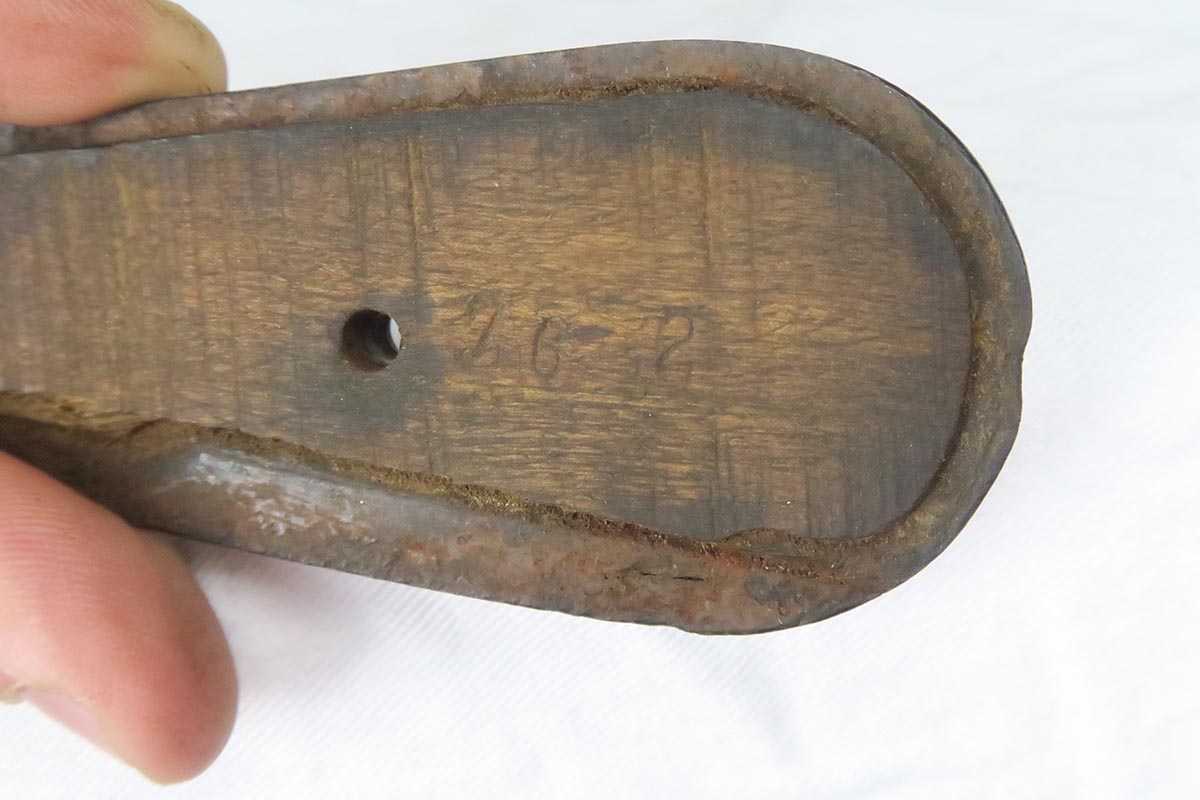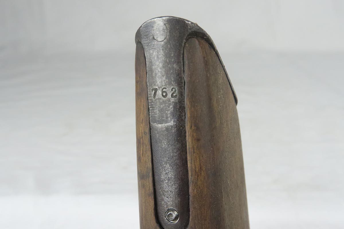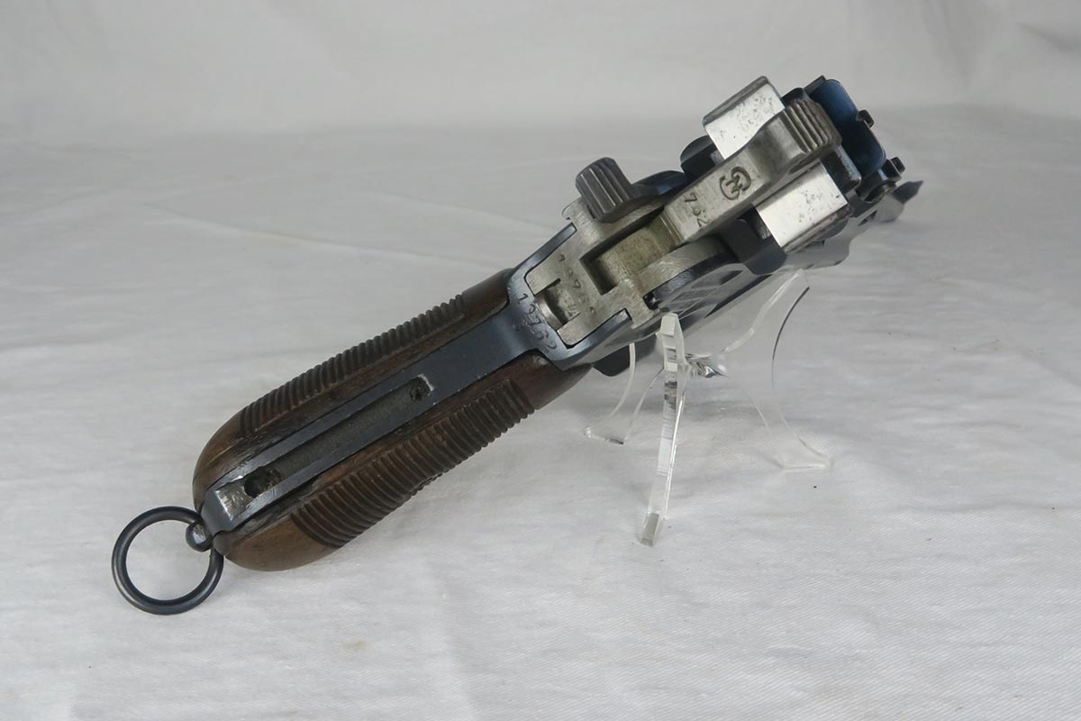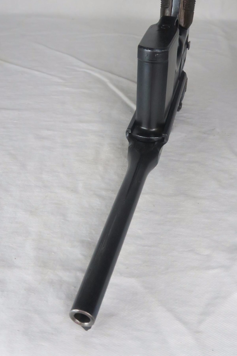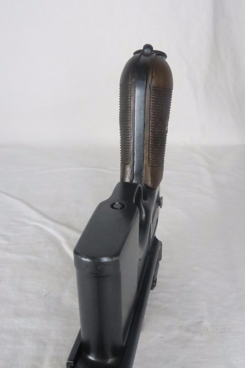11/13/17 – This is a very scarce variation of WWI German Imperial contract Broomhandle pistol. Most of the so called “war time commercial” pistols were within the same serial number range as the rest of the commercial C96 pistols, but carried a German Army acceptance mark on the right chamber. However, there was a very small number of guns that were in their own serial range, similar to the “Red 9” broomhandles. It is unclear why certain guns were assigned a separate serial range, but only a few are known to exist and this is one of these guns. It is all matching, including the shoulder stock.  It is in superb 99% original condition, with just a slightest wear under the barrel from sliding in and out of the shoulder stock. The stock is in nice condition, with a tiny but stable hairline crack that has no wood movement around it. The leather harness is in great shape and is original and marked “Germany” on the closure strap.