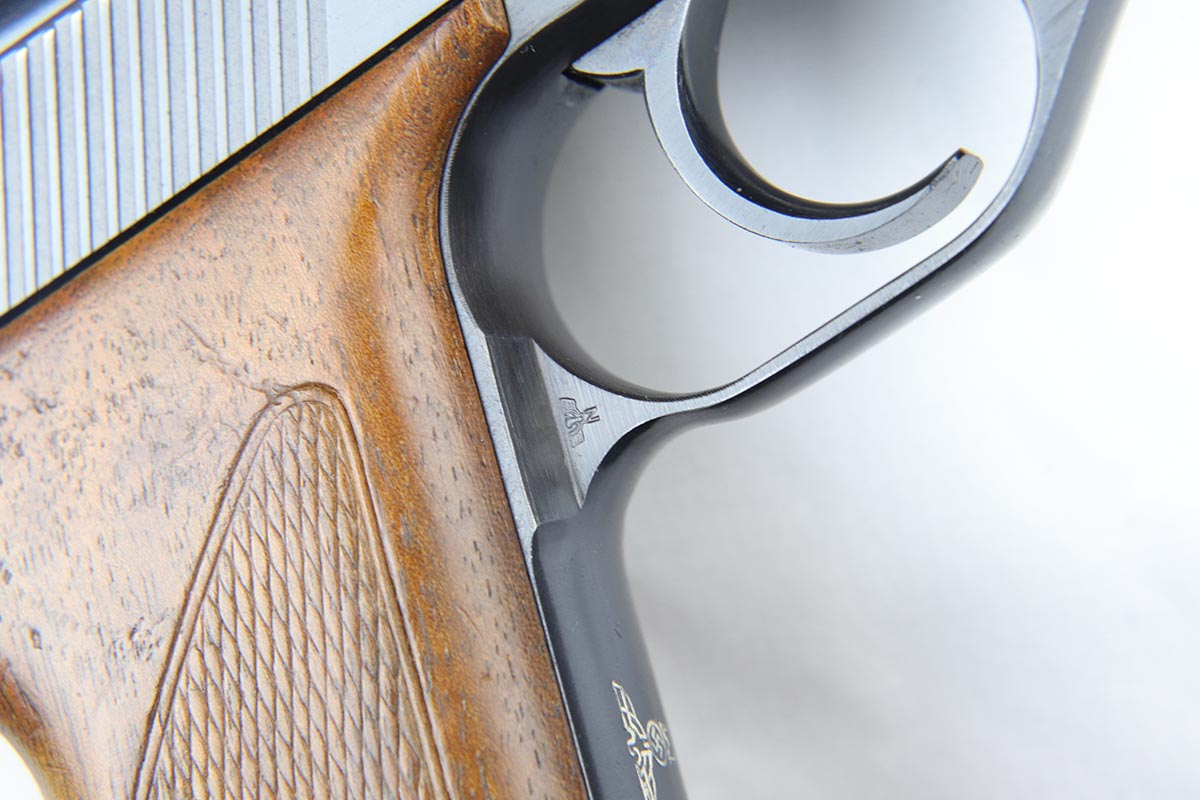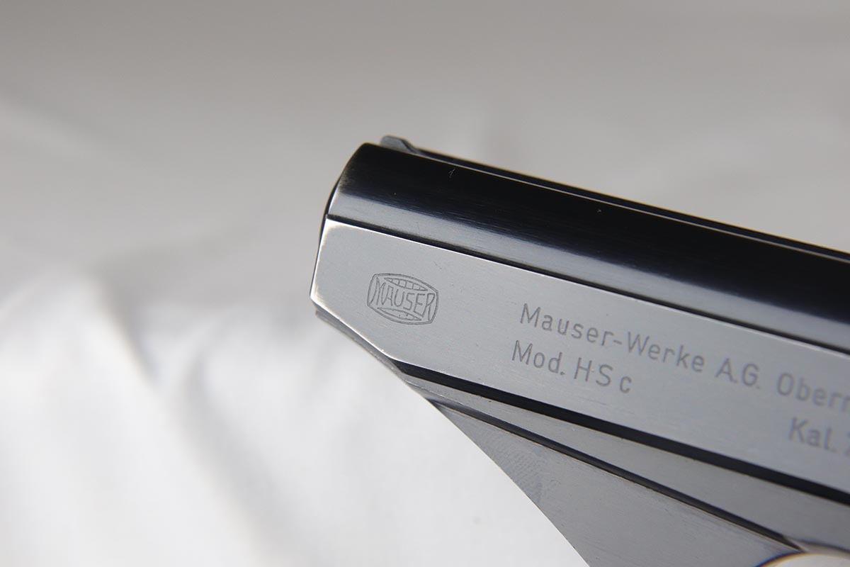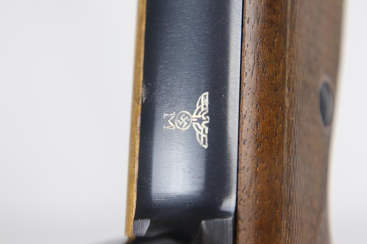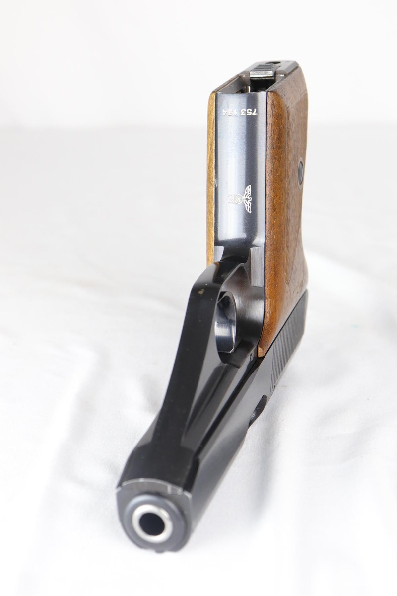 4/16/18 – This is an early Nazi Navy marked HSc. The high polish finish is about 98% and the frame, slide and locking block are all matching. It is in the correct serial range for a variation 2 Navy pistol, which has the Nazi Navy insignia on the front strap. There were only 7,000 of this variation produced. The grips are excellent as well with no chips or cracks. Comes with the correct early Mauser banner magazine as well. Early style Lanyard loop built into the frame. Mirror bore.