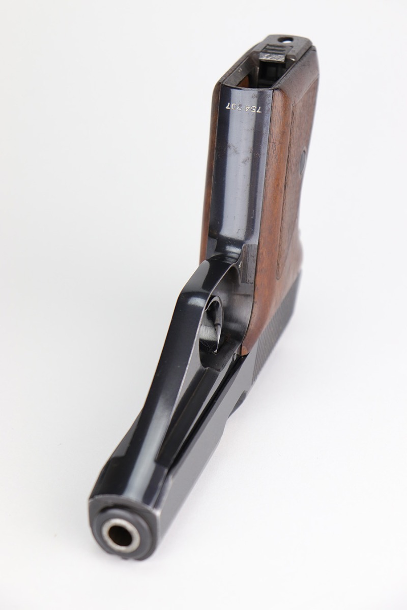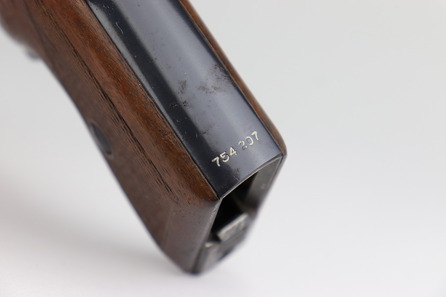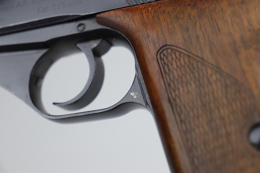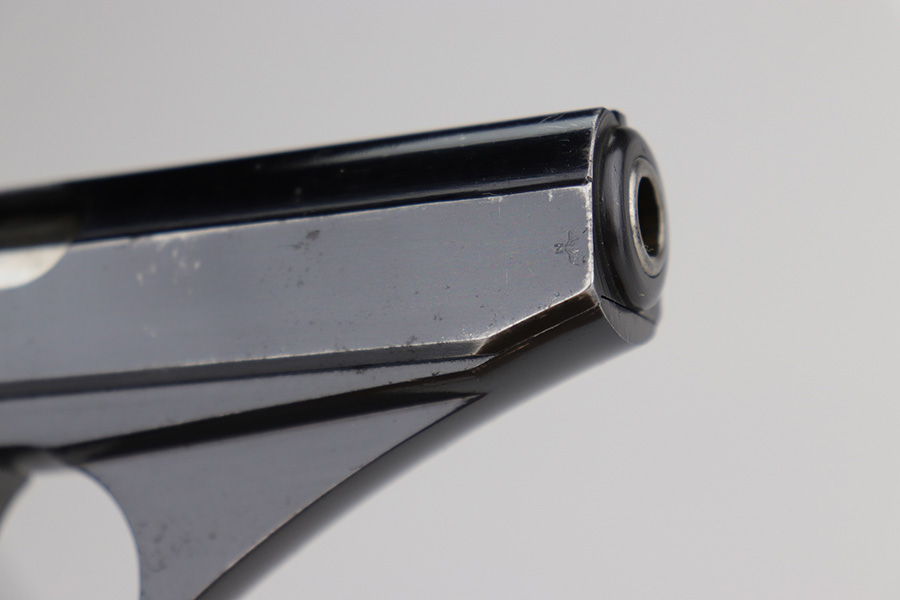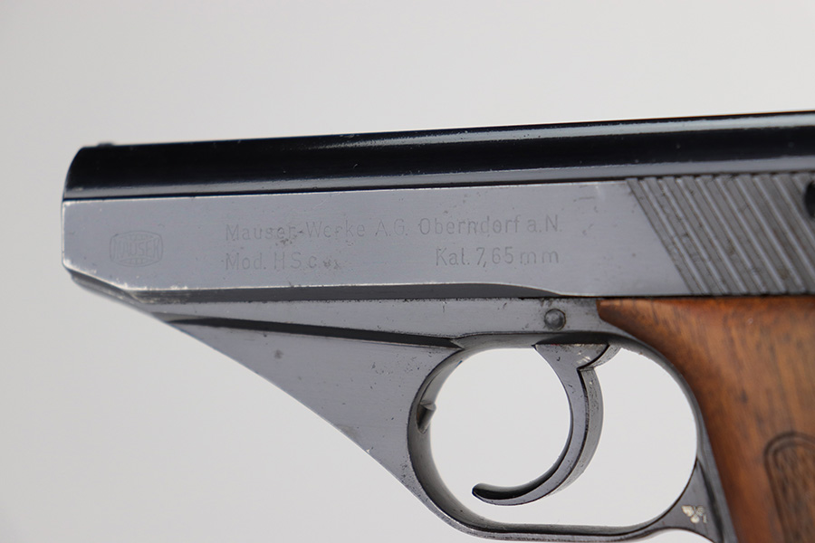 12/17/22 – This is a minty example of a Mauser HSC that was issued to the Nazi Police Force in 1942. It is all matching and has the proper Nazi police “Eagle L” proof on the left side of the trigger guard. It has retained nearly all of its original and early high polish finish. There is just very minor muzzle wear and some very light spotty wear on the right side of the slide. While there is next-to-no actual finish loss, there is some freckling on the grip straps and an area of minor pitting on the front strap. Fitted with a set of very nice period-correct wood grips (some minor bruising on the right side) and comes with one proper magazine. Near-mint bore.