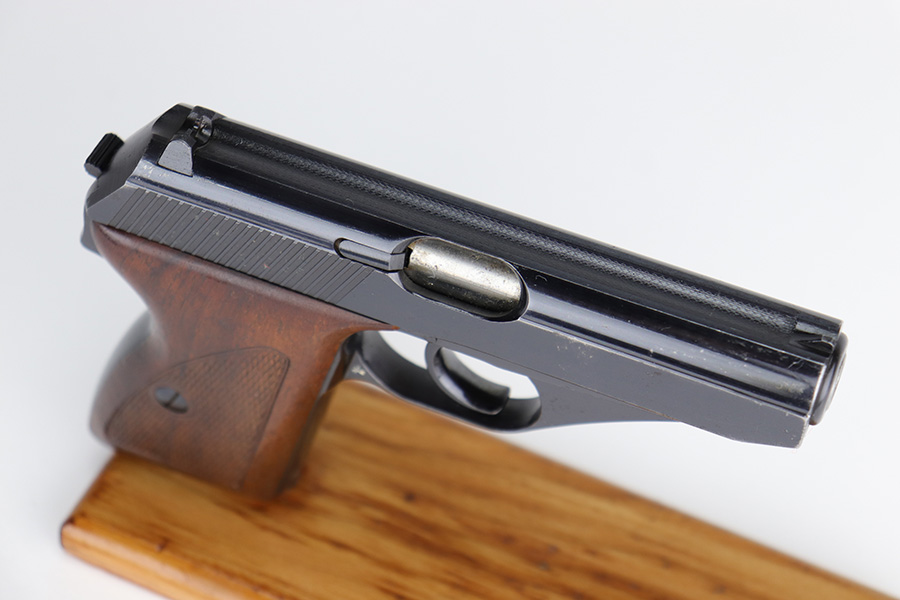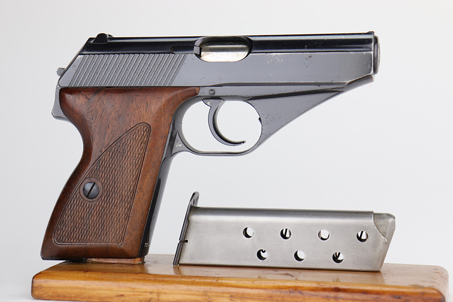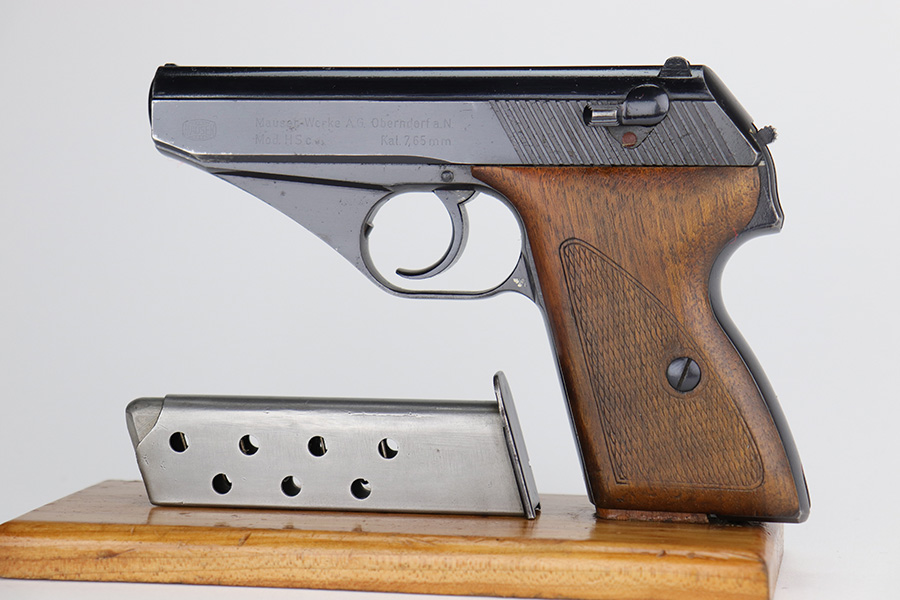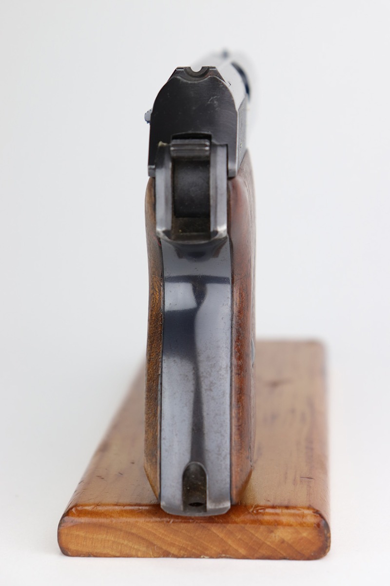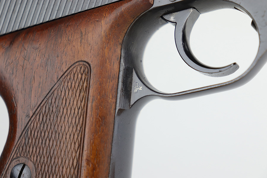 12/17/22 – This is a minty example of a Mauser HSC that was issued to the Nazi Police Force in 1942. It is all matching and has the proper Nazi police “Eagle L” proof on the left side of the trigger guard. It has retained nearly all of its original and early high polish finish. There is just very minor muzzle wear and some very light spotty wear on the right side of the slide. While there is next-to-no actual finish loss, there is some freckling on the grip straps and an area of minor pitting on the front strap. Fitted with a set of very nice period-correct wood grips (some minor bruising on the right side) and comes with one proper magazine. Near-mint bore.