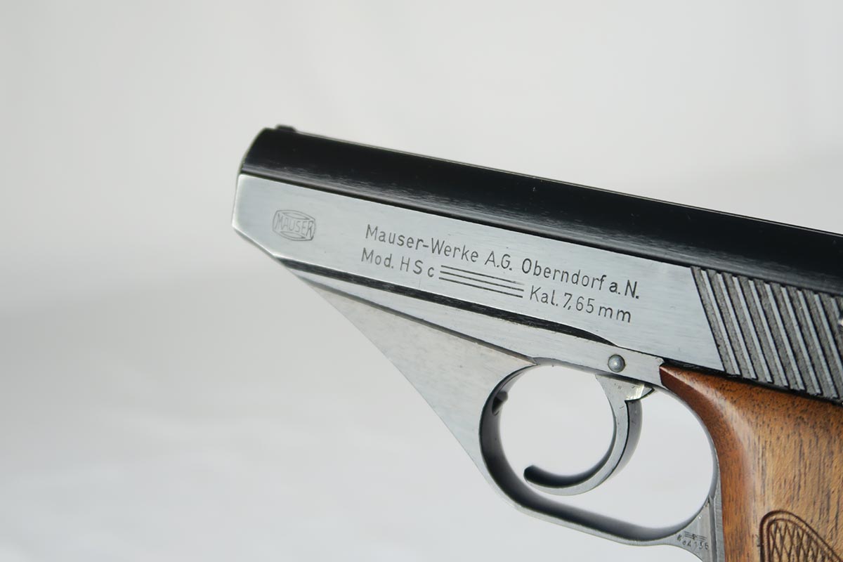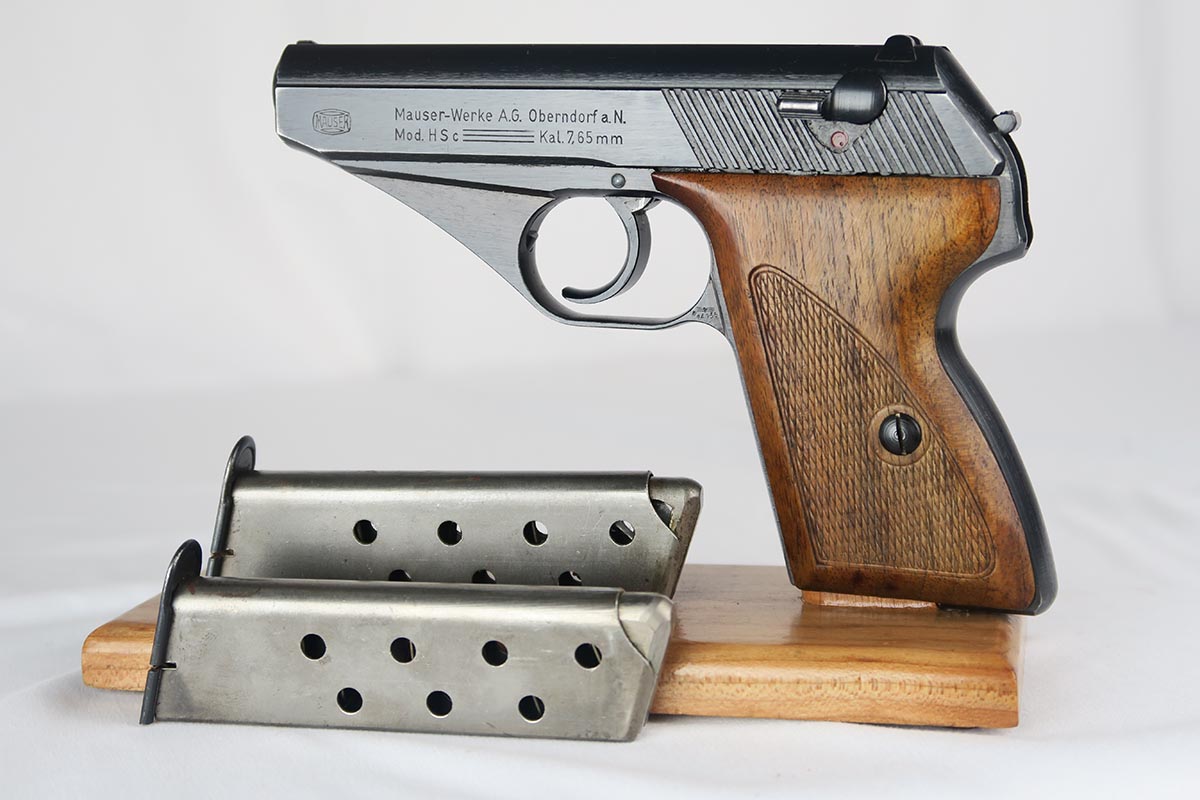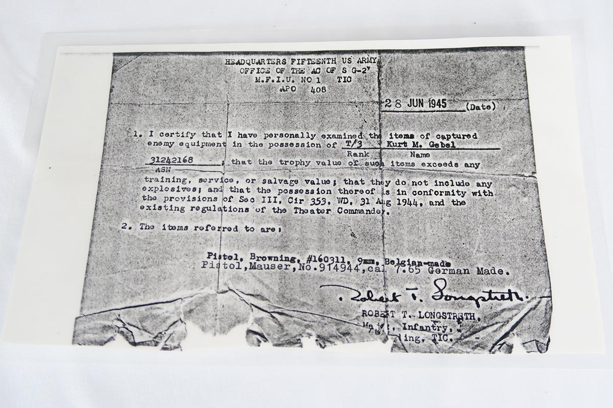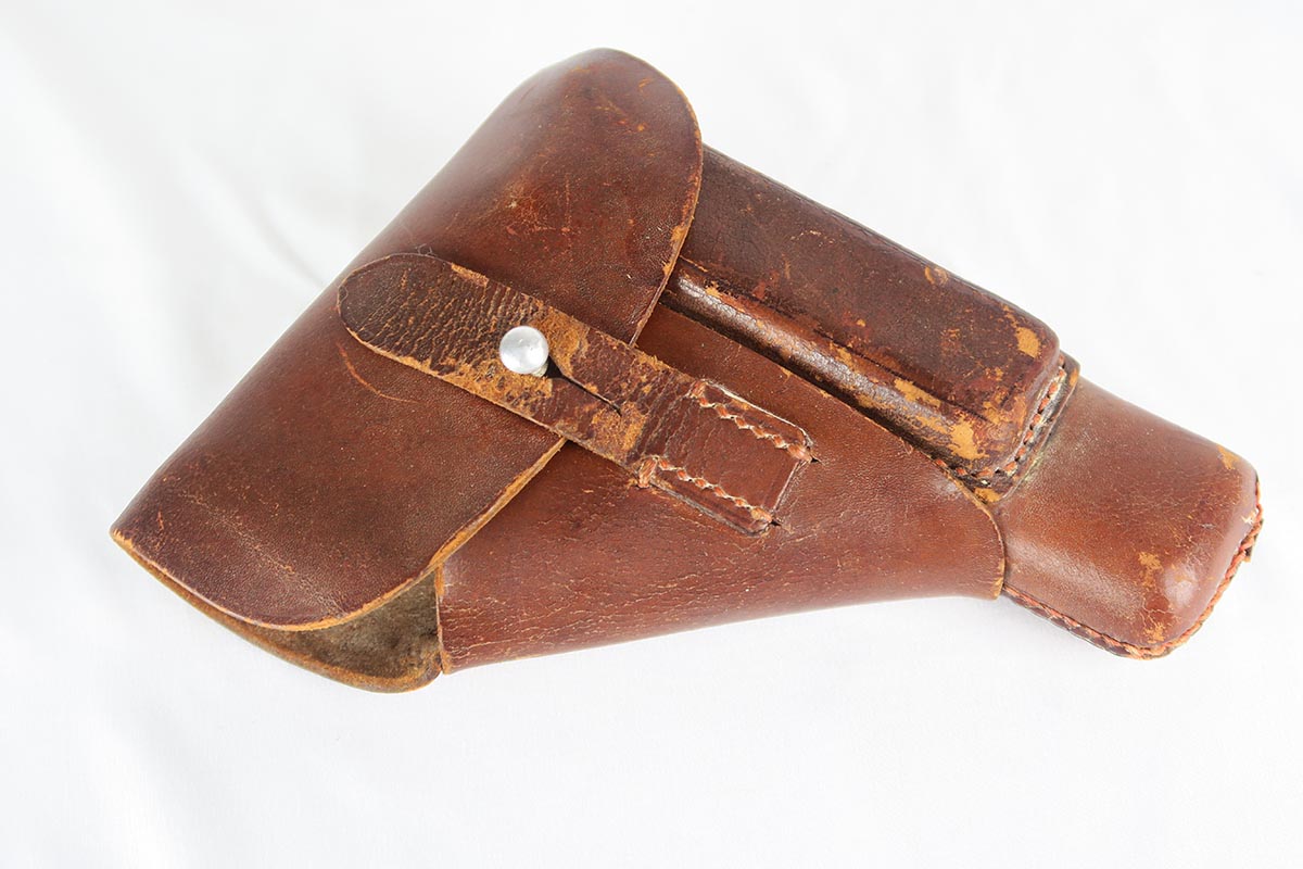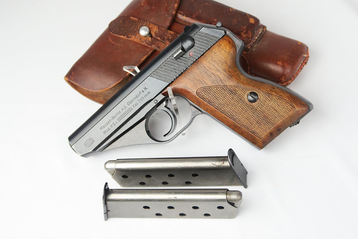 2/14/18 – This is a near-mint Mauser HSc rig with copy of the original capture document, spare magazine and Akah marked holster. The pistol is army-issued, with WaA135 proof on left side trigger guard. The finish rates at 99% with minor edge wear and a mint bore. The rig includes two total half-moon magazines, and an Akah marked holster which is numbered to the pistol on the interior and is Mauser inkstamped. The pistol comes with a laminated copy of the original capture document, which was separated from this pistol as it was kept with the other gun listed on the document. The pistol was brought back from the war by Technician third grade, Kurt Gebel, in June of 1945.