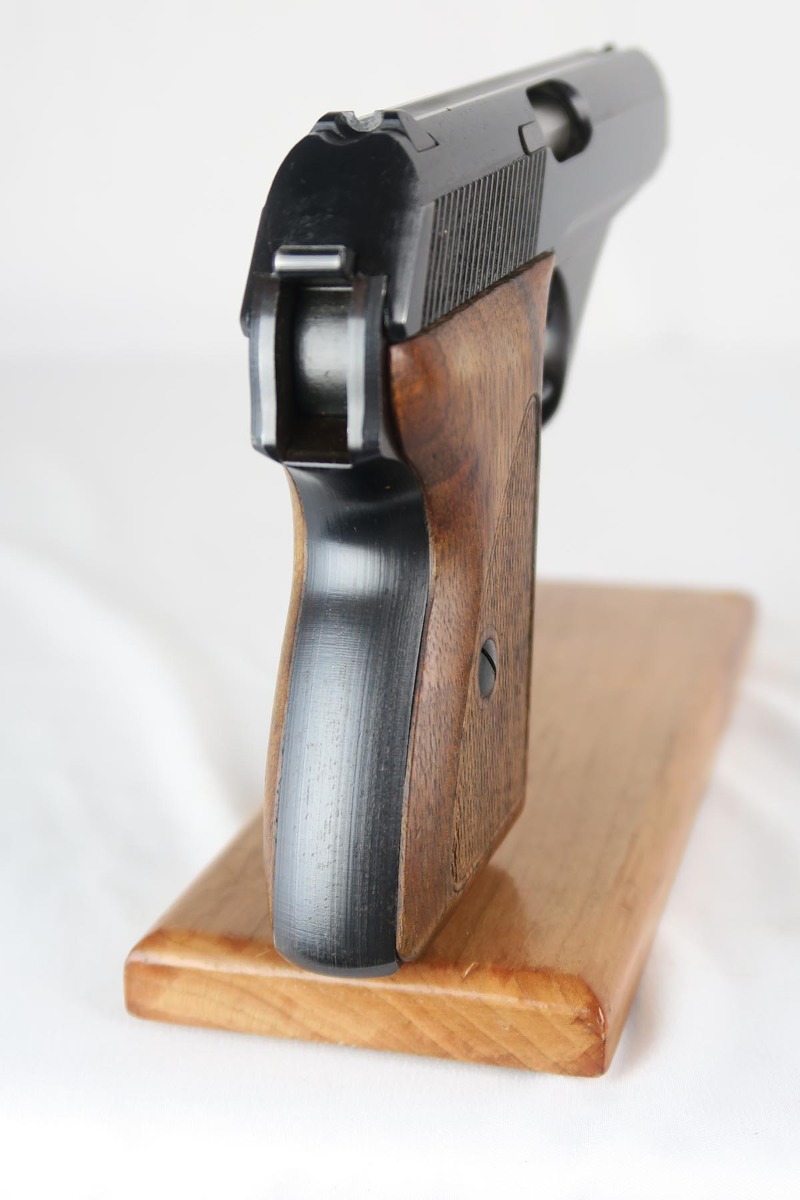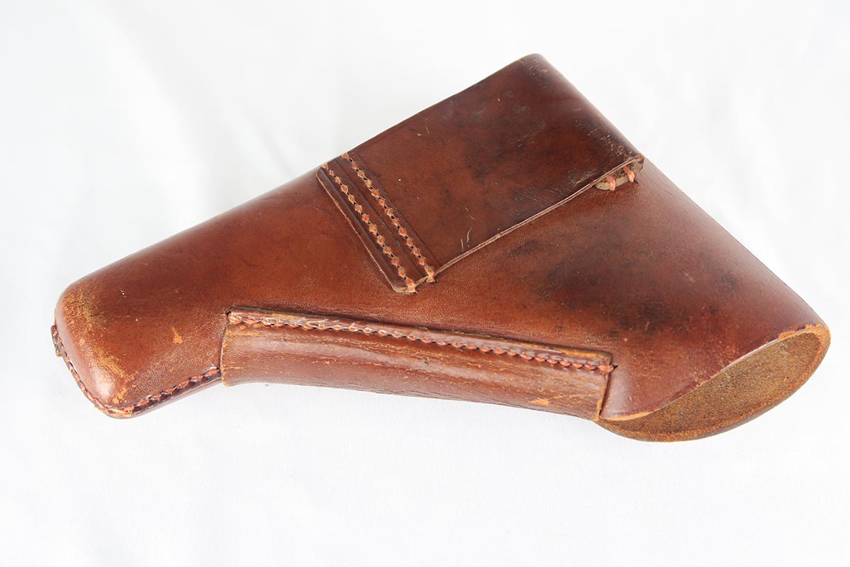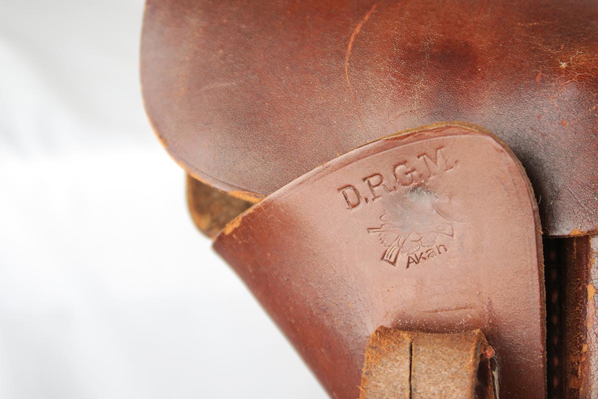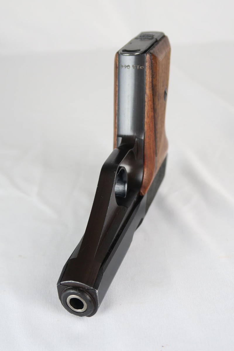 2/14/18 – This is a near-mint Mauser HSc rig with copy of the original capture document, spare magazine and Akah marked holster. The pistol is army-issued, with WaA135 proof on left side trigger guard. The finish rates at 99% with minor edge wear and a mint bore. The rig includes two total half-moon magazines, and an Akah marked holster which is numbered to the pistol on the interior and is Mauser inkstamped. The pistol comes with a laminated copy of the original capture document, which was separated from this pistol as it was kept with the other gun listed on the document. The pistol was brought back from the war by Technician third grade, Kurt Gebel, in June of 1945.