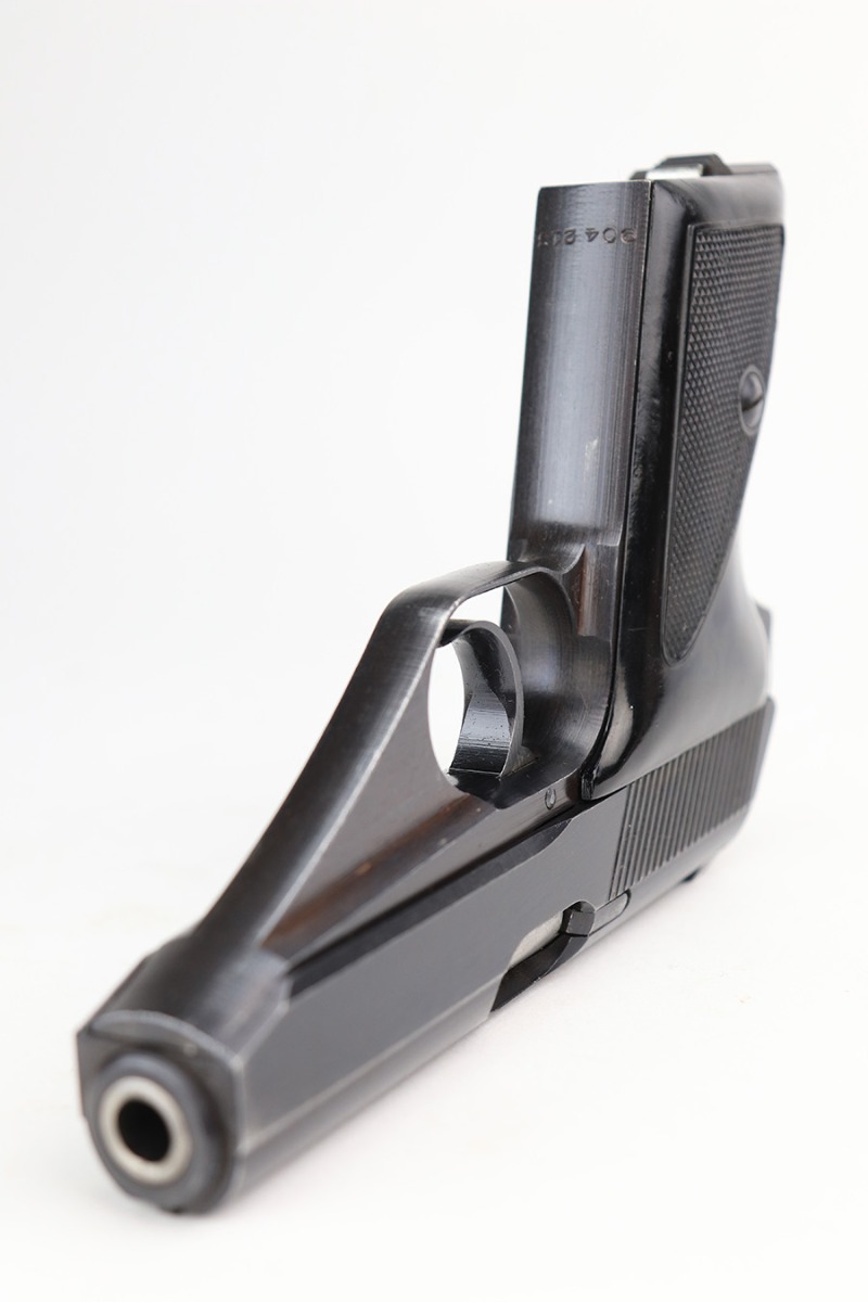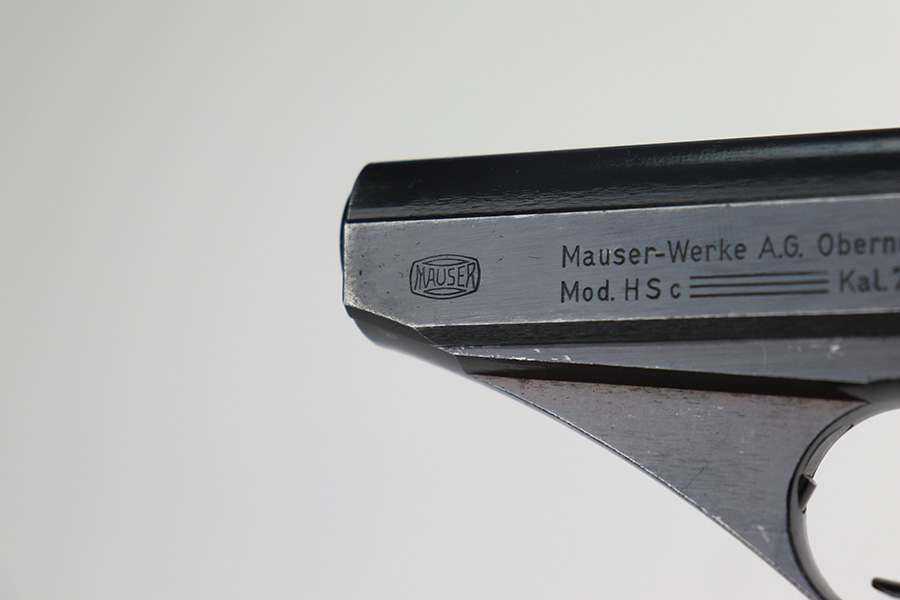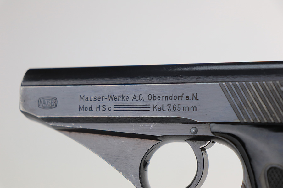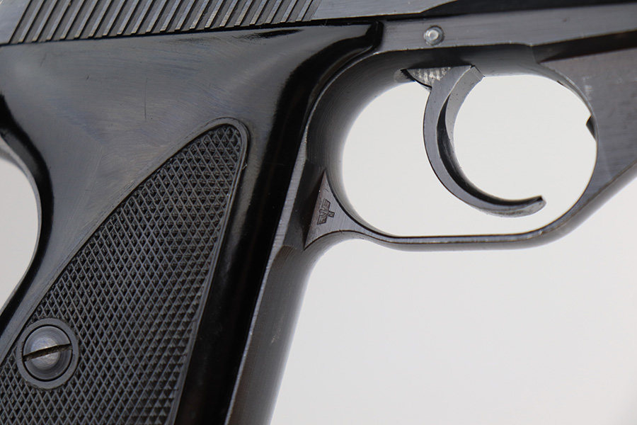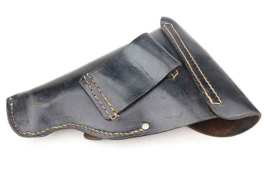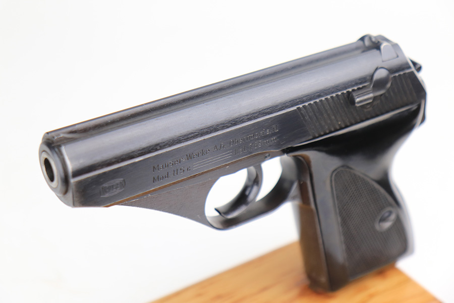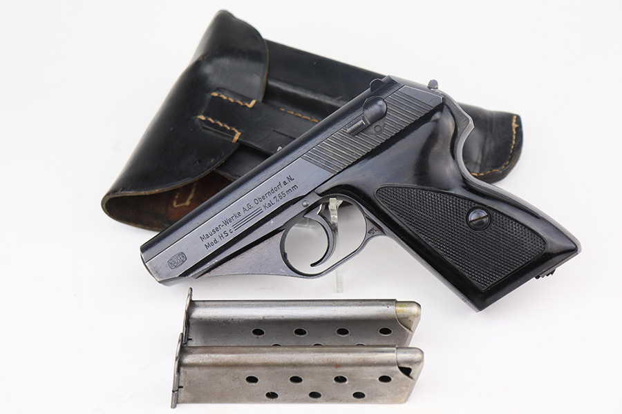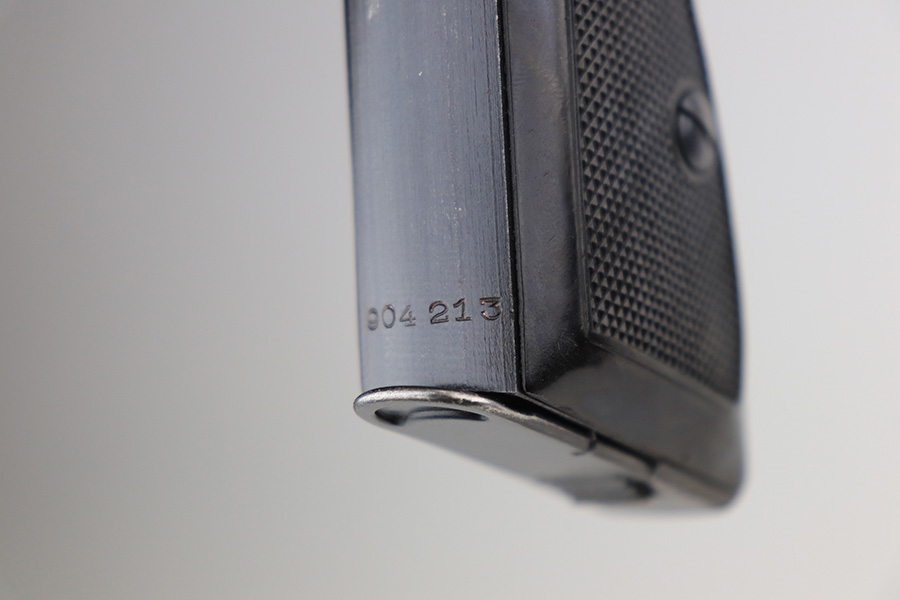3/1/22 – This is a near-mint example of a Mauser HSC issued to the Nazi police force in 1944. The gun is all matching and has the proper Nazi police “Eagle L” proof on the left side of the frame. It comes as a rig with an excellent black leather police holster and two period-correct magazines. The gun comes with a set of excellent and scarce black bakelite grips. The gun has retained about 98% of its original bluing. There is just very minor wear around the muzzle. The bore is mint.