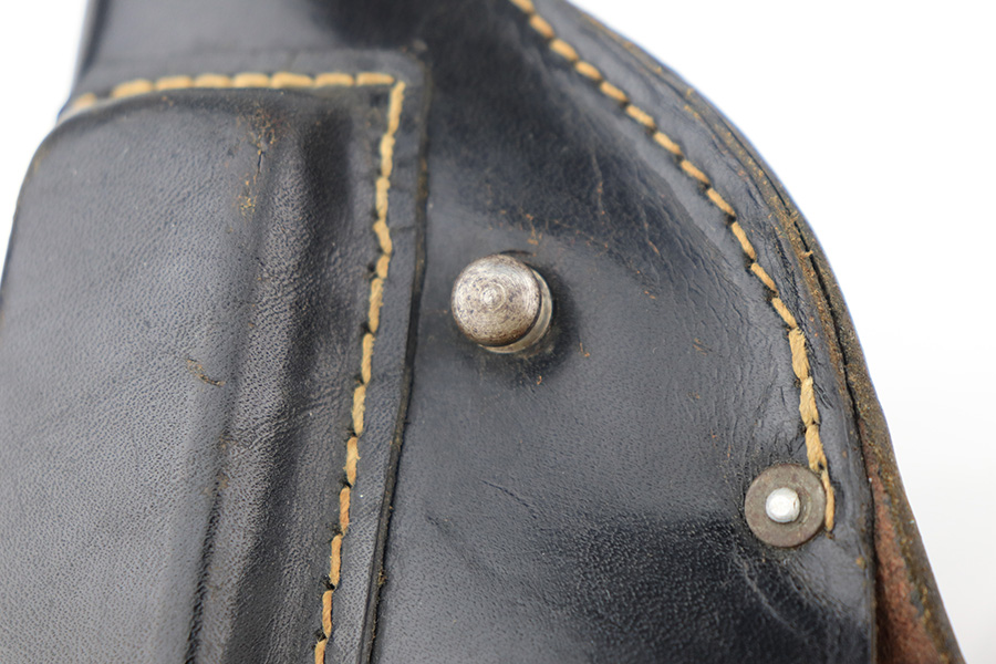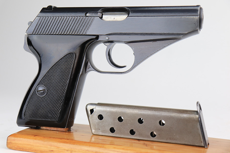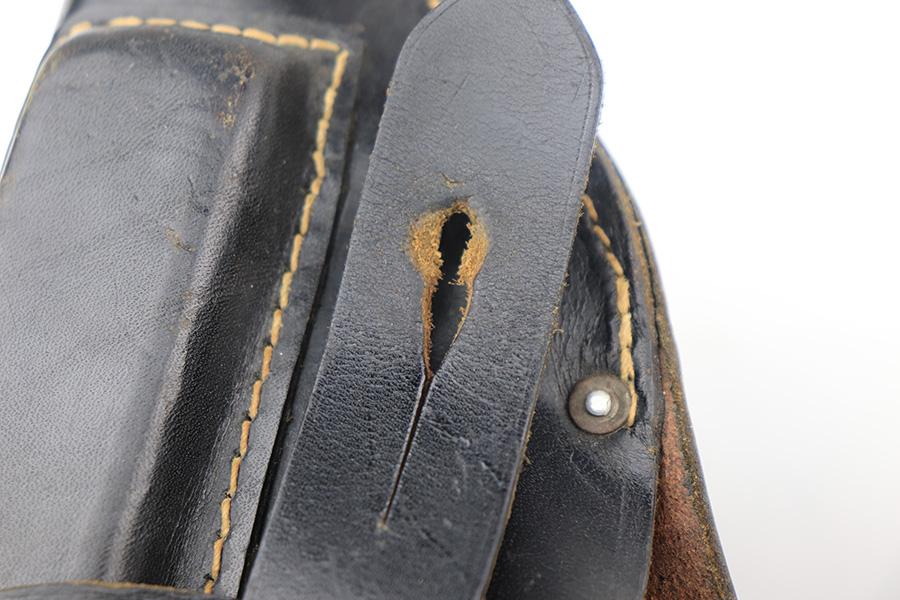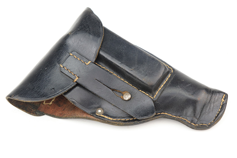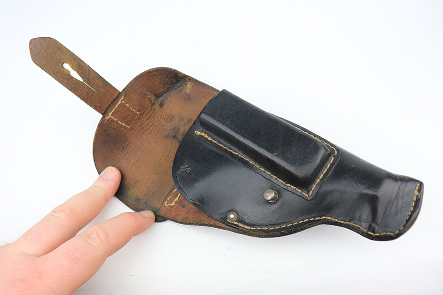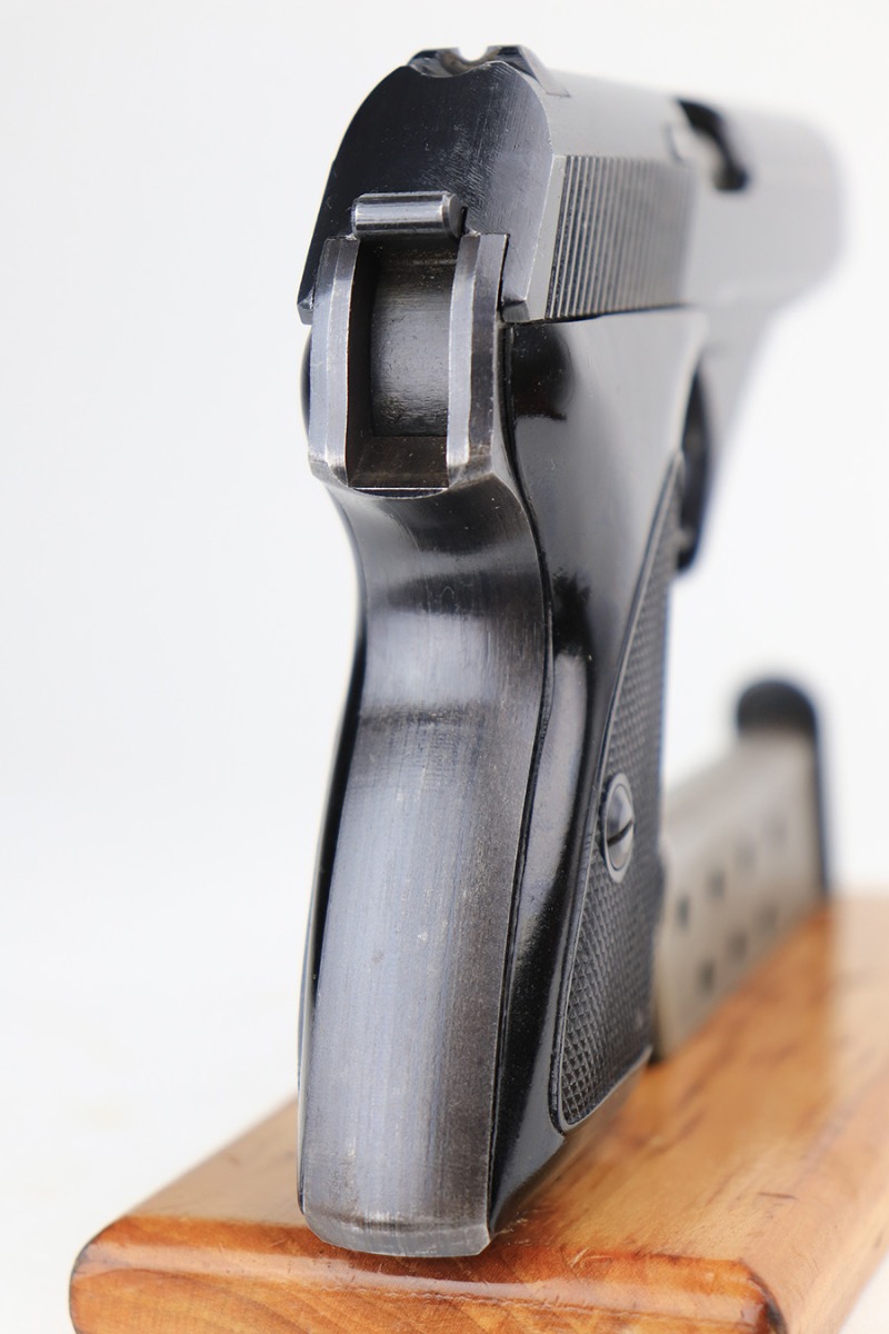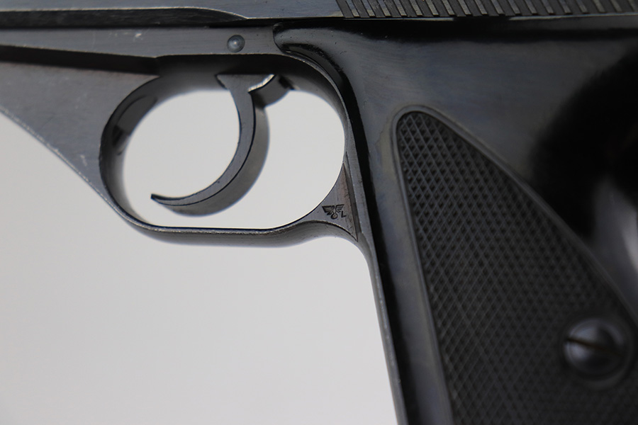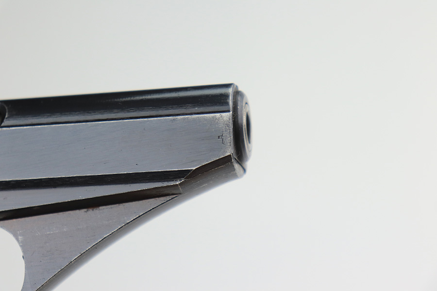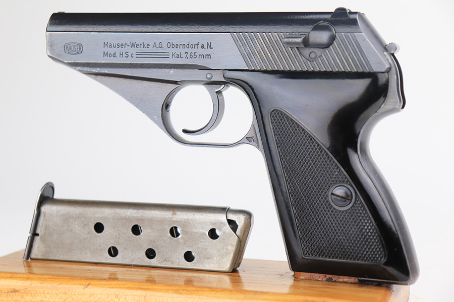 3/1/22 – This is a near-mint example of a Mauser HSC issued to the Nazi police force in 1944. The gun is all matching and has the proper Nazi police “Eagle L” proof on the left side of the frame. It comes as a rig with an excellent black leather police holster and two period-correct magazines. The gun comes with a set of excellent and scarce black bakelite grips. The gun has retained about 98% of its original bluing. There is just very minor wear around the muzzle. The bore is mint.