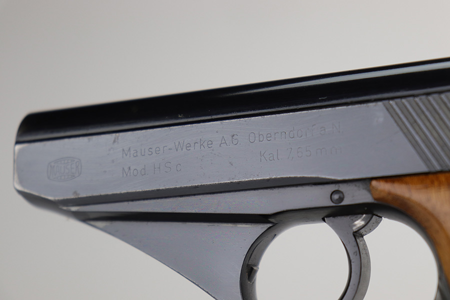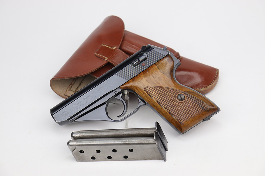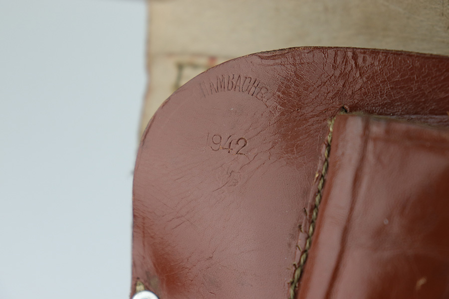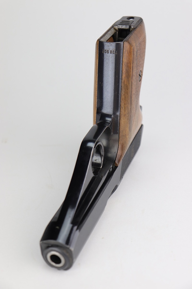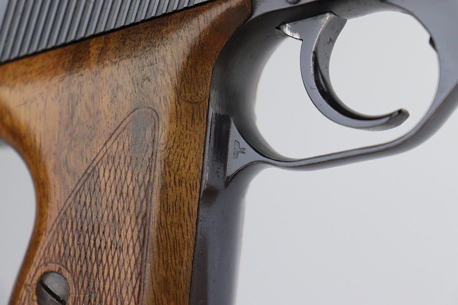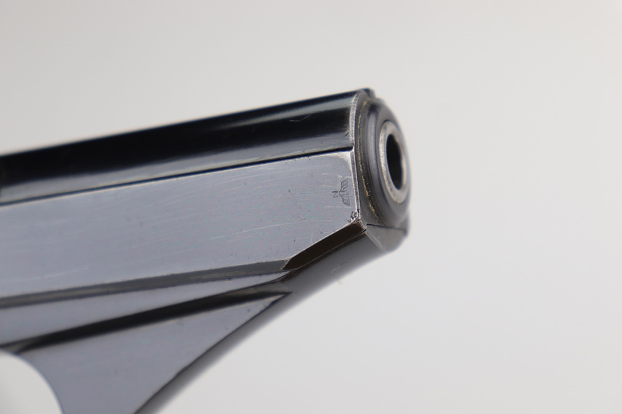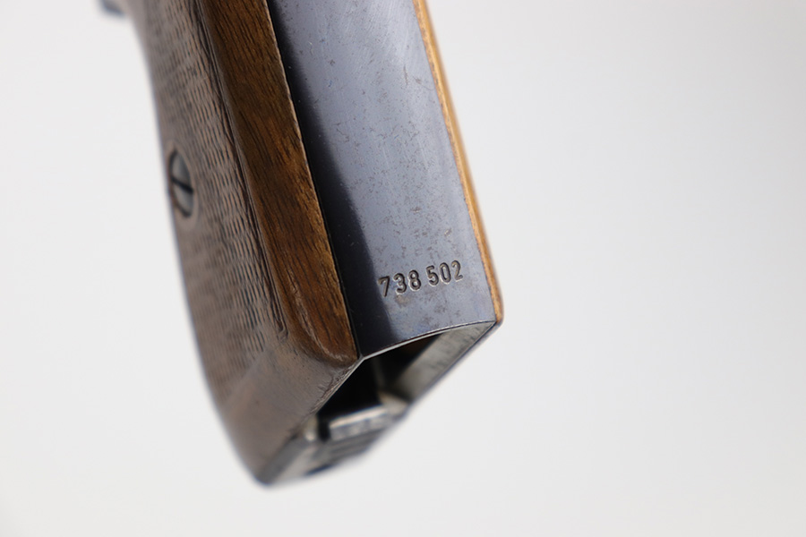 1/10/23 – This is a near-mint example of an early Mauser HSC that was issued to the Nazi Police Force in 1941. It is all matching and has the proper Nazi police “Eagle L” proof on the left side of the trigger guard. It comes as a rig with two period-correct magazines and an un-issued 1942-dated tan leather police-marked holster. The gun has retained nearly all of its original high polish finish with just a hint of wear around the muzzle and some pin-pricking on both grip straps. Fitted with a very nice set of period-correct wood grips – some very minor bruising on both sides. Mint bore.