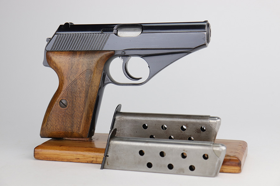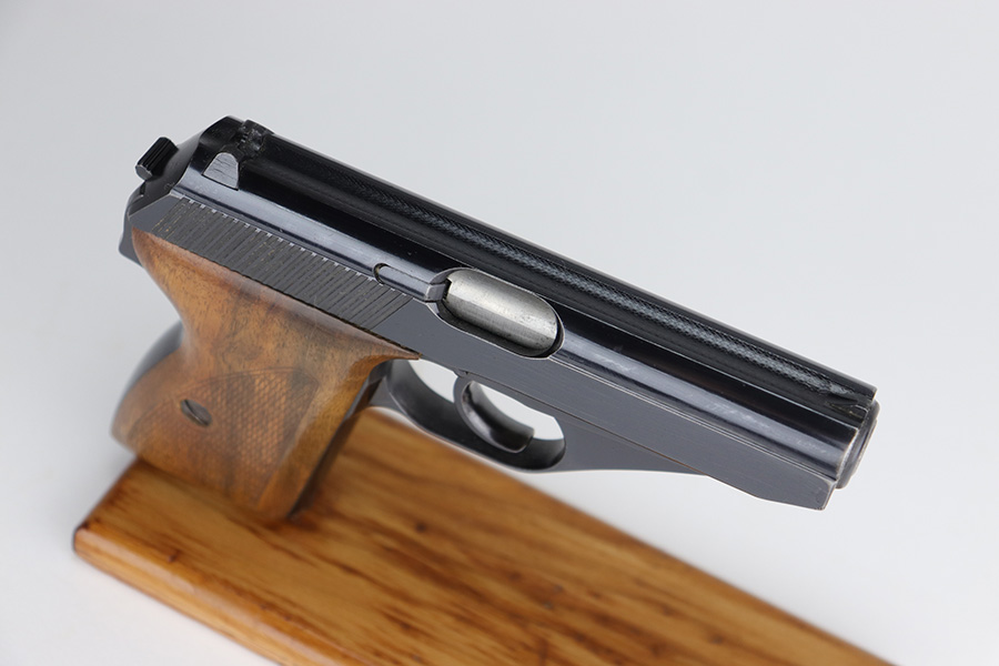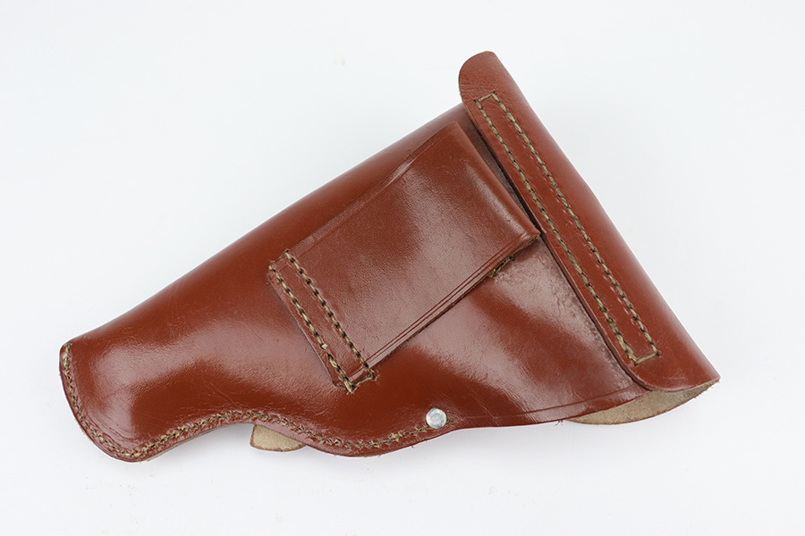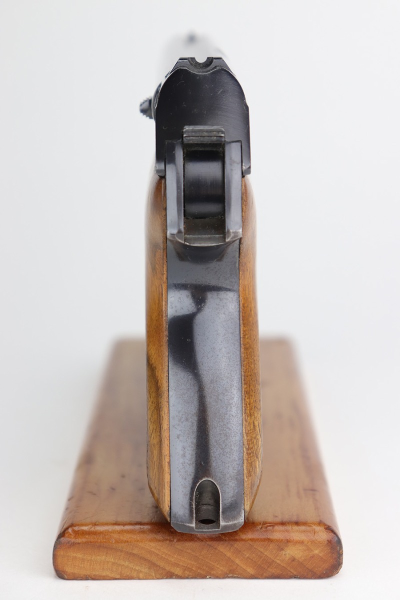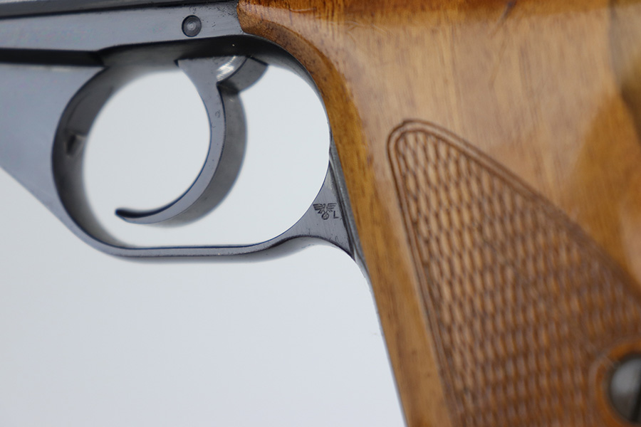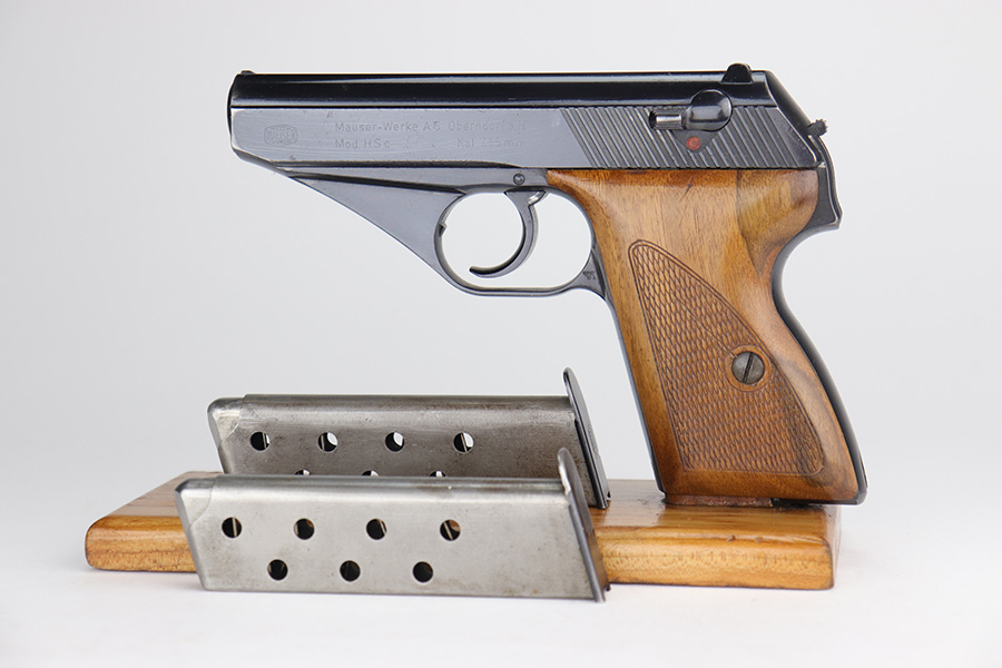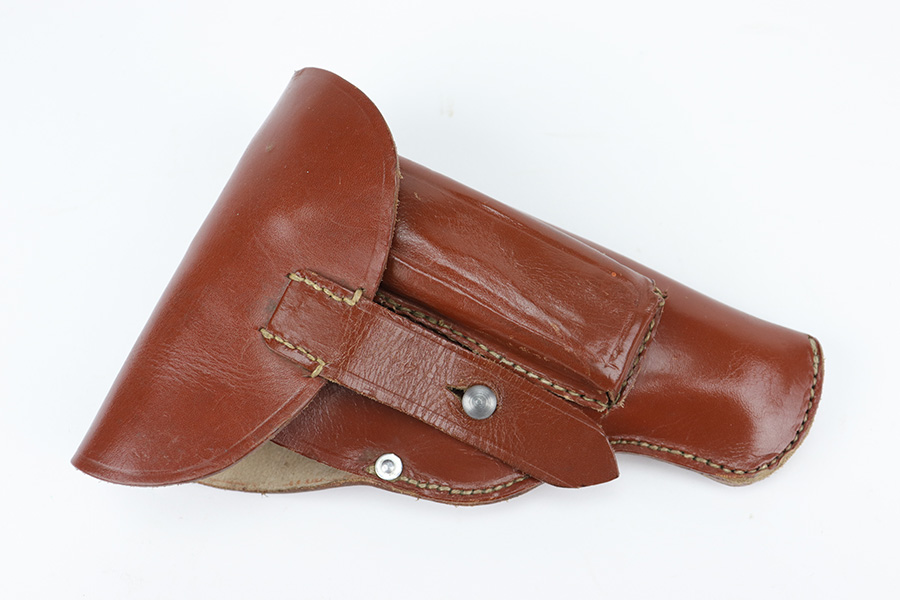 1/10/23 – This is a near-mint example of an early Mauser HSC that was issued to the Nazi Police Force in 1941. It is all matching and has the proper Nazi police “Eagle L” proof on the left side of the trigger guard. It comes as a rig with two period-correct magazines and an un-issued 1942-dated tan leather police-marked holster. The gun has retained nearly all of its original high polish finish with just a hint of wear around the muzzle and some pin-pricking on both grip straps. Fitted with a very nice set of period-correct wood grips – some very minor bruising on both sides. Mint bore.