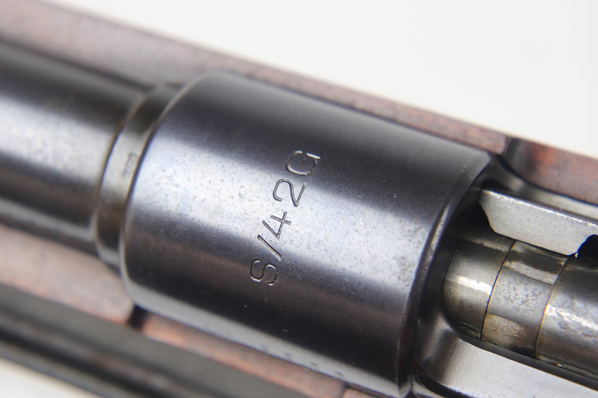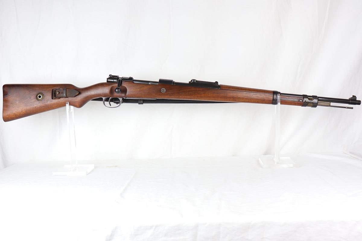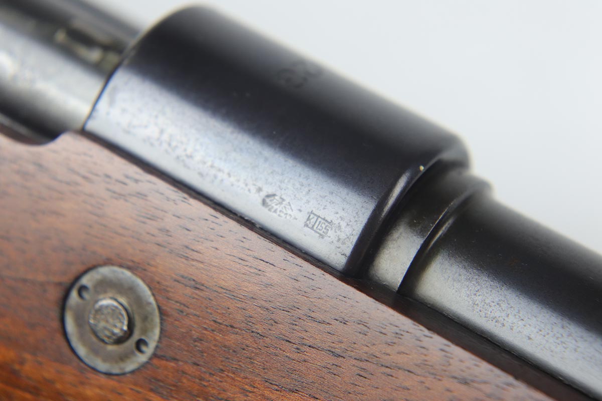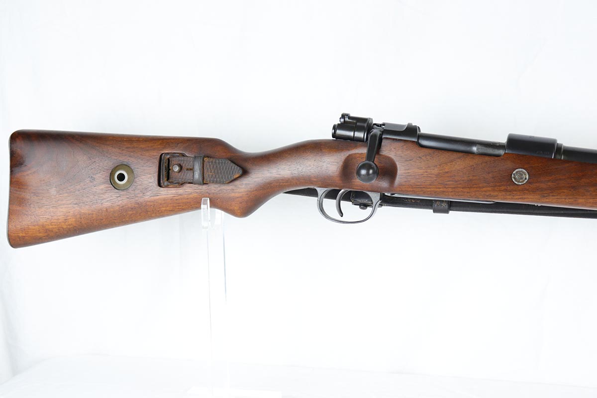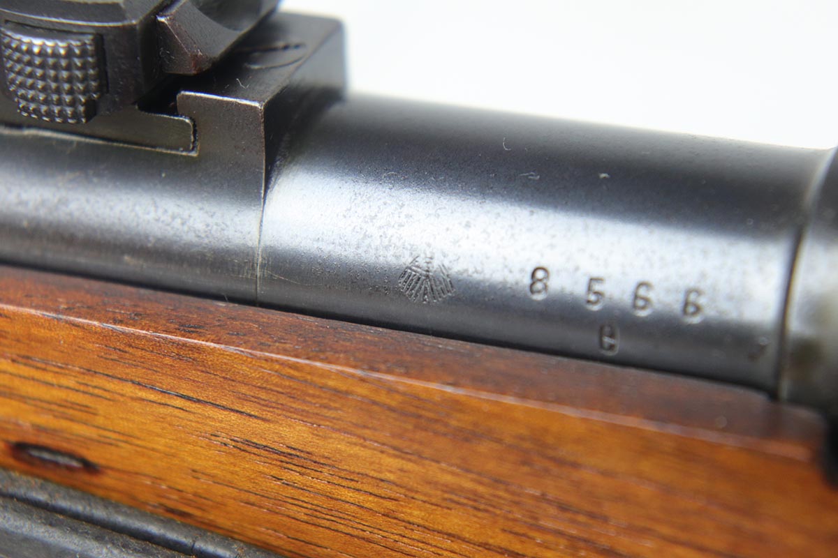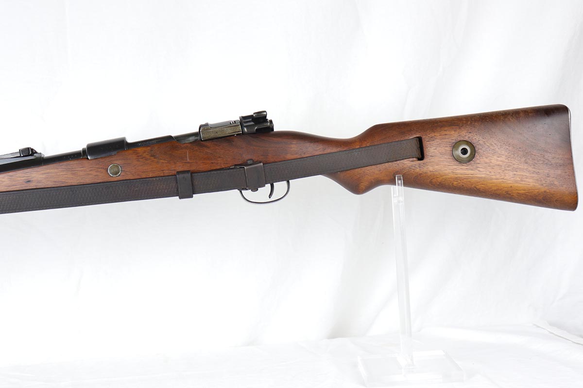 12/3/18 – This is a rare G Date Mauser K98, manufactured in 1935 and featuring all matching numbers and original finish. Introduced during the early years of the Nazi Party’s dominance of Germany, the code system was intended to obscure the scale and speed of German re-armament, and all correct G Date K98s are seldom available to the collector market. The original finish rates at about 96-98% with the majority of the finish loss on the bolt release and the left side lip of the receiver. The bayo lug and area under the front barrel band are ‘in the white’, a feature of these early rifles that helps to ensure original bluing. All numbered parts match the receiver, including the hand guard, as well as the stock (internally numbered) and butt plate. Stock is gorgeous but may have been lightly sanded. Loads of early acceptance proofs adorn this rifle as well. The sling well is marked with DRP which indicates (I believe) that it was issued to local militia while the German army was still hiding their actual numbers. Comes with an original sling and cleaning rod. Terrifc bore.