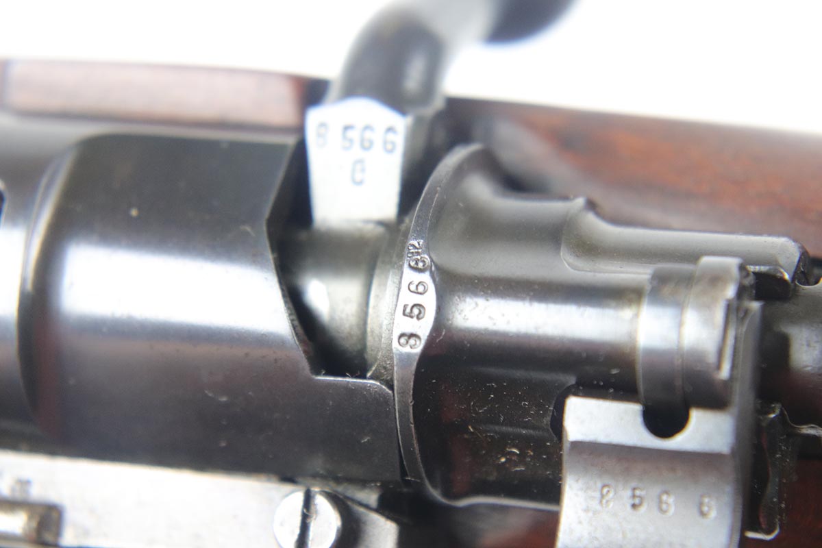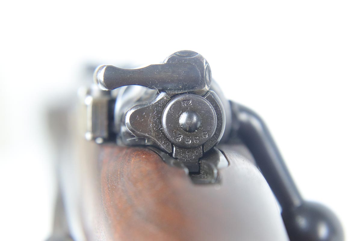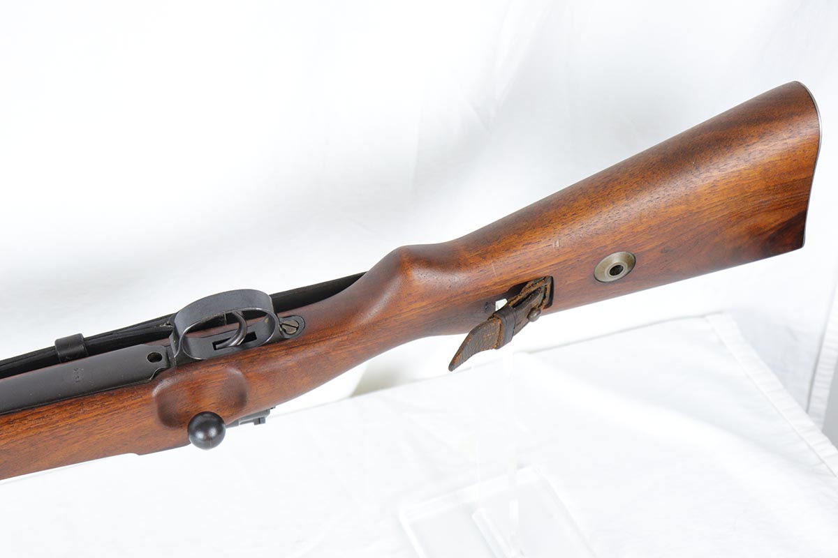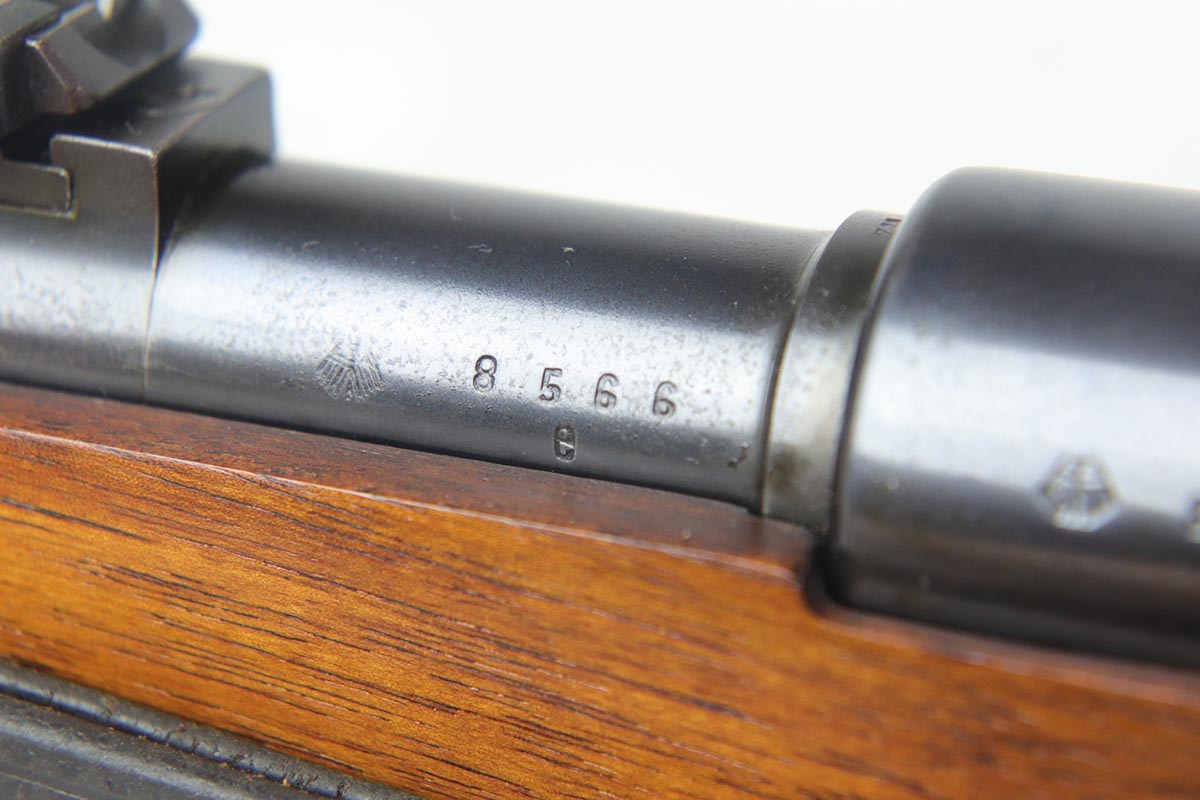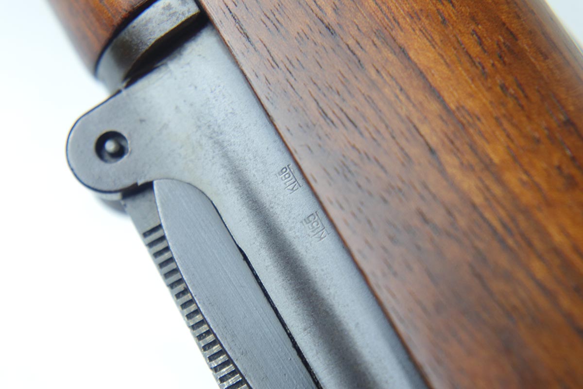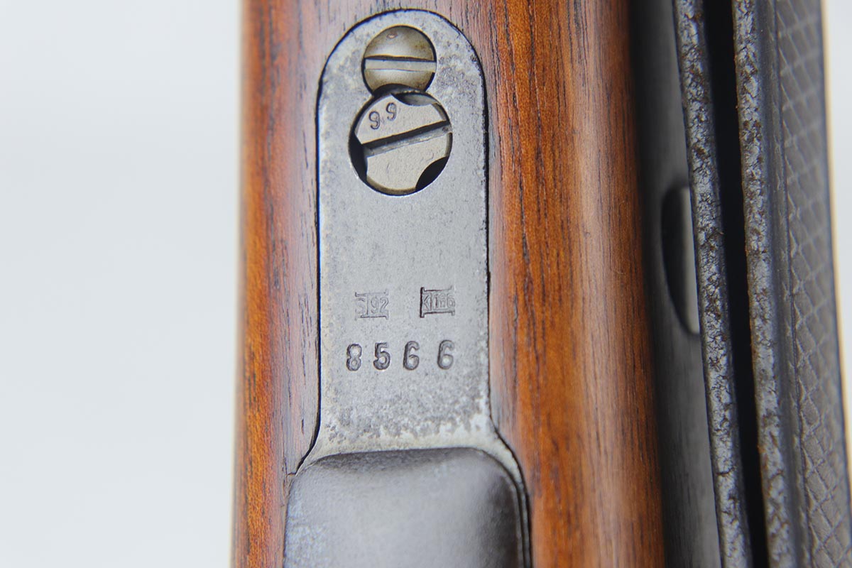 12/3/18 – This is a rare G Date Mauser K98, manufactured in 1935 and featuring all matching numbers and original finish. Introduced during the early years of the Nazi Party’s dominance of Germany, the code system was intended to obscure the scale and speed of German re-armament, and all correct G Date K98s are seldom available to the collector market. The original finish rates at about 96-98% with the majority of the finish loss on the bolt release and the left side lip of the receiver. The bayo lug and area under the front barrel band are ‘in the white’, a feature of these early rifles that helps to ensure original bluing. All numbered parts match the receiver, including the hand guard, as well as the stock (internally numbered) and butt plate. Stock is gorgeous but may have been lightly sanded. Loads of early acceptance proofs adorn this rifle as well. The sling well is marked with DRP which indicates (I believe) that it was issued to local militia while the German army was still hiding their actual numbers. Comes with an original sling and cleaning rod. Terrifc bore.