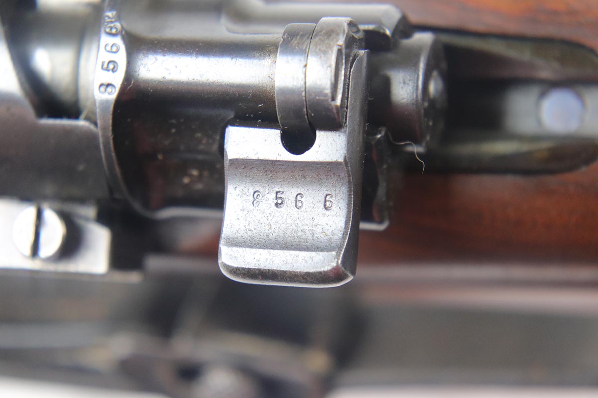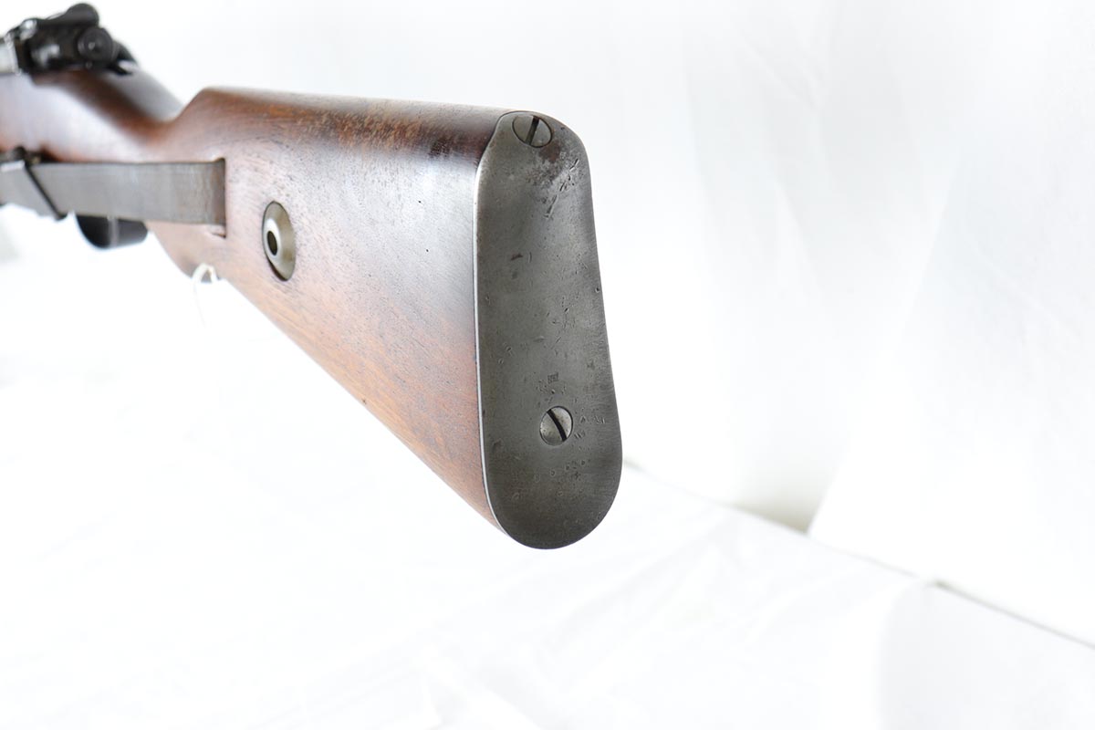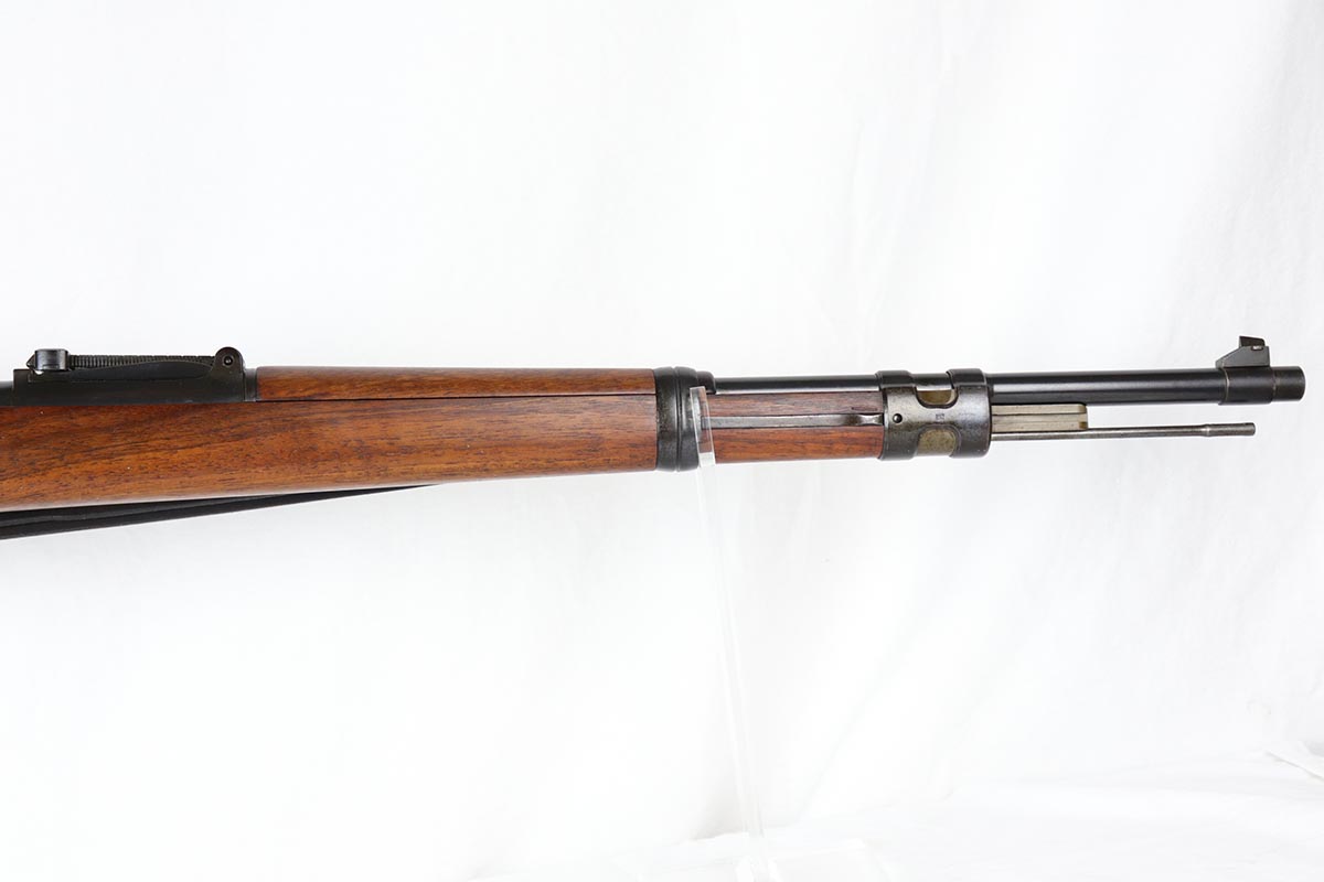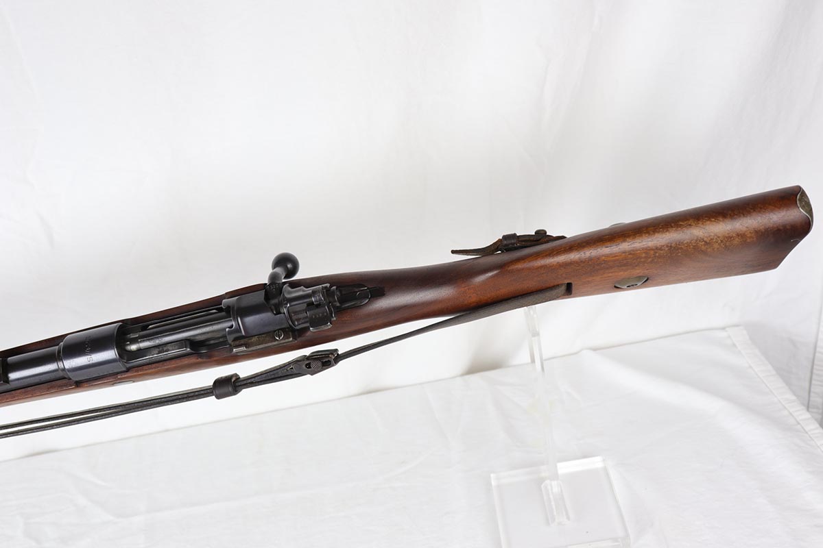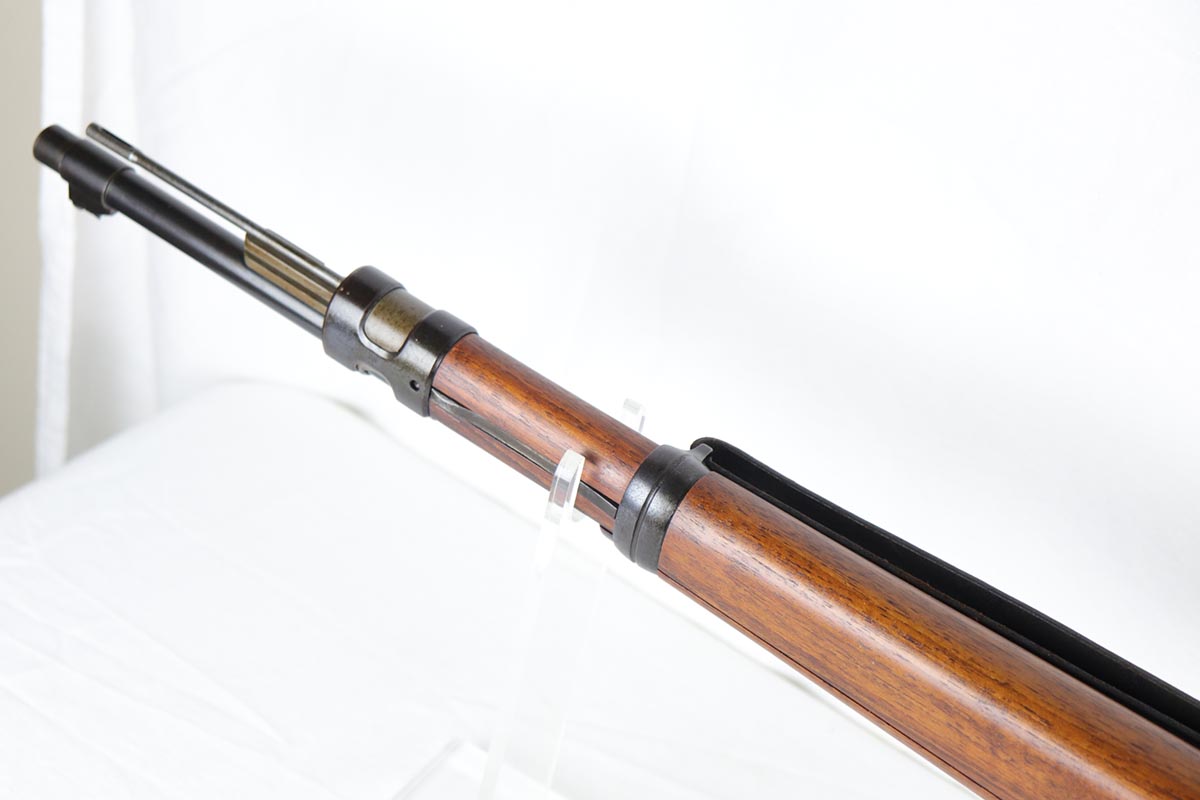 12/3/18 – This is a rare G Date Mauser K98, manufactured in 1935 and featuring all matching numbers and original finish. Introduced during the early years of the Nazi Party’s dominance of Germany, the code system was intended to obscure the scale and speed of German re-armament, and all correct G Date K98s are seldom available to the collector market. The original finish rates at about 96-98% with the majority of the finish loss on the bolt release and the left side lip of the receiver. The bayo lug and area under the front barrel band are ‘in the white’, a feature of these early rifles that helps to ensure original bluing. All numbered parts match the receiver, including the hand guard, as well as the stock (internally numbered) and butt plate. Stock is gorgeous but may have been lightly sanded. Loads of early acceptance proofs adorn this rifle as well. The sling well is marked with DRP which indicates (I believe) that it was issued to local militia while the German army was still hiding their actual numbers. Comes with an original sling and cleaning rod. Terrifc bore.