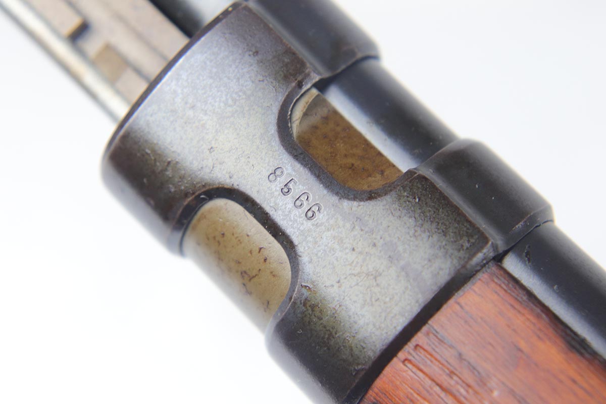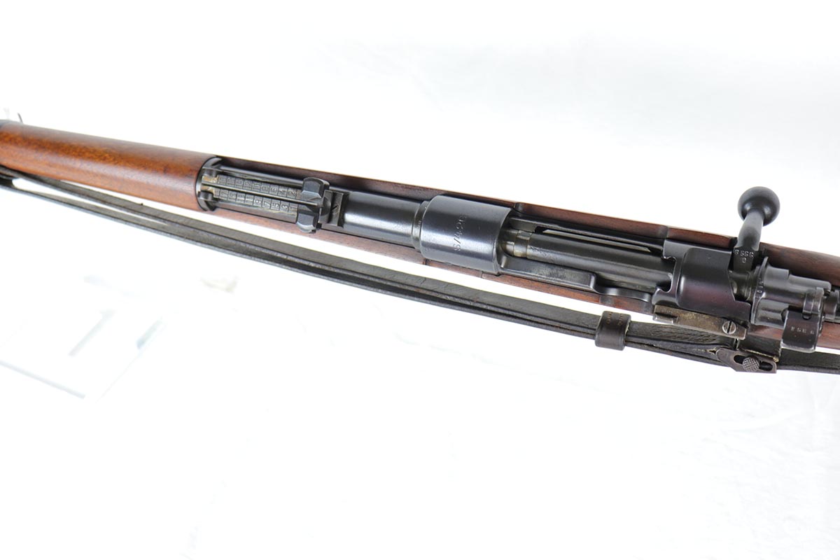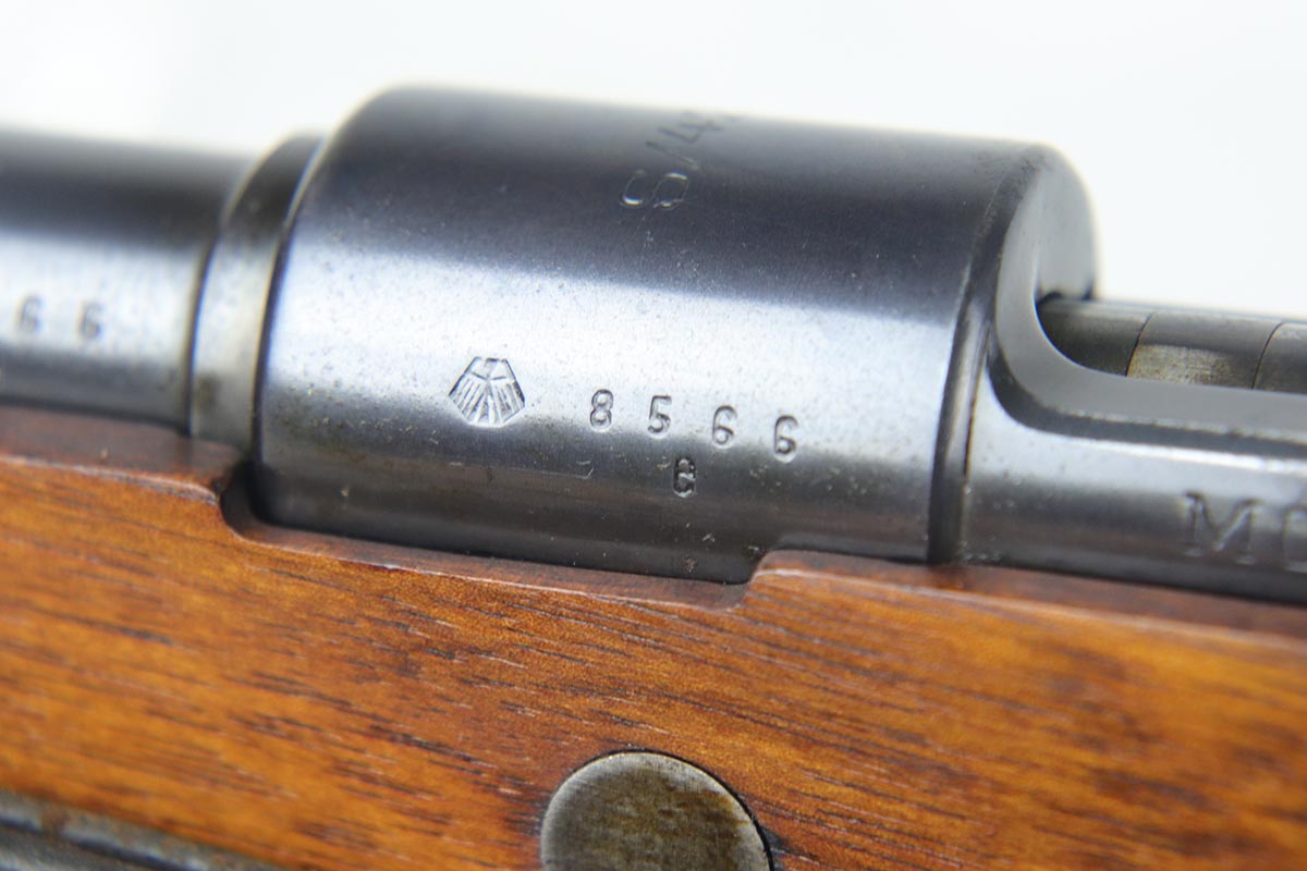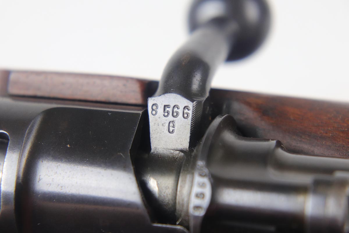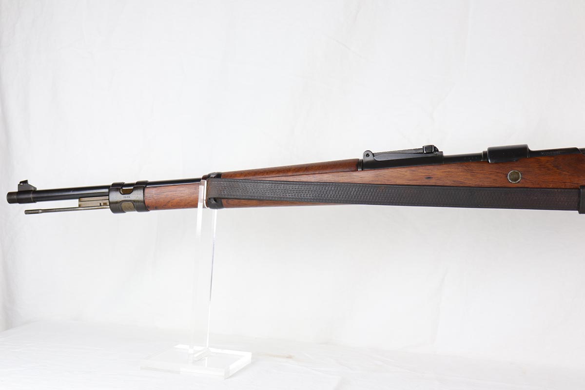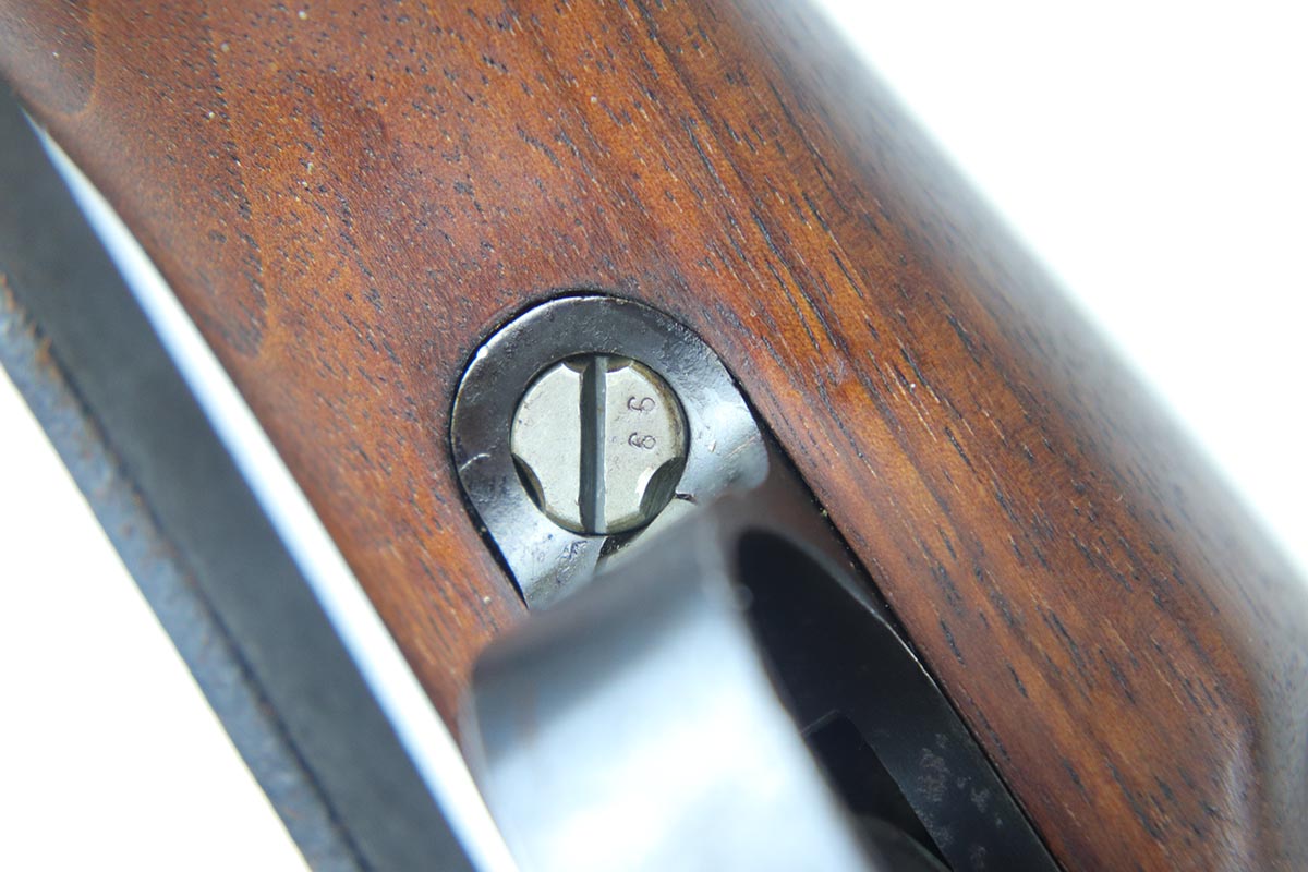 12/3/18 – This is a rare G Date Mauser K98, manufactured in 1935 and featuring all matching numbers and original finish. Introduced during the early years of the Nazi Party’s dominance of Germany, the code system was intended to obscure the scale and speed of German re-armament, and all correct G Date K98s are seldom available to the collector market. The original finish rates at about 96-98% with the majority of the finish loss on the bolt release and the left side lip of the receiver. The bayo lug and area under the front barrel band are ‘in the white’, a feature of these early rifles that helps to ensure original bluing. All numbered parts match the receiver, including the hand guard, as well as the stock (internally numbered) and butt plate. Stock is gorgeous but may have been lightly sanded. Loads of early acceptance proofs adorn this rifle as well. The sling well is marked with DRP which indicates (I believe) that it was issued to local militia while the German army was still hiding their actual numbers. Comes with an original sling and cleaning rod. Terrifc bore.