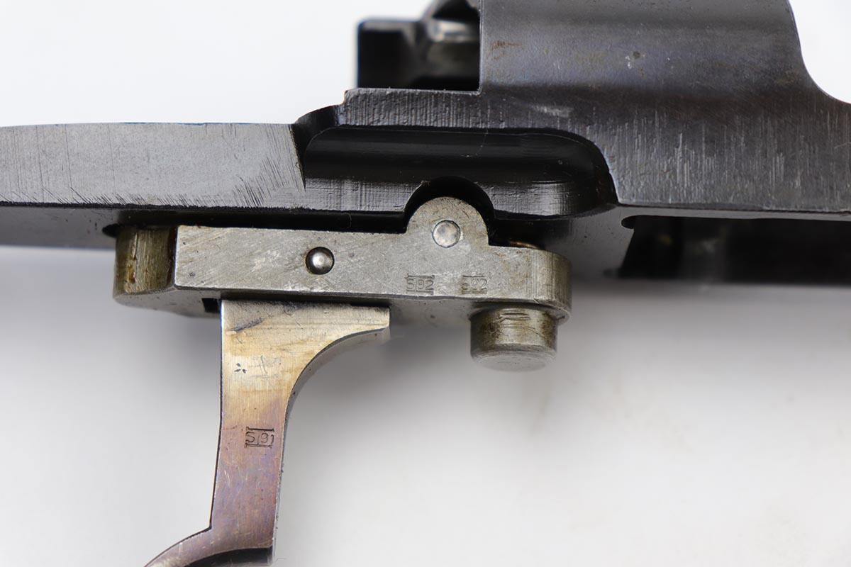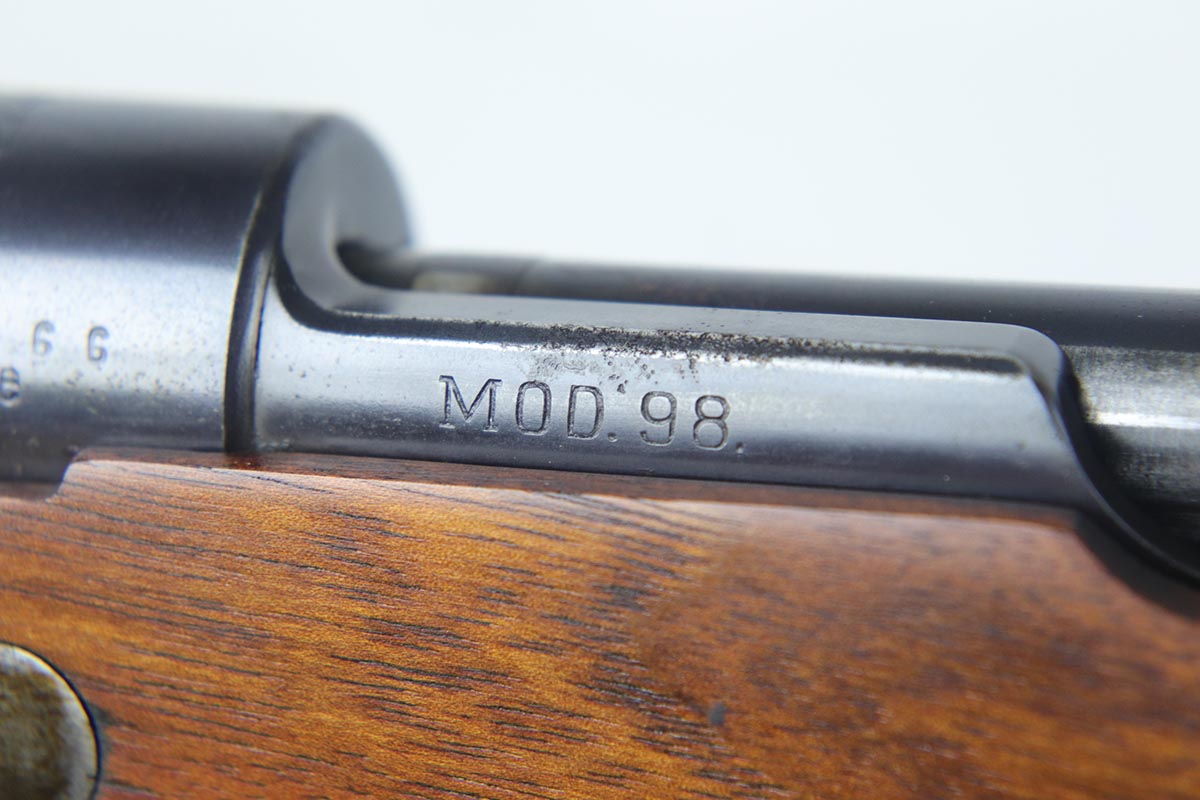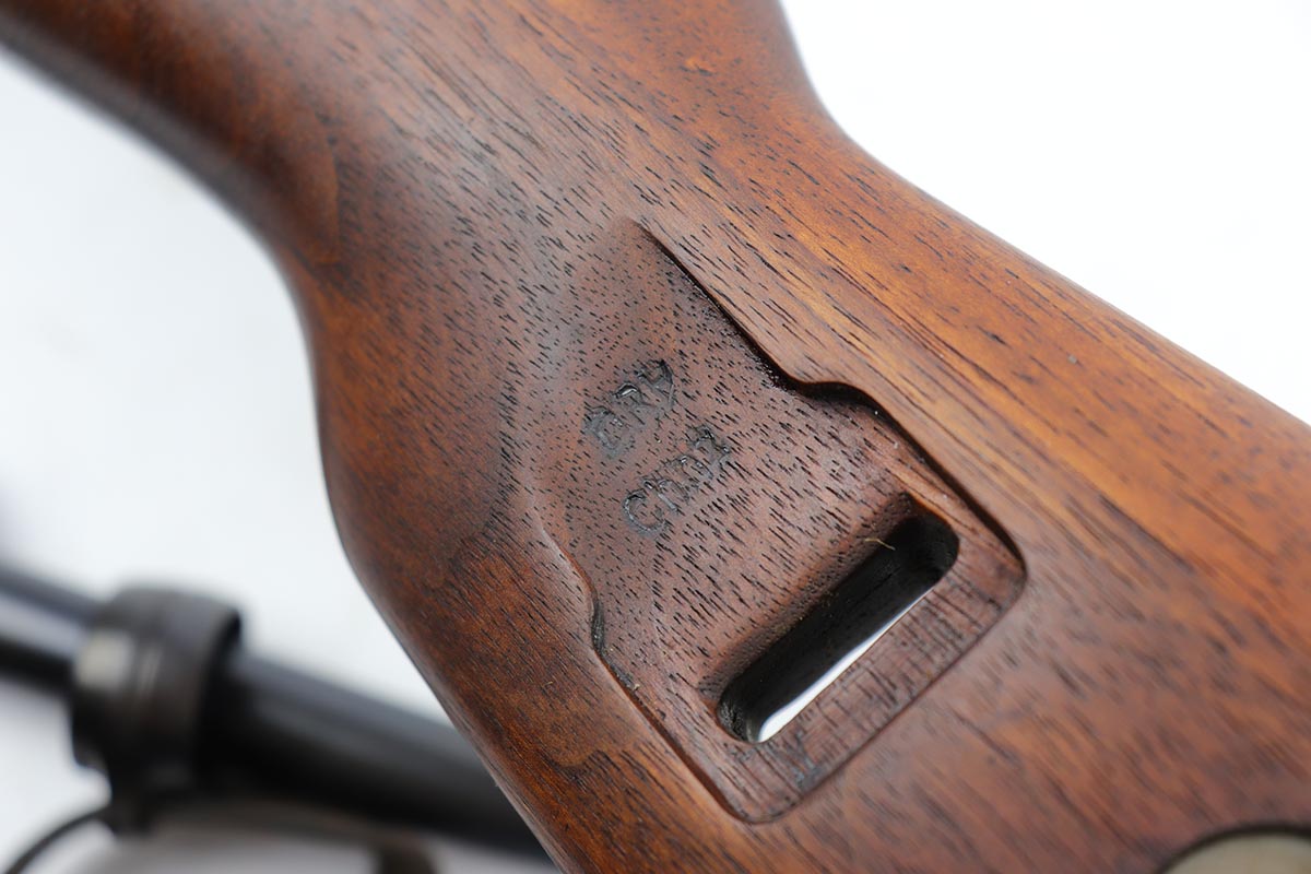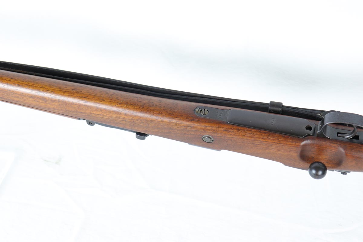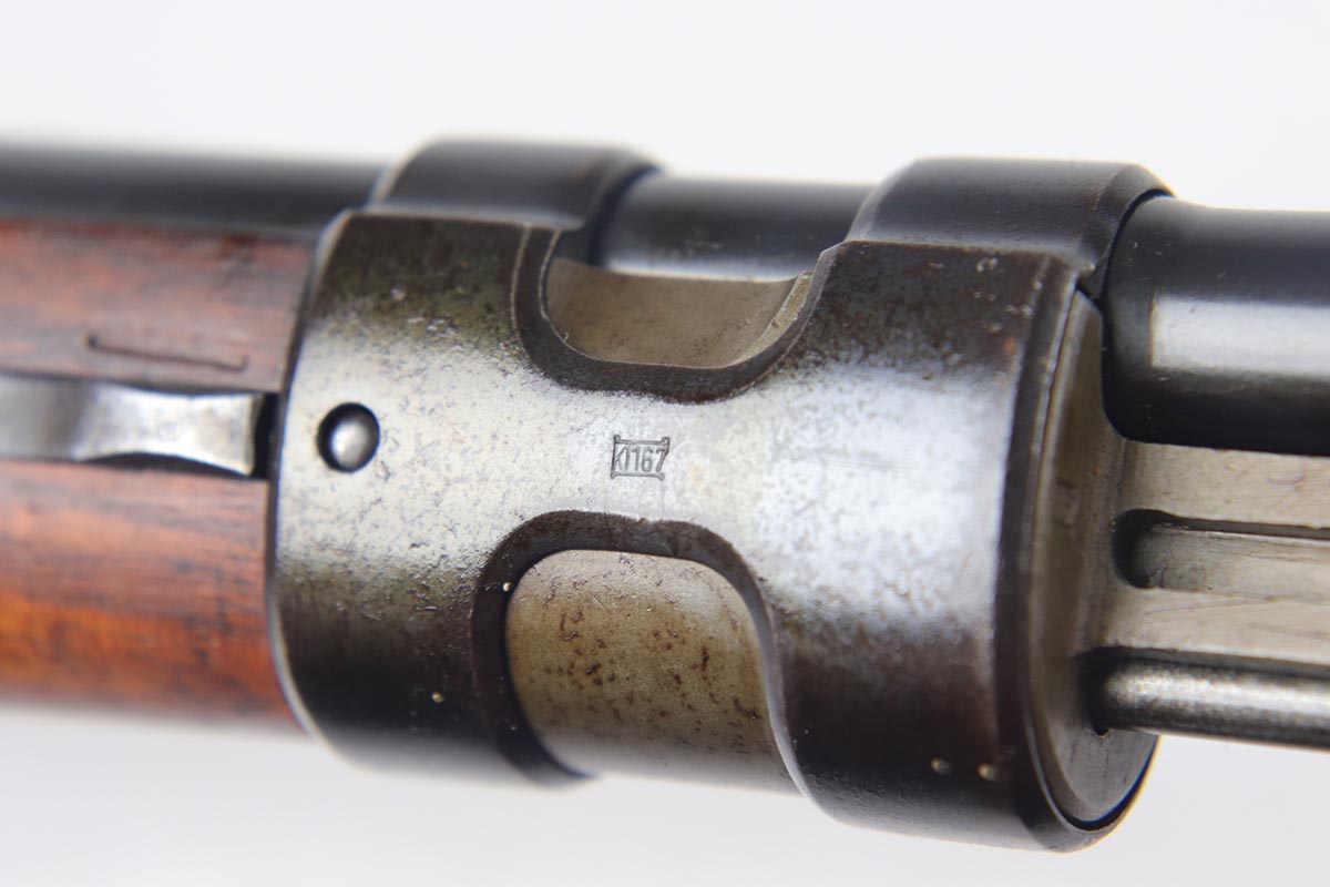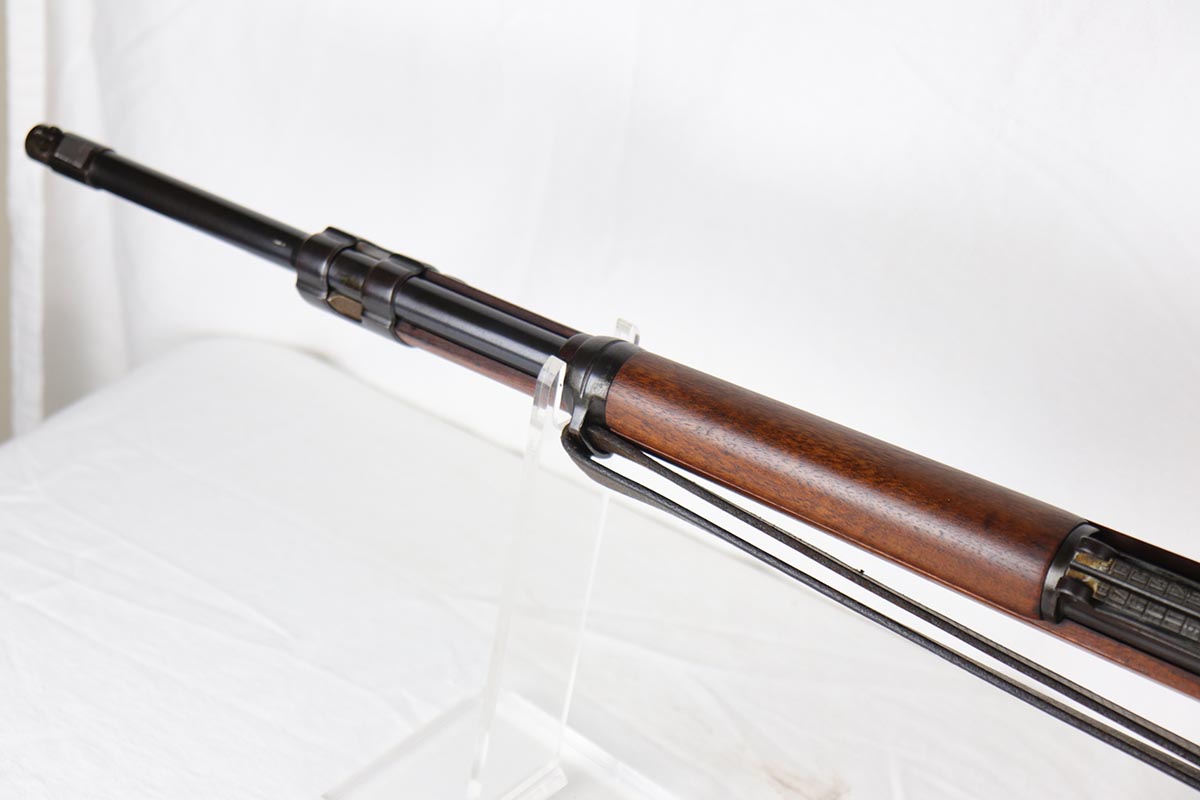 12/3/18 – This is a rare G Date Mauser K98, manufactured in 1935 and featuring all matching numbers and original finish. Introduced during the early years of the Nazi Party’s dominance of Germany, the code system was intended to obscure the scale and speed of German re-armament, and all correct G Date K98s are seldom available to the collector market. The original finish rates at about 96-98% with the majority of the finish loss on the bolt release and the left side lip of the receiver. The bayo lug and area under the front barrel band are ‘in the white’, a feature of these early rifles that helps to ensure original bluing. All numbered parts match the receiver, including the hand guard, as well as the stock (internally numbered) and butt plate. Stock is gorgeous but may have been lightly sanded. Loads of early acceptance proofs adorn this rifle as well. The sling well is marked with DRP which indicates (I believe) that it was issued to local militia while the German army was still hiding their actual numbers. Comes with an original sling and cleaning rod. Terrifc bore.