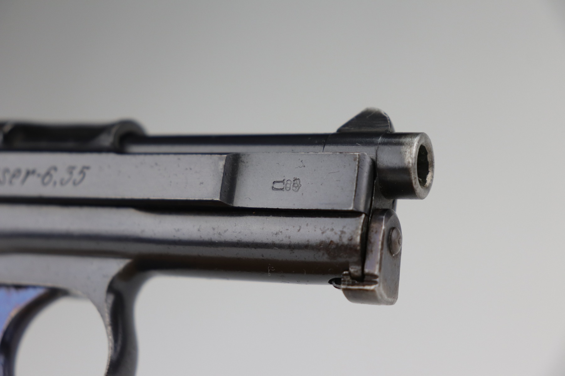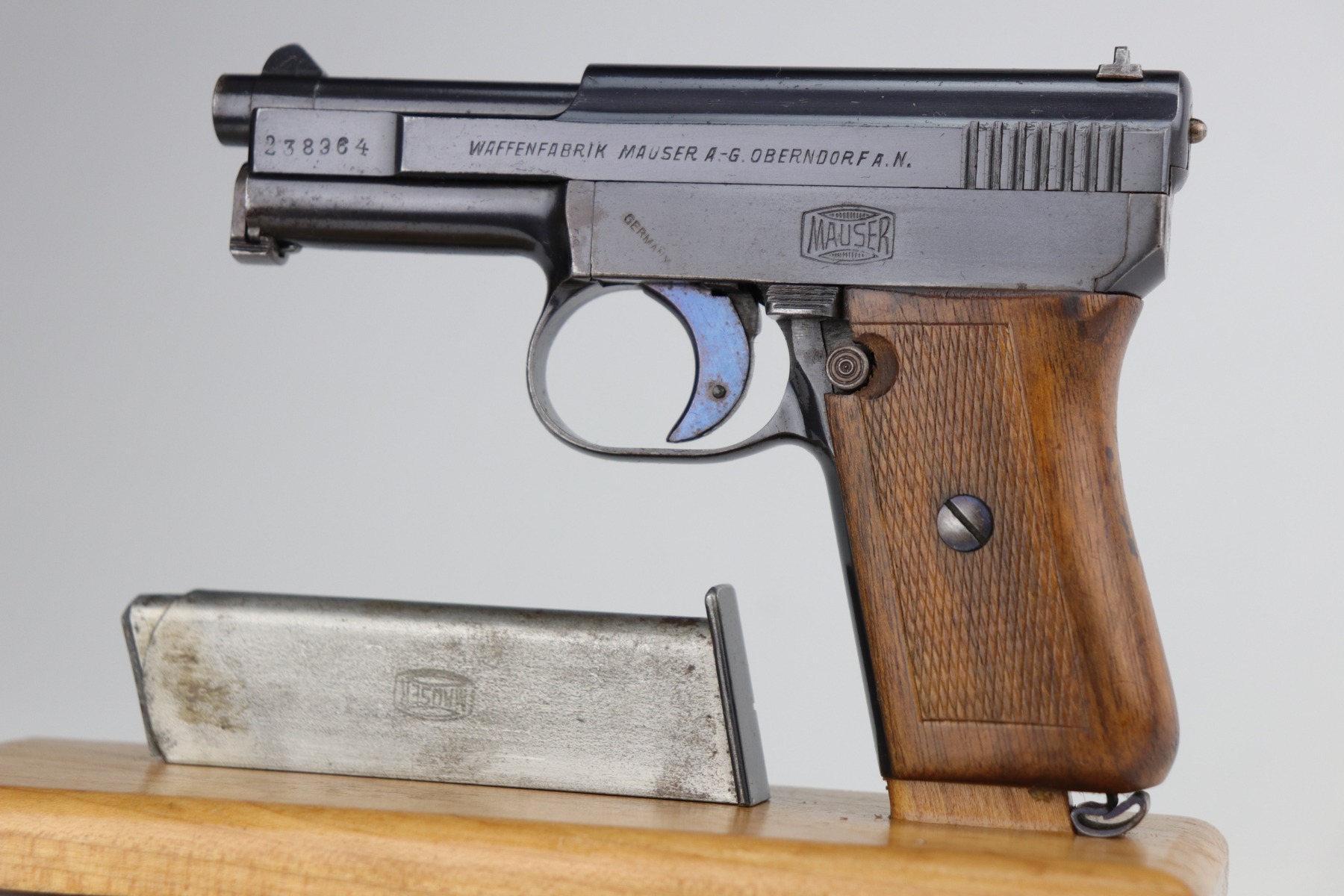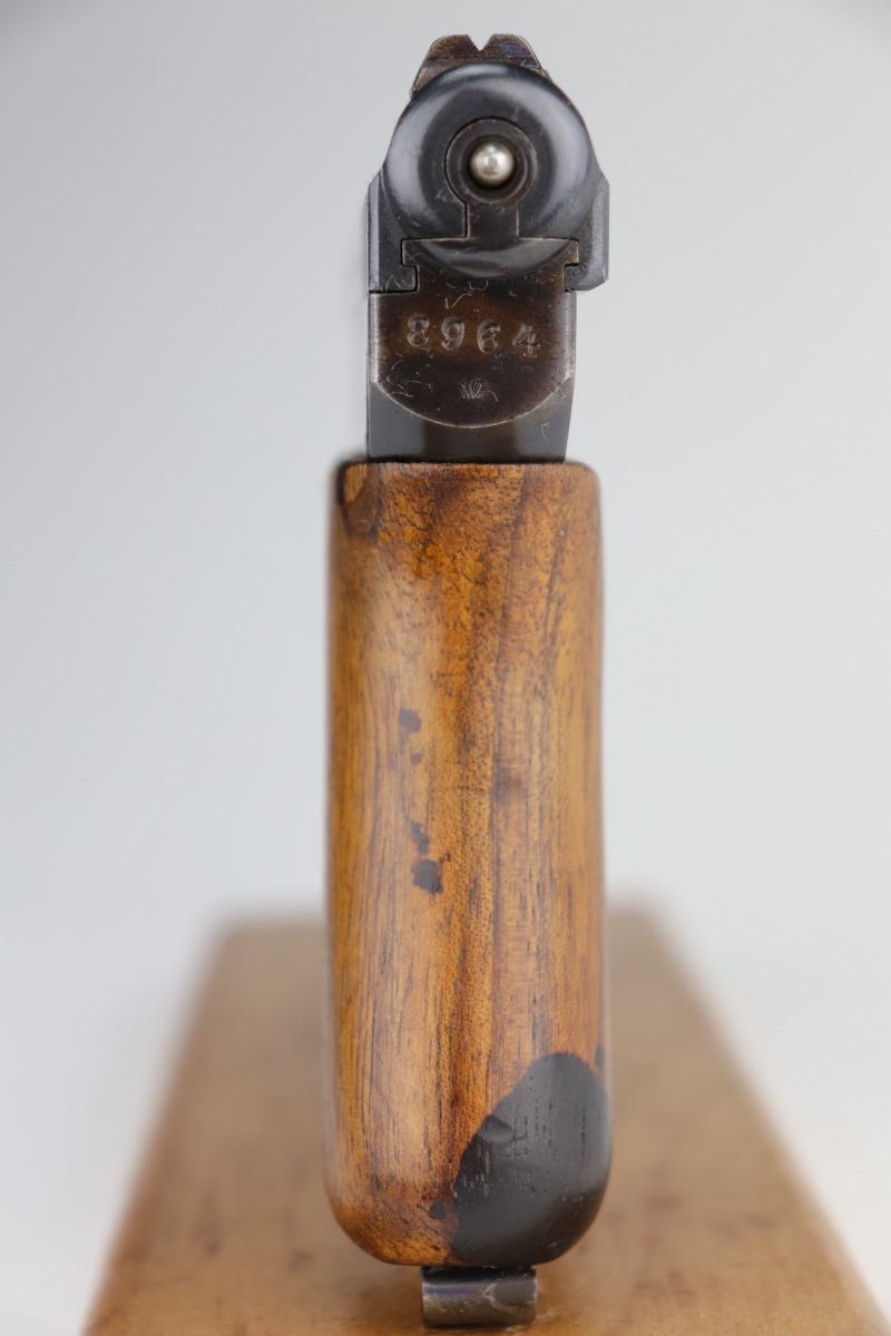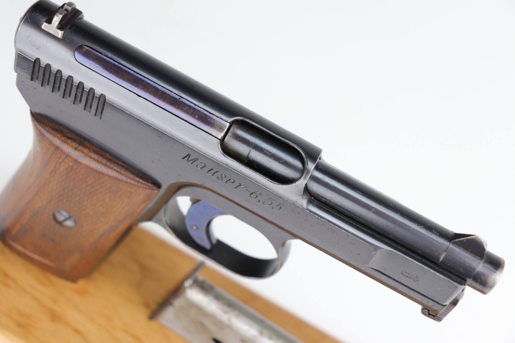 1/15/21 – This is a minty example of a Mauser Model 1910. It is all matching and has the proper “Crown U” proof. It has a “Germany” export mark on the left side of the frame, indicating it was meant for export to the international commercial market. It has retained more than 98% of its original bluing. The fire blue is still in tact. Just very minor wear around the muzzle. While there is very little finish loss, there are small areas of spotty oxidation. It comes with an excellent wood grip and a period-correct magazine – the grip has a few dark stains. The bore is very nice – shiny with good rifling.