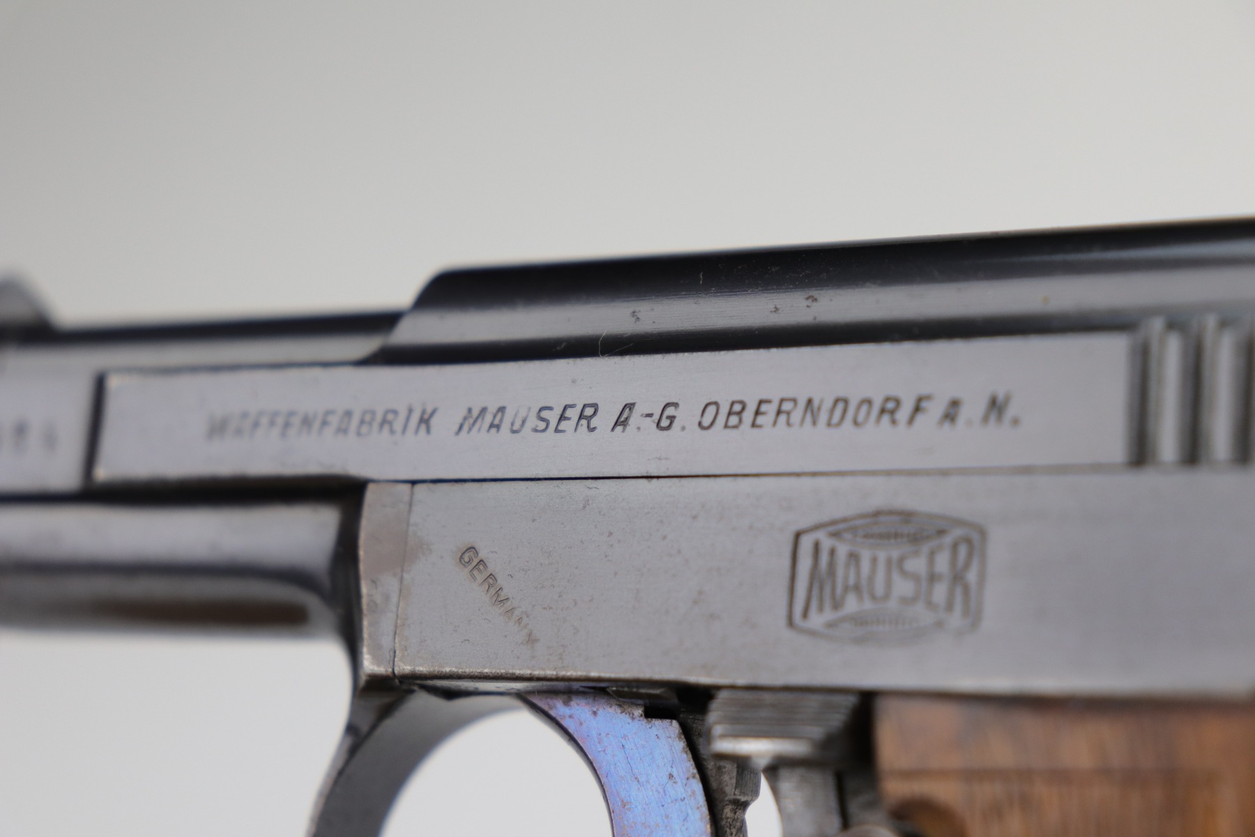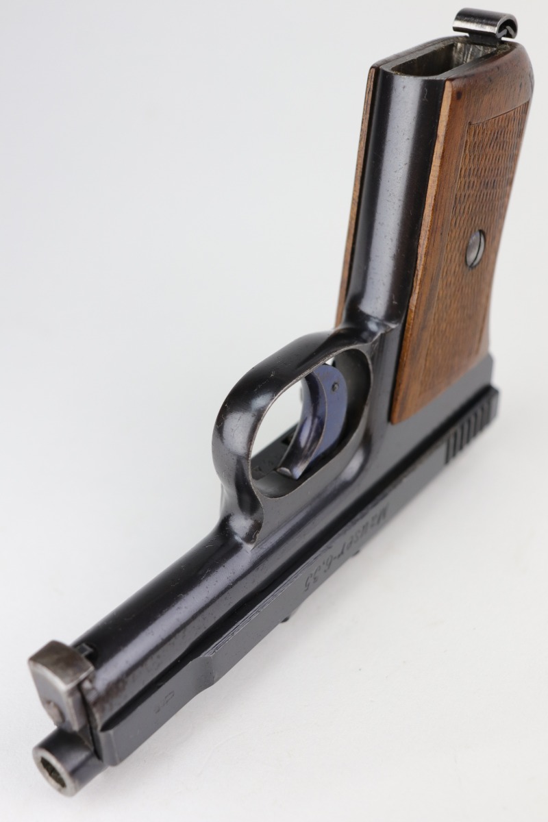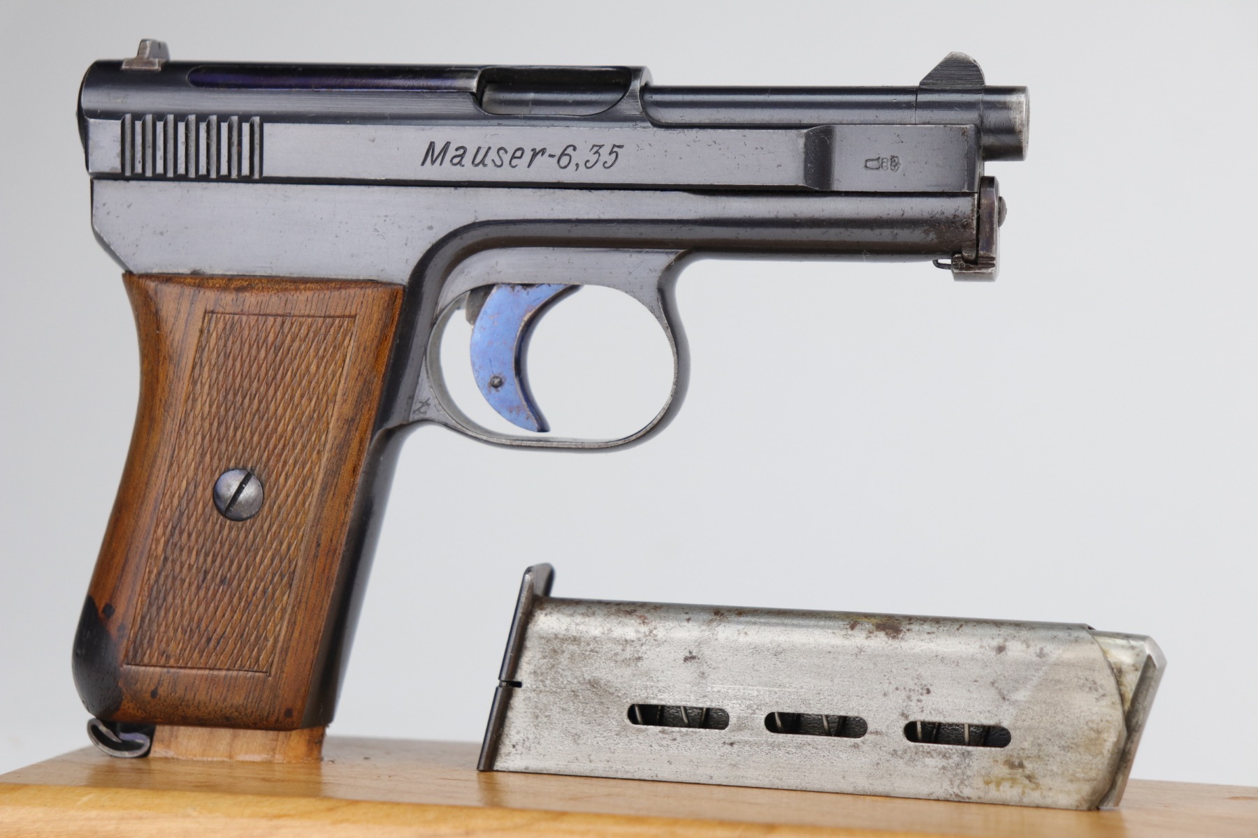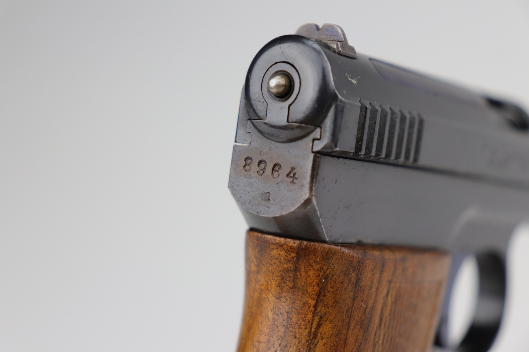 1/15/21 – This is a minty example of a Mauser Model 1910. It is all matching and has the proper “Crown U” proof. It has a “Germany” export mark on the left side of the frame, indicating it was meant for export to the international commercial market. It has retained more than 98% of its original bluing. The fire blue is still in tact. Just very minor wear around the muzzle. While there is very little finish loss, there are small areas of spotty oxidation. It comes with an excellent wood grip and a period-correct magazine – the grip has a few dark stains. The bore is very nice – shiny with good rifling.