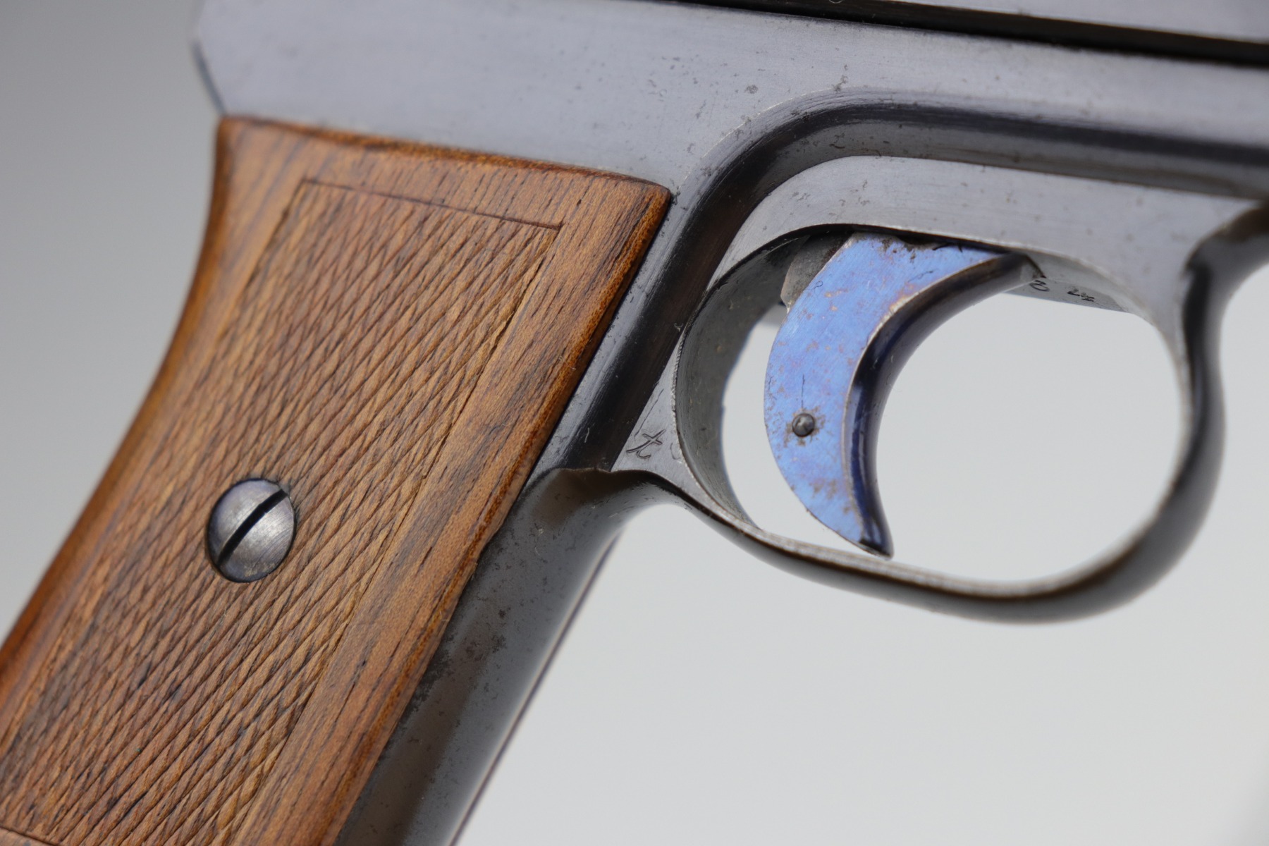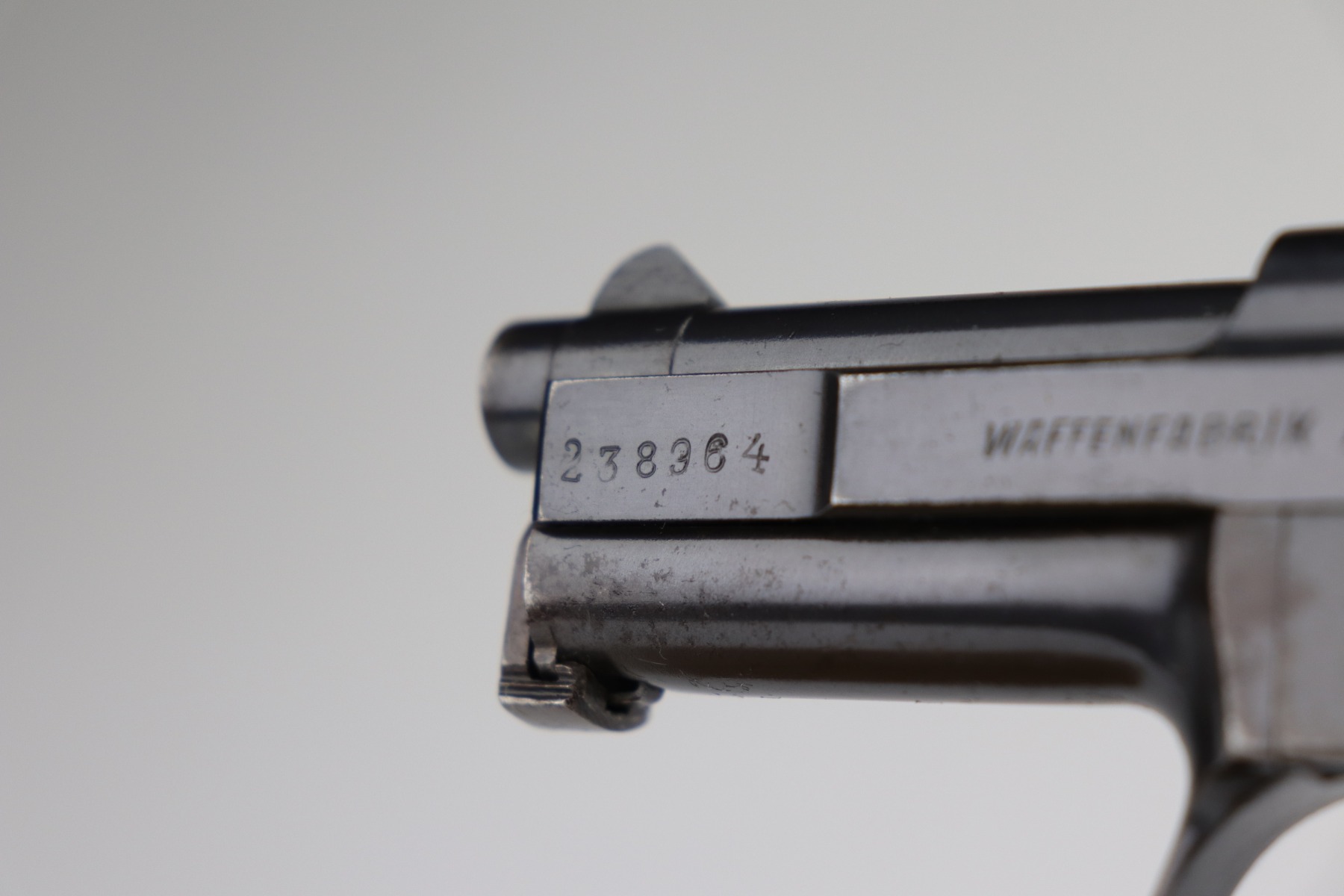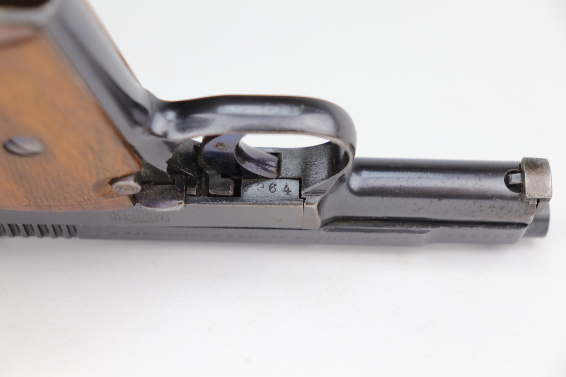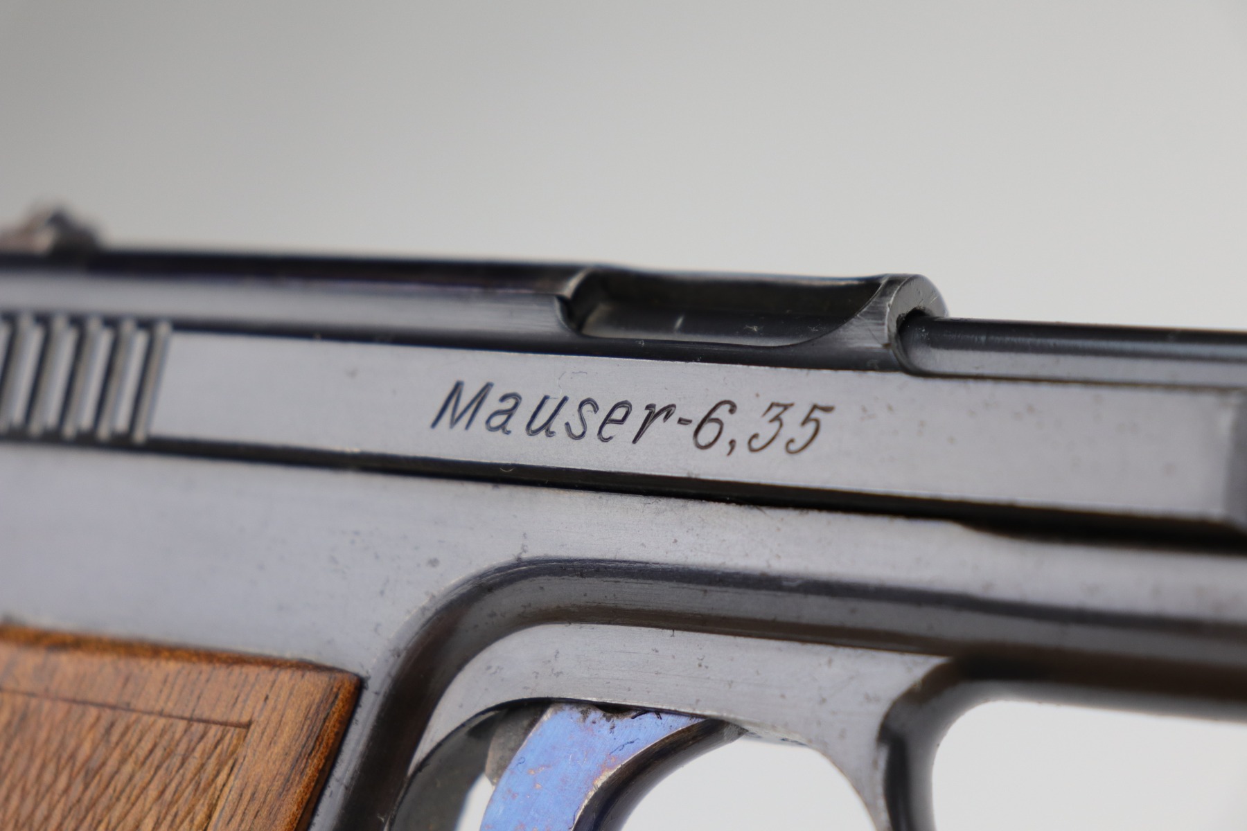 1/15/21 – This is a minty example of a Mauser Model 1910. It is all matching and has the proper “Crown U” proof. It has a “Germany” export mark on the left side of the frame, indicating it was meant for export to the international commercial market. It has retained more than 98% of its original bluing. The fire blue is still in tact. Just very minor wear around the muzzle. While there is very little finish loss, there are small areas of spotty oxidation. It comes with an excellent wood grip and a period-correct magazine – the grip has a few dark stains. The bore is very nice – shiny with good rifling.