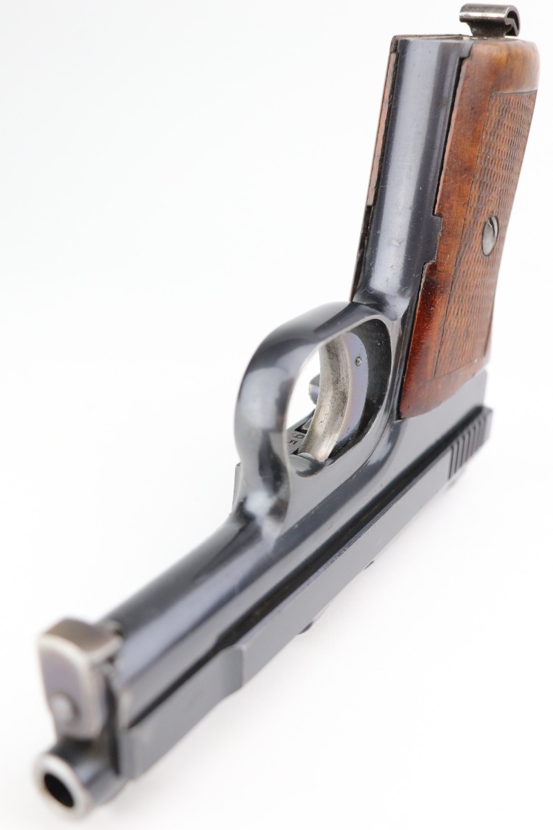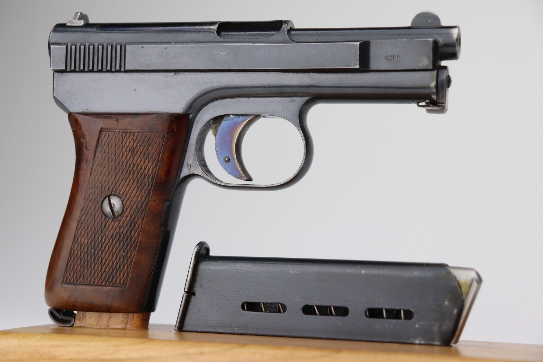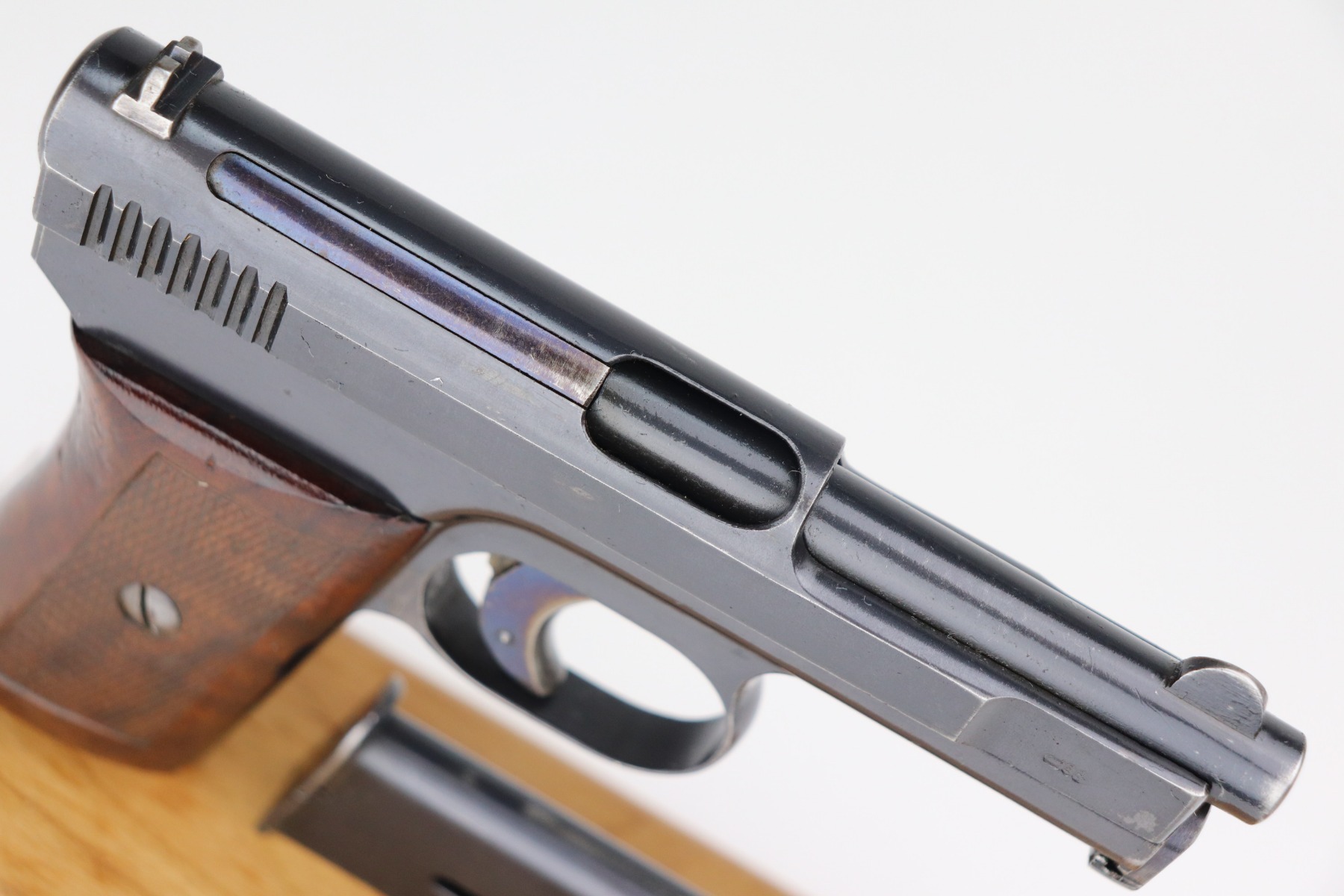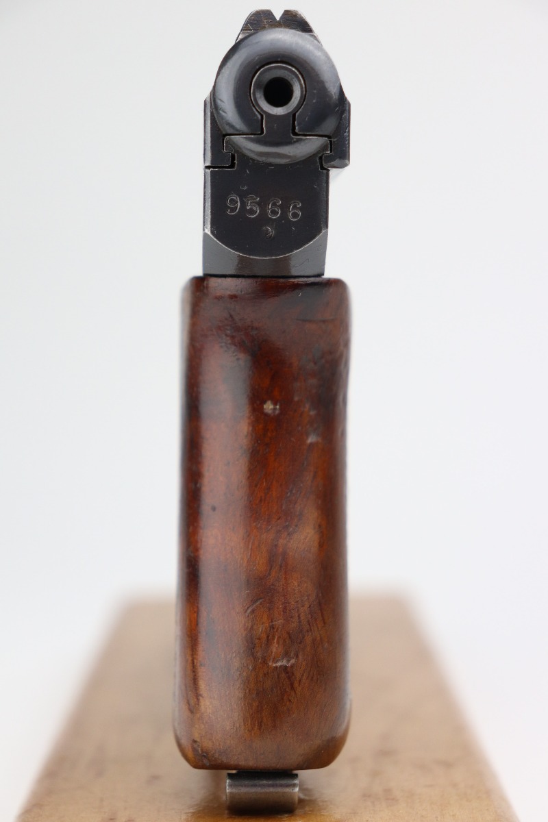 2/8/21 – This is a minty example of a Mauser Model 1910. It is all matching and has a “Crown U” proof. There is minor muzzle and high edge wear and a few small dots of wear here and there. It comes with an excellent wood grip and a period-correct magazine. The bore is mint. The fire-bluing is still in tact on the trigger.