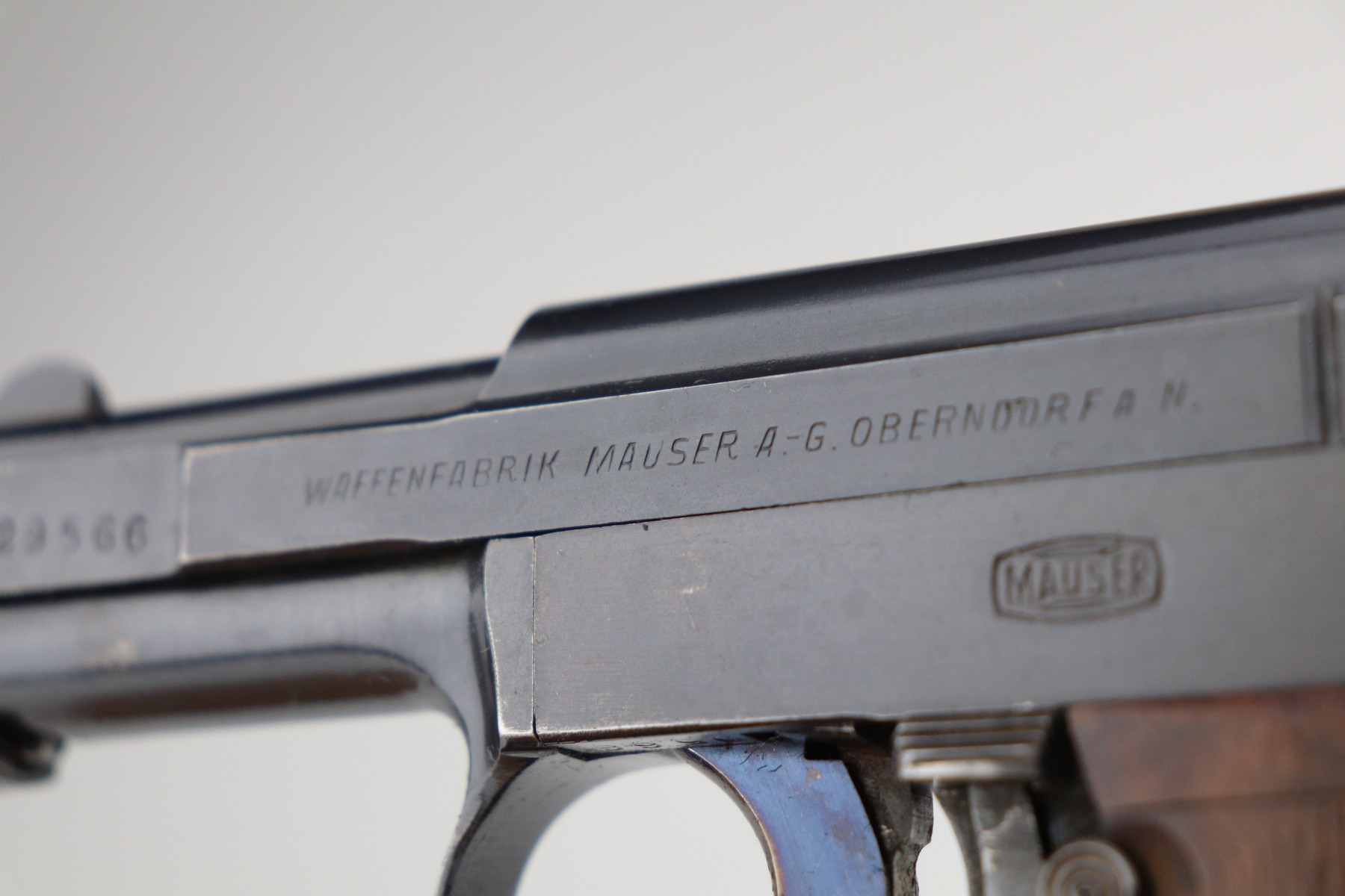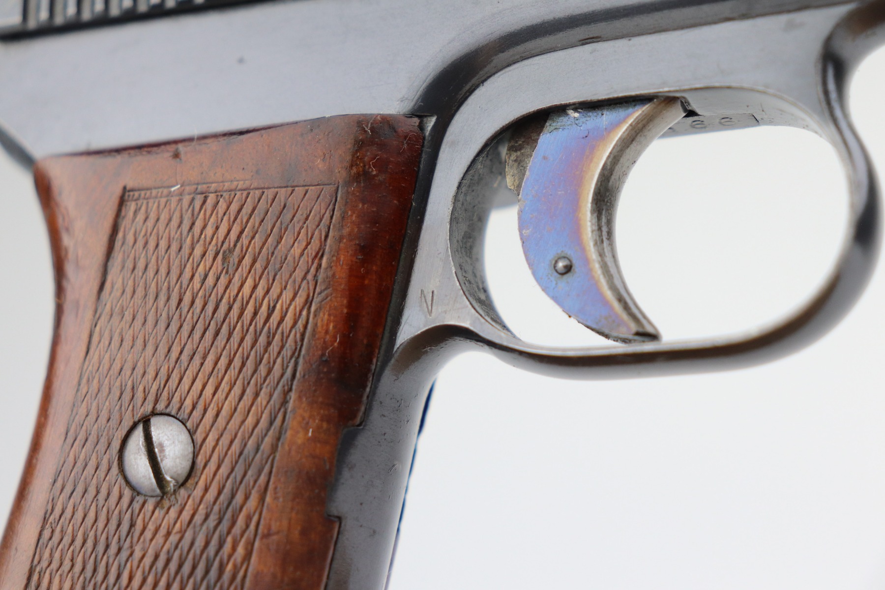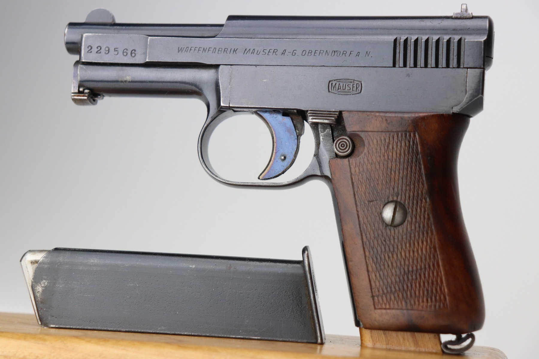 2/8/21 – This is a minty example of a Mauser Model 1910. It is all matching and has a “Crown U” proof. There is minor muzzle and high edge wear and a few small dots of wear here and there. It comes with an excellent wood grip and a period-correct magazine. The bore is mint. The fire-bluing is still in tact on the trigger.