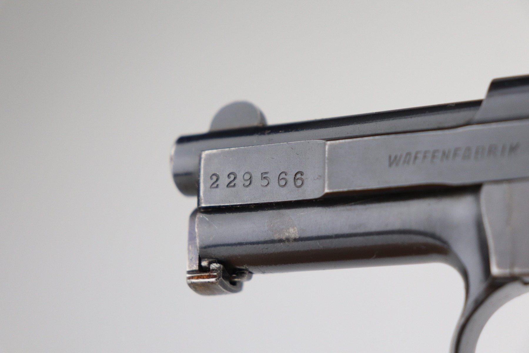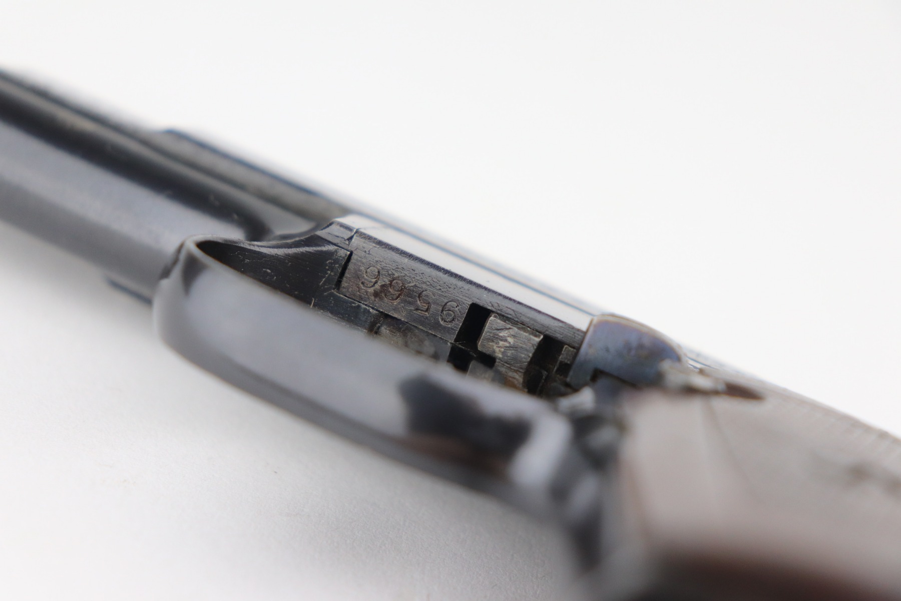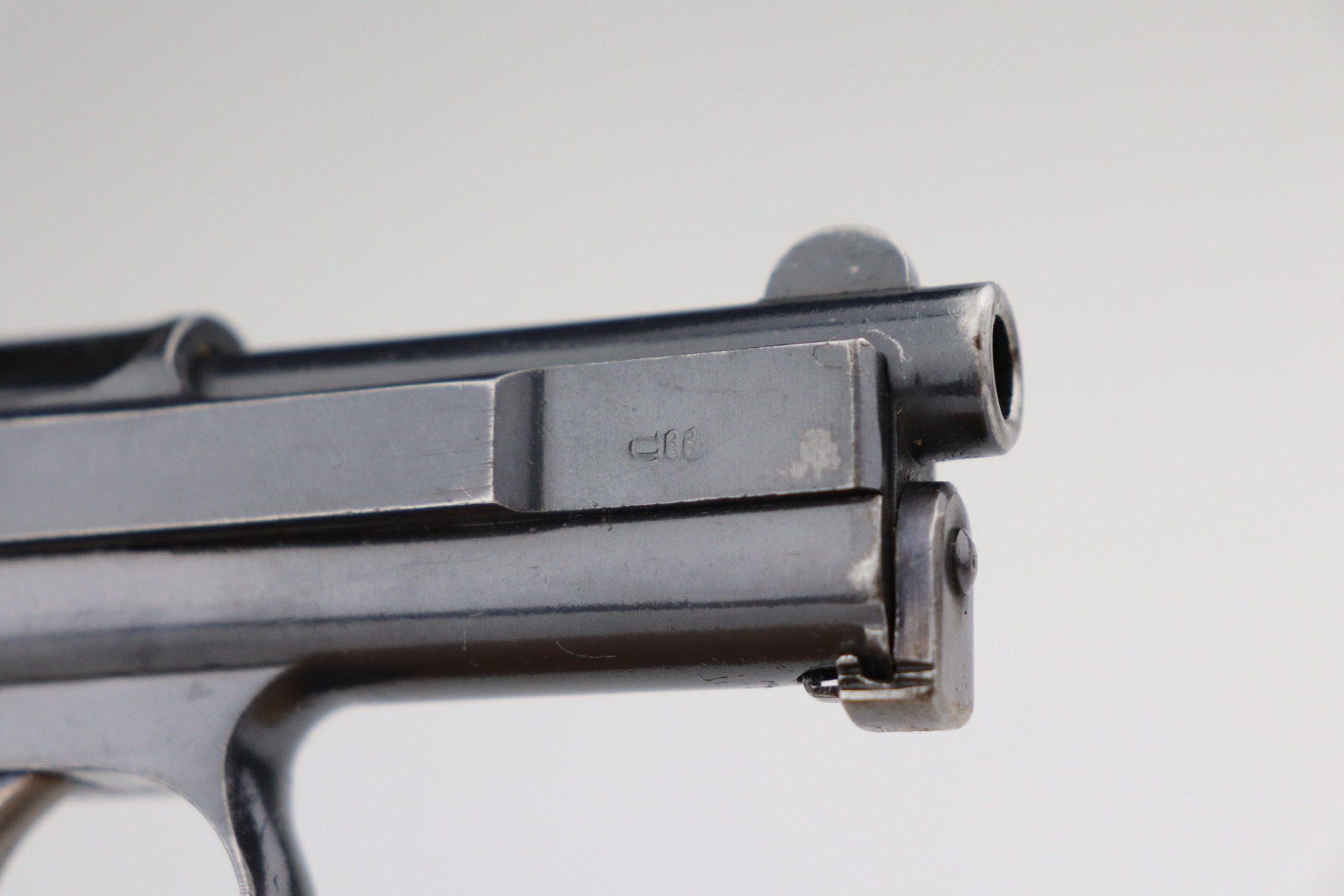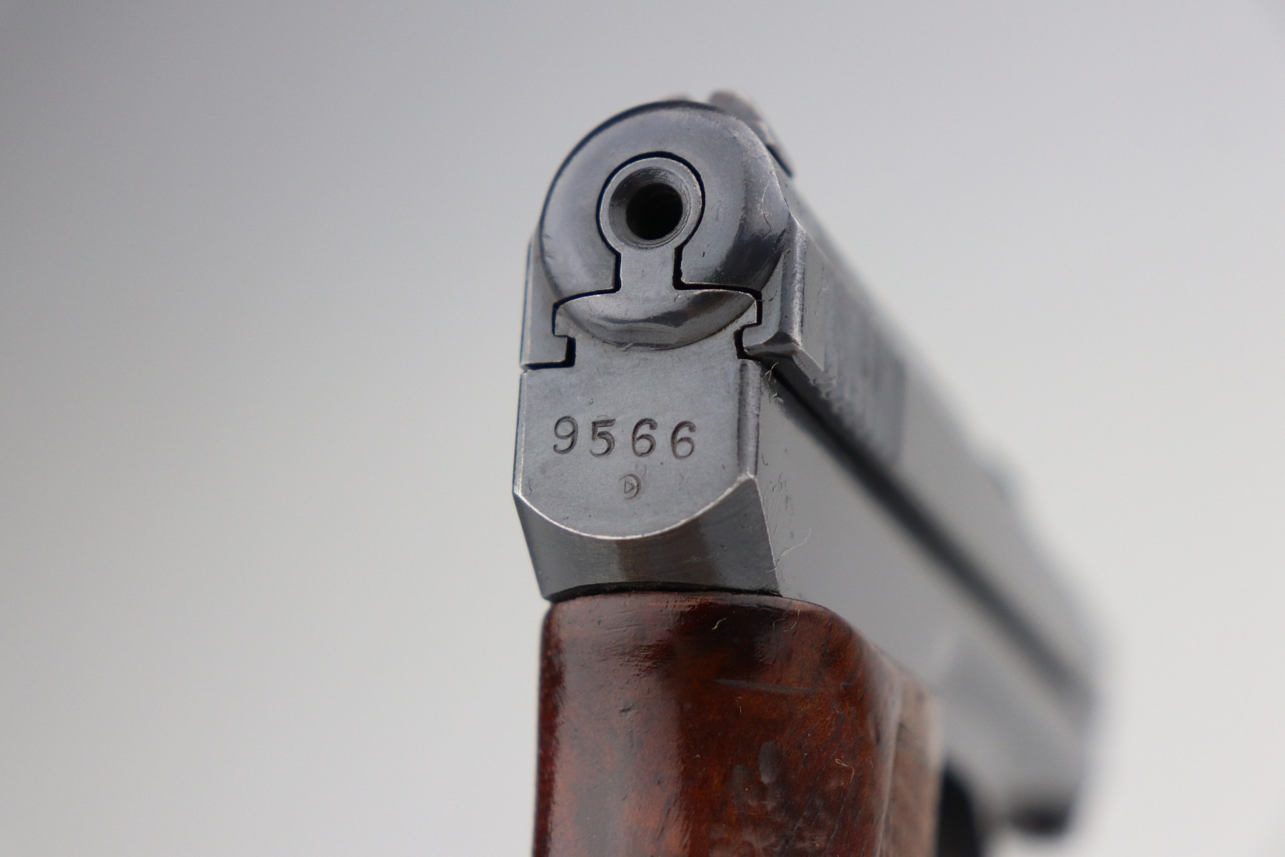 2/8/21 – This is a minty example of a Mauser Model 1910. It is all matching and has a “Crown U” proof. There is minor muzzle and high edge wear and a few small dots of wear here and there. It comes with an excellent wood grip and a period-correct magazine. The bore is mint. The fire-bluing is still in tact on the trigger.