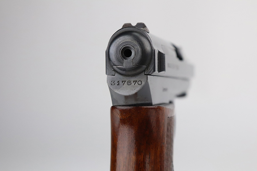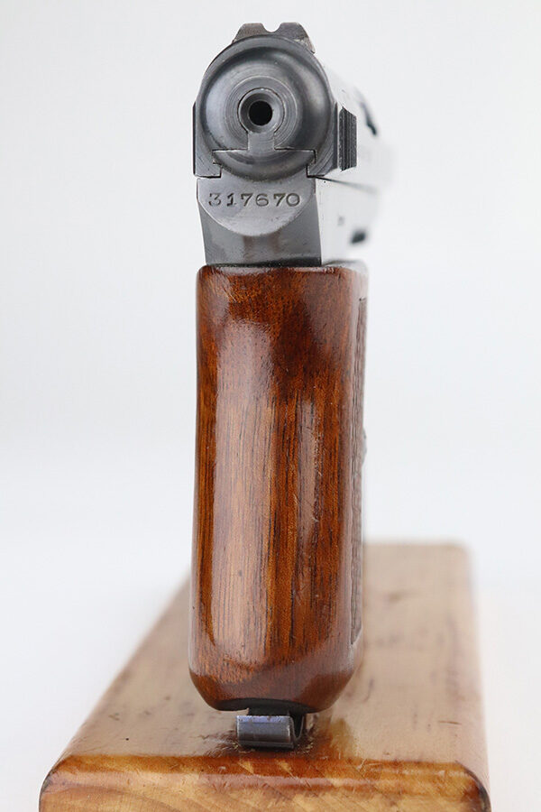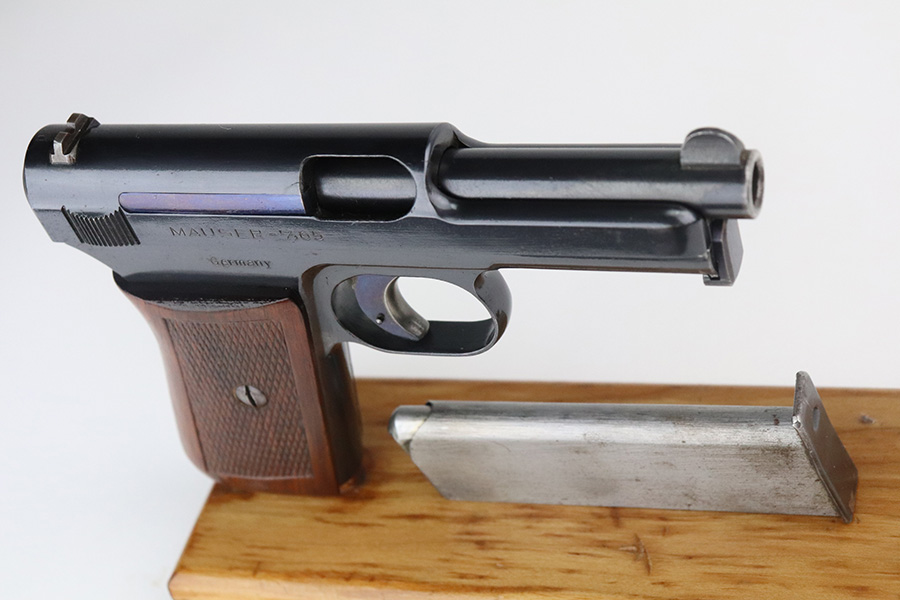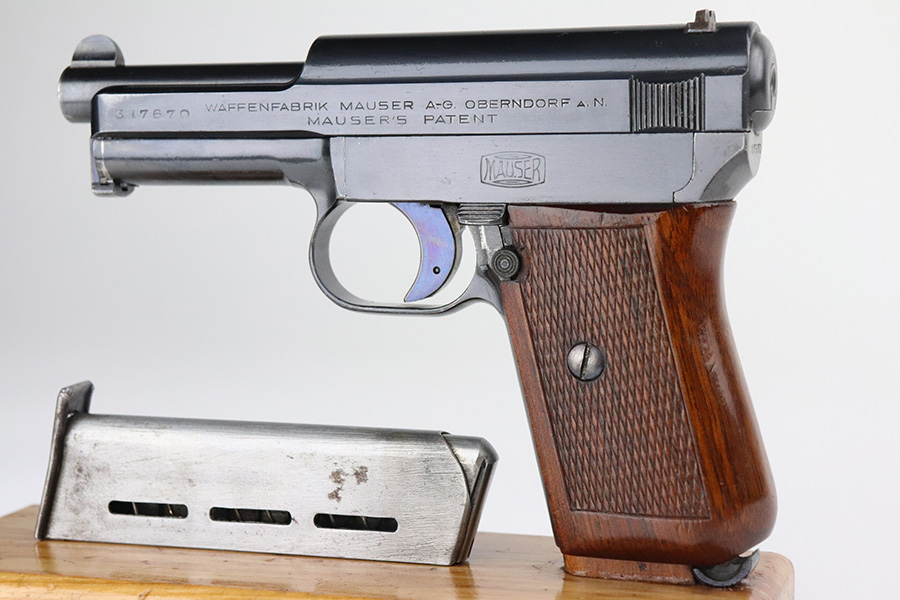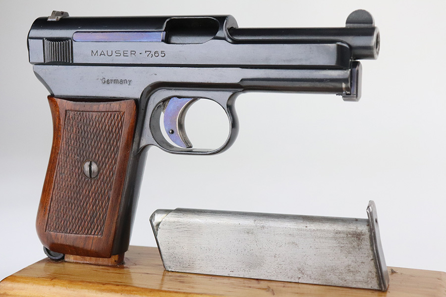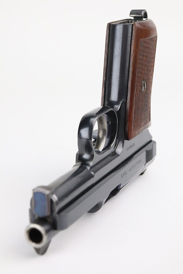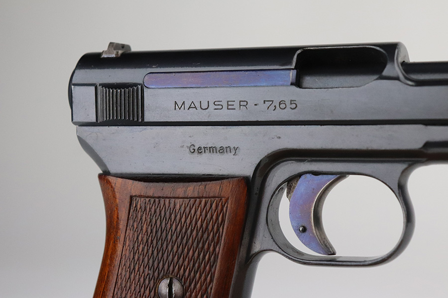 7/27/21 – This is a minty example of a Mauser Model 1914 sold in the commercial market in the 1920’s. The gun is all matching and has the proper commercial “Crown U” proofs. There is a “Germany” export proof on the right side of the frame, indicating it was intended for international sale. It is in beautiful condition, retaining about 98% of its original finish. The fire blue on the trigger is excellent. There is very minor somewhat scratchy wear and tiny pin-pricking on the front strap. Very minor wear at the front edges of the slide and around the muzzle. A few tiny dots of oxidation here and there. Comes with an excellent grip and a period-correct magazine. Excellent bore with strong rifling and very minor freckling in the grooves.