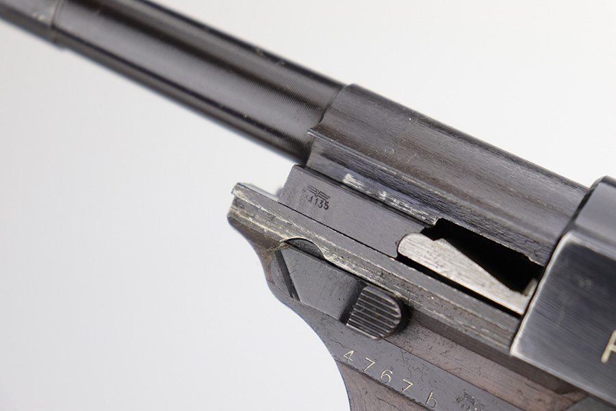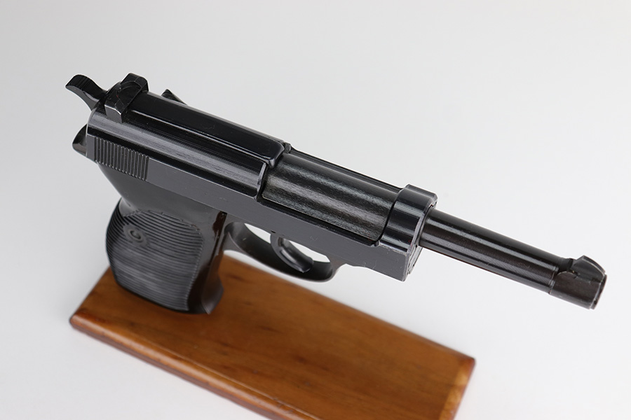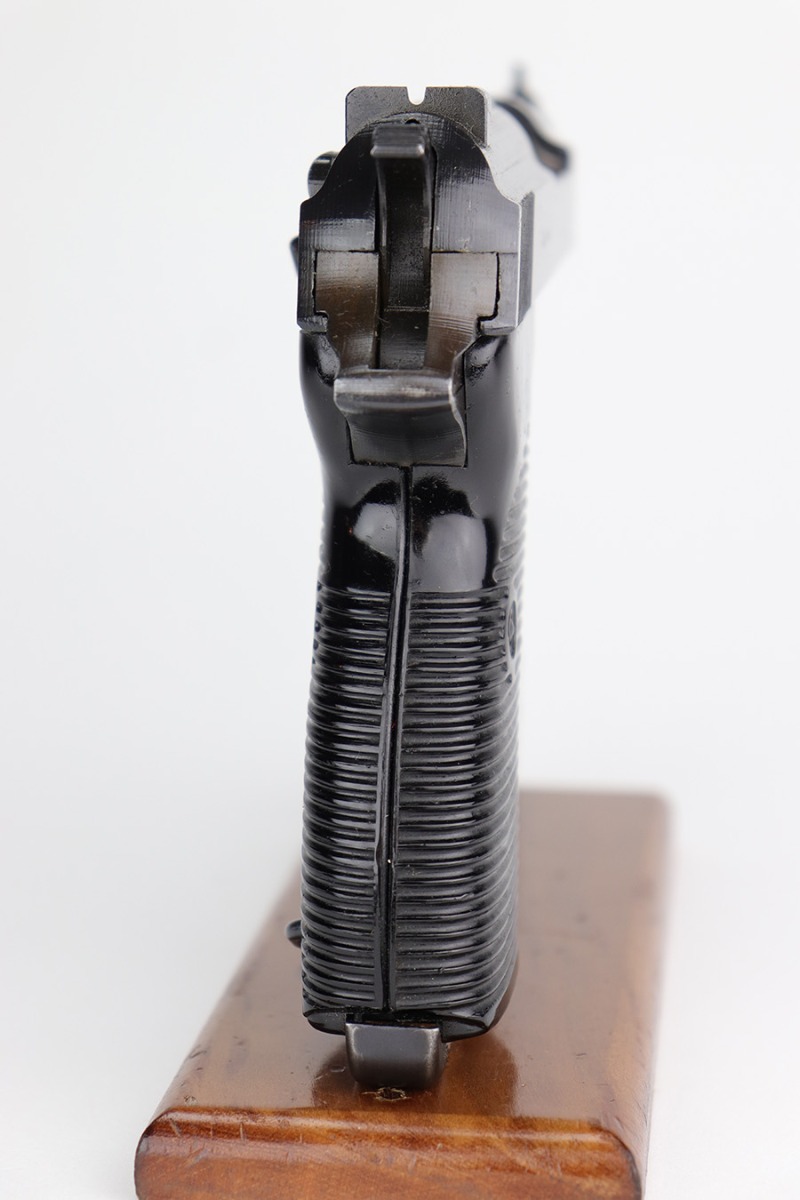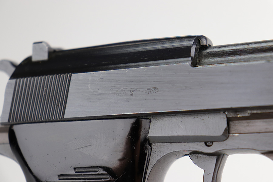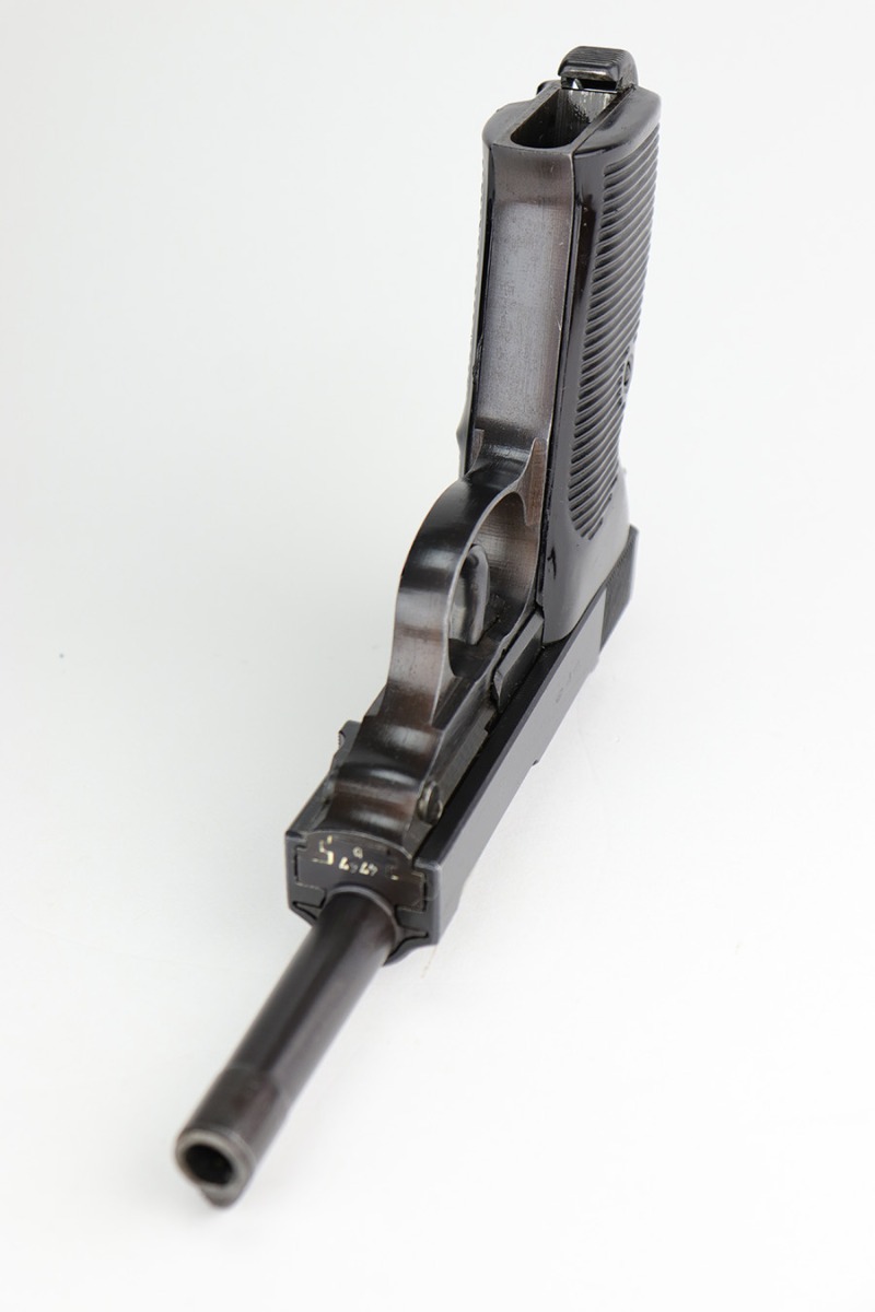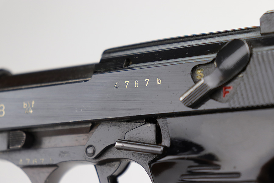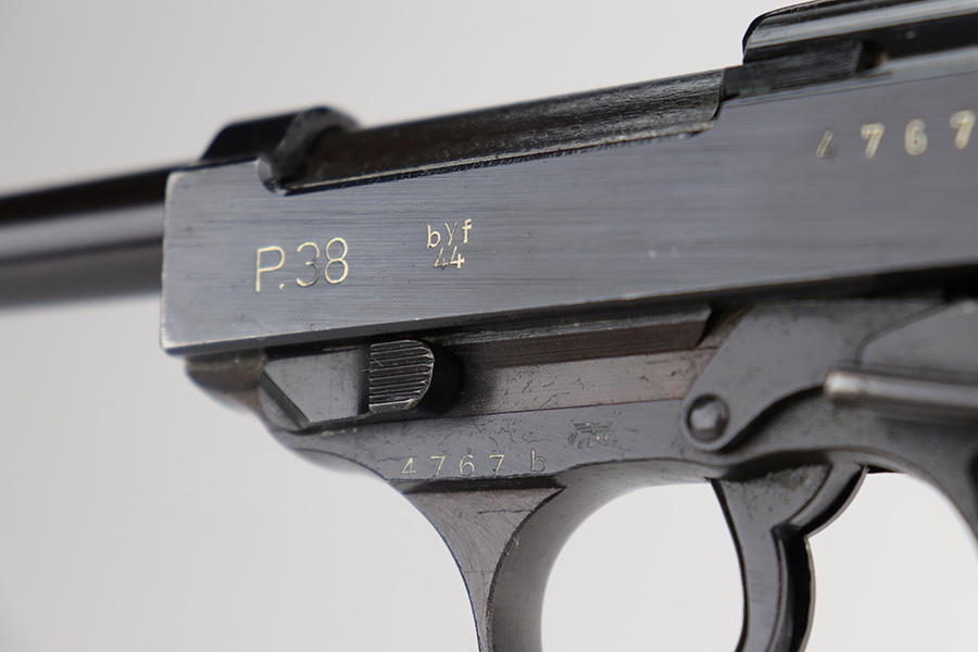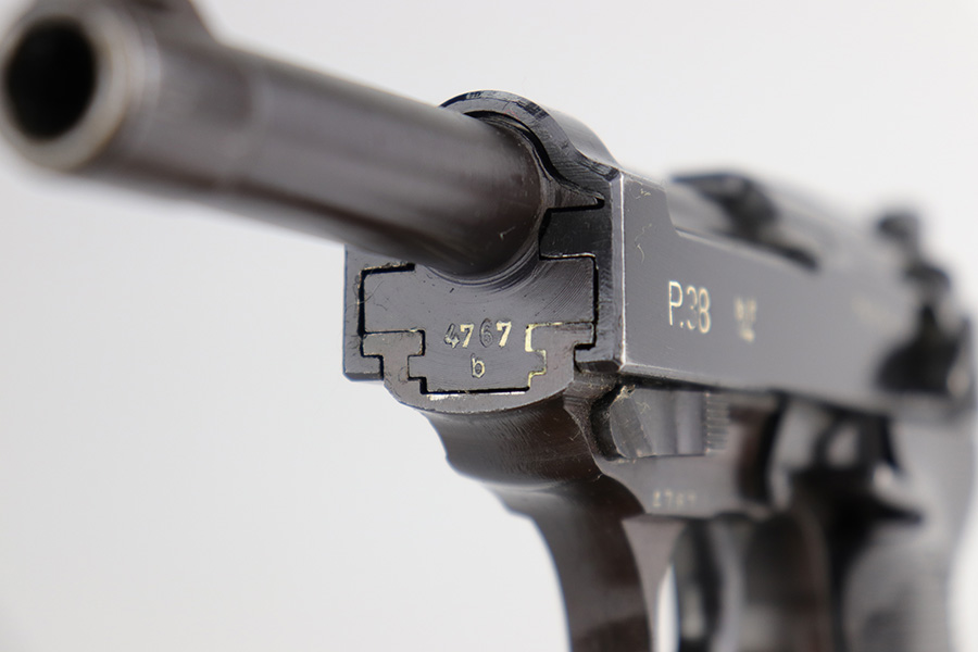 12/23/22 – This is a near-mint Mauser P.38 from December on 1944. All matching and original with just a hint of muzzle wear and high edge wear on slide. Mint bore and excellent grips. Walther mag. Good mechanics, including de-cocker.